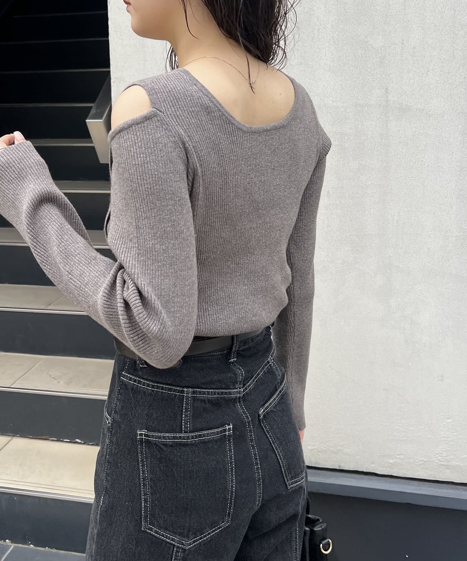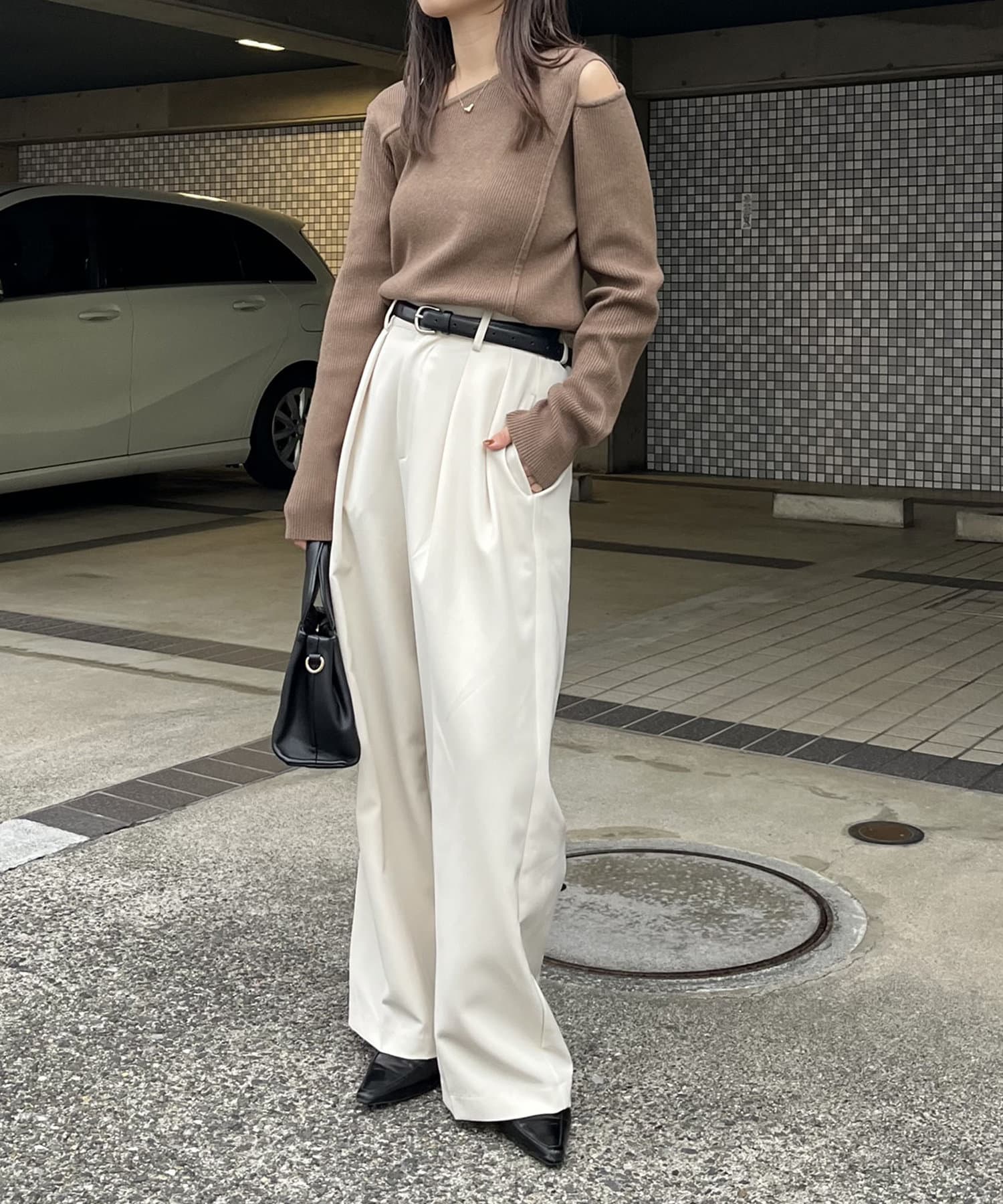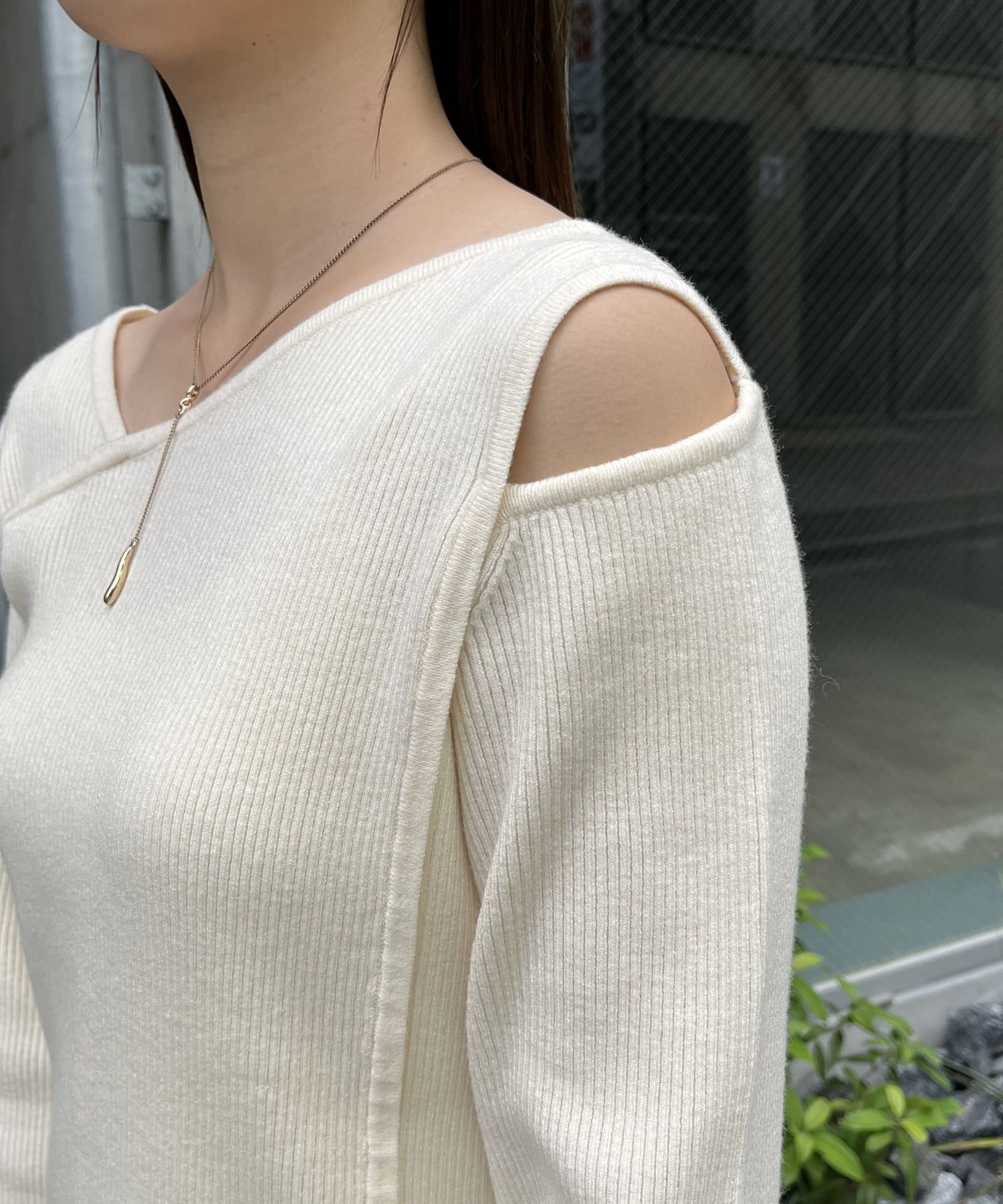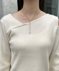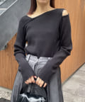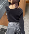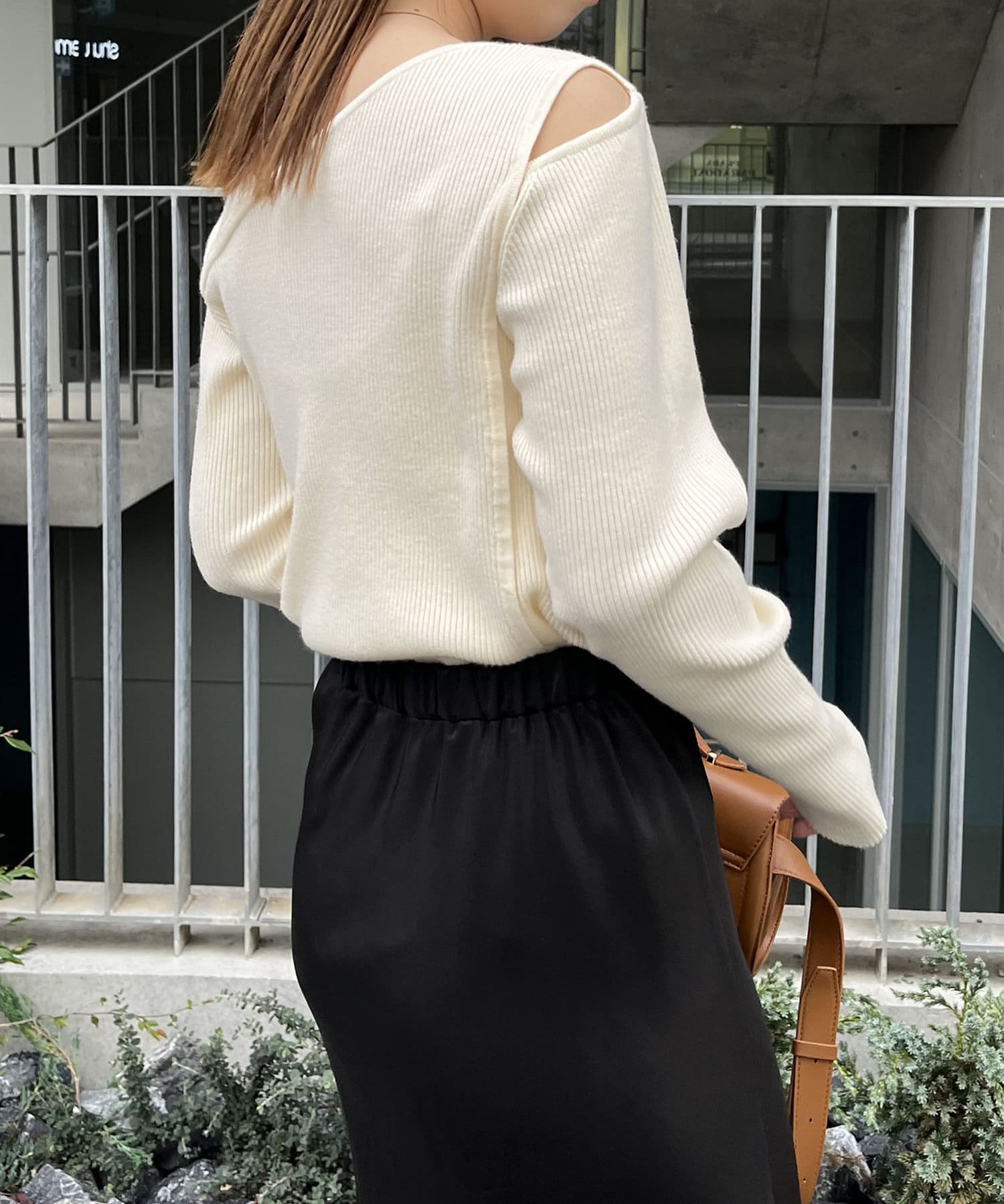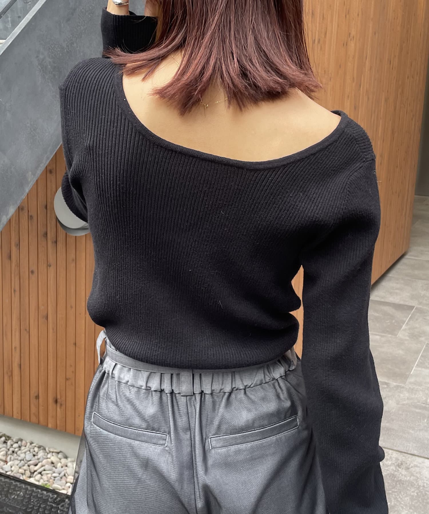 アシメVネックと肩開きのデザインが他にないデザインリブニット