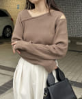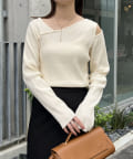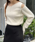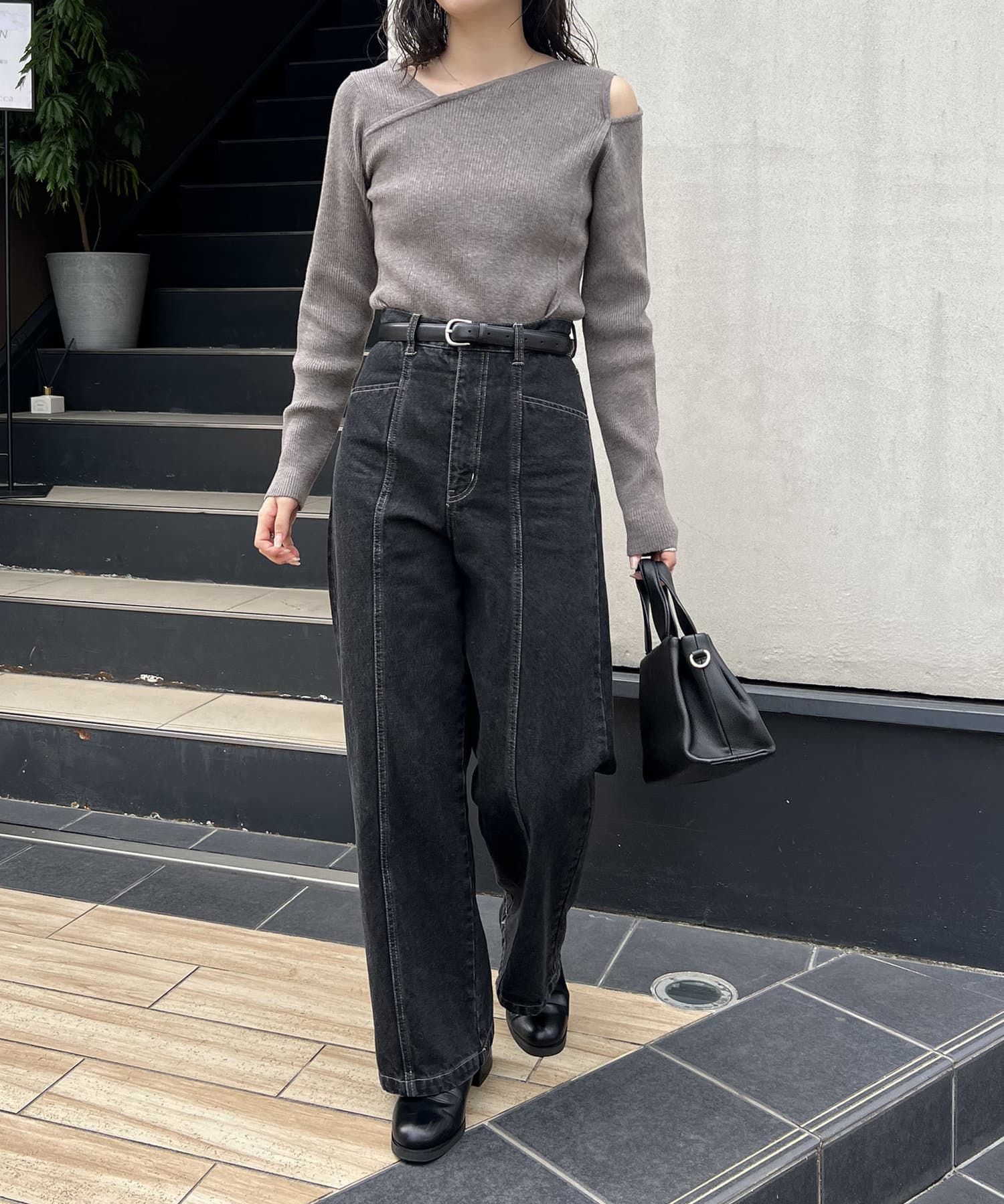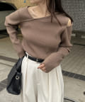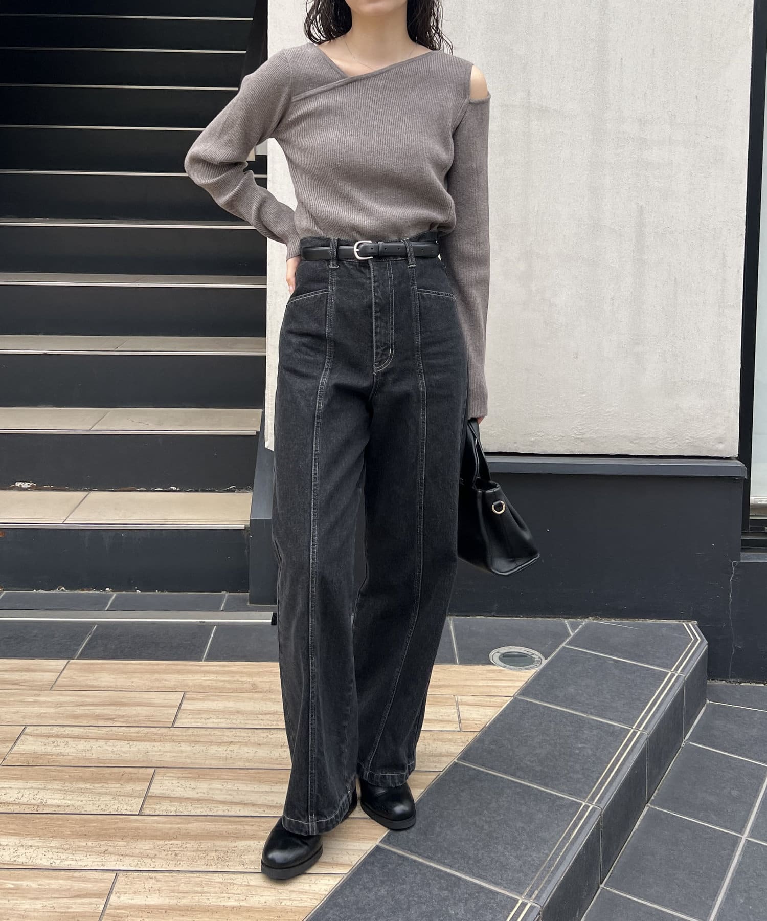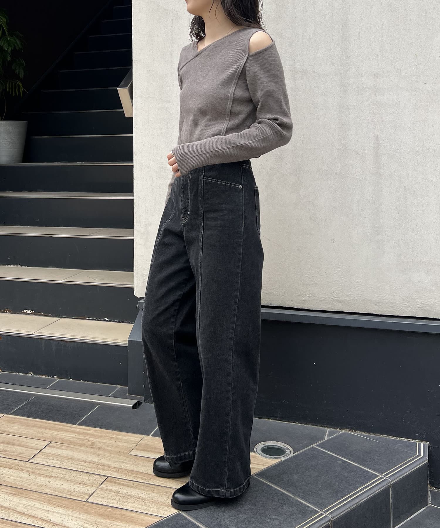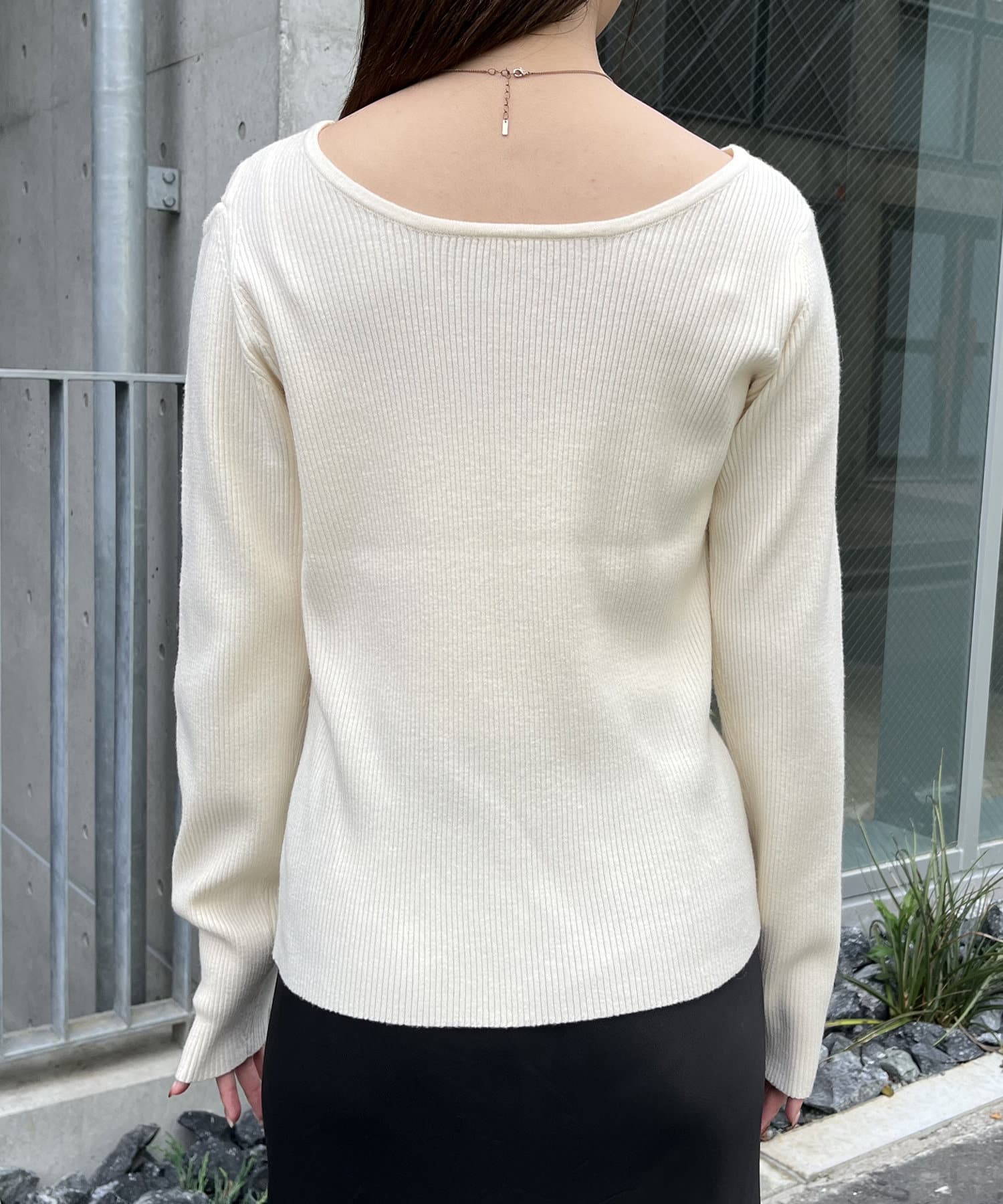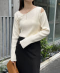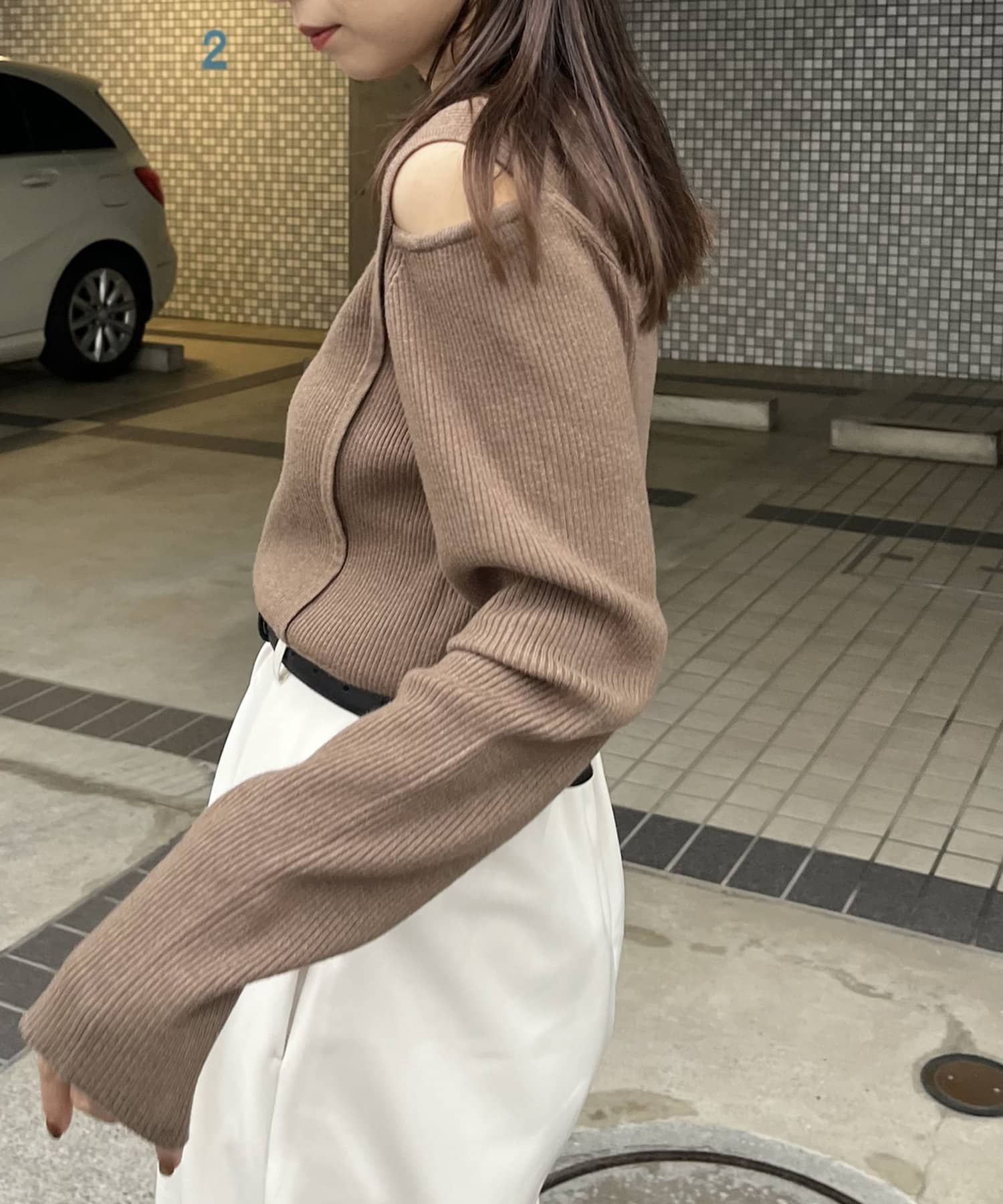 アシメVネックと肩開きのデザインが他にないデザインリブニット