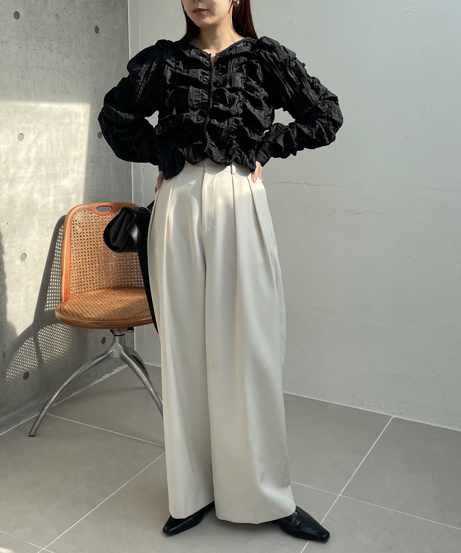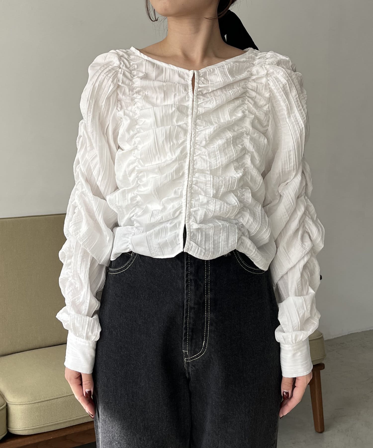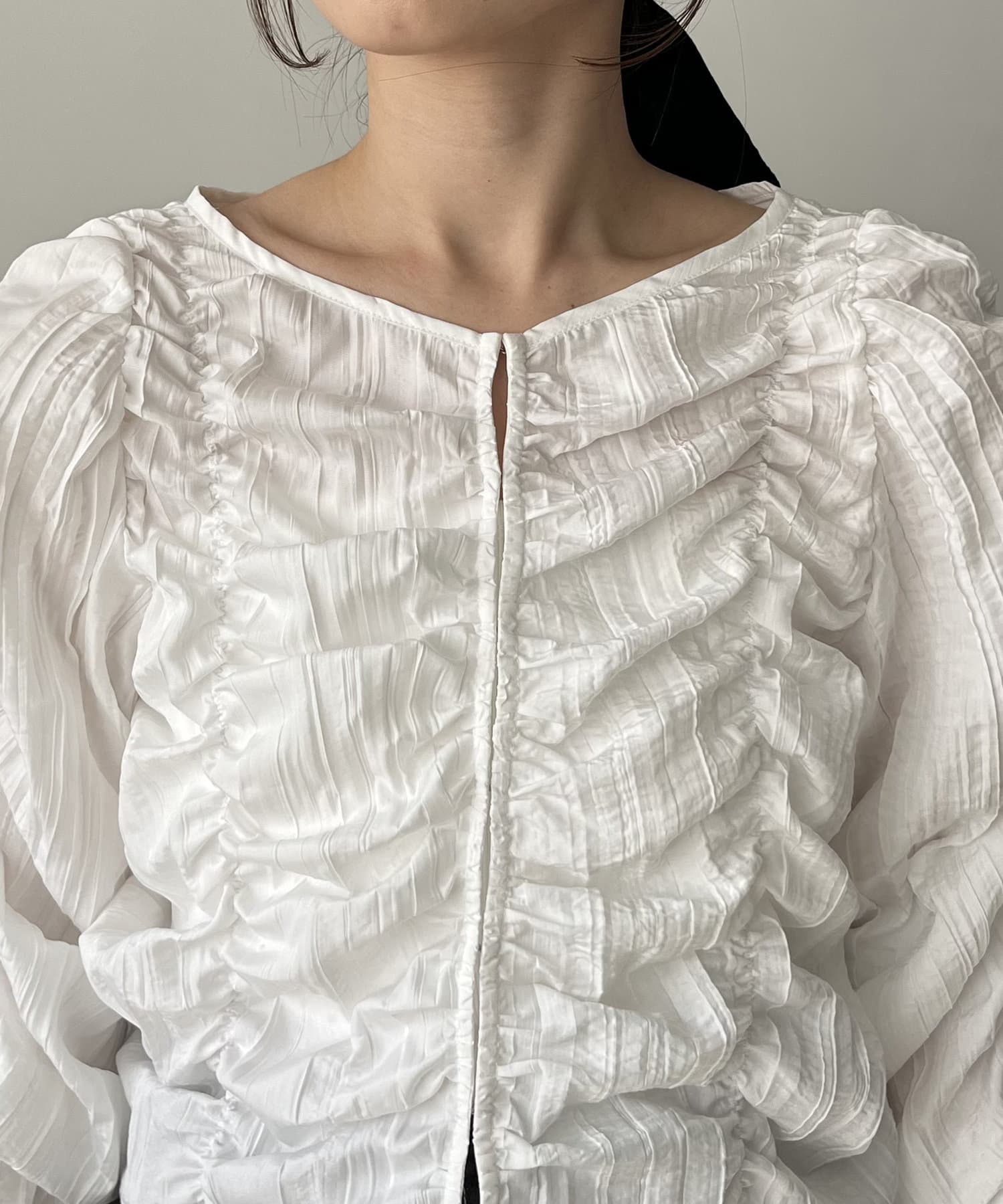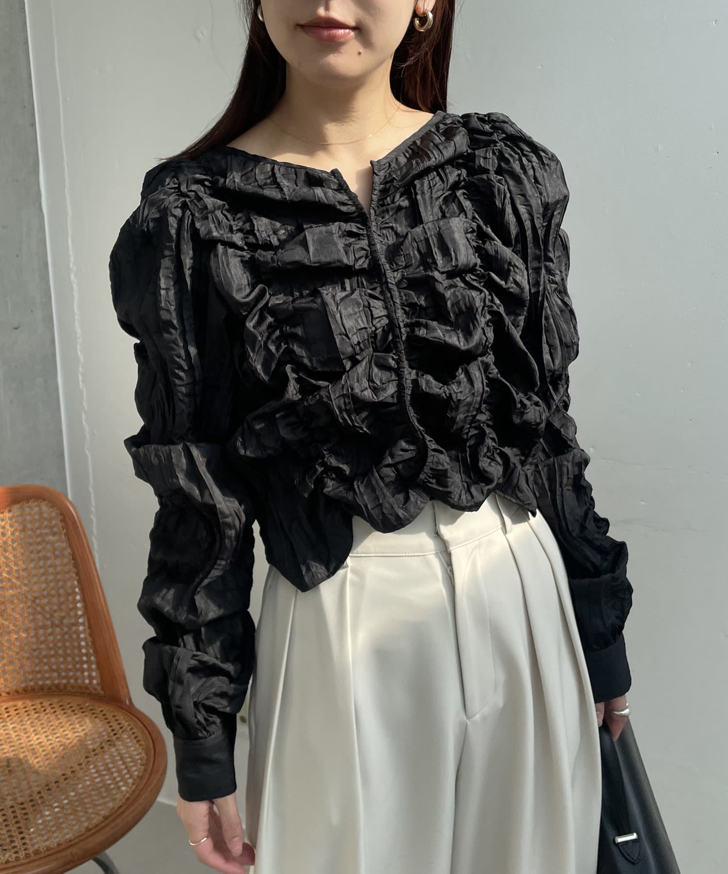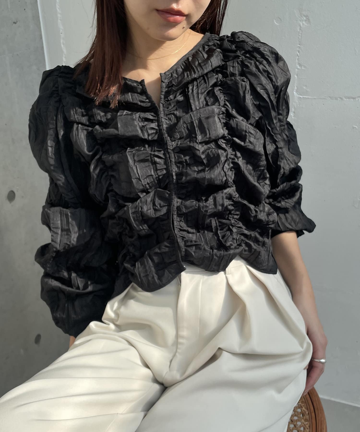 ・身頃や袖全体にシャーリングを入れた主役トップス