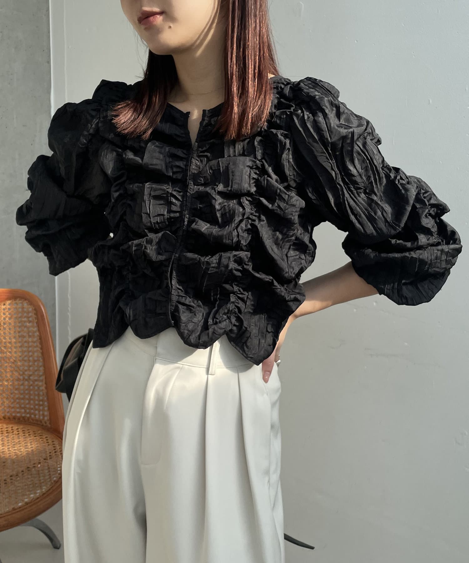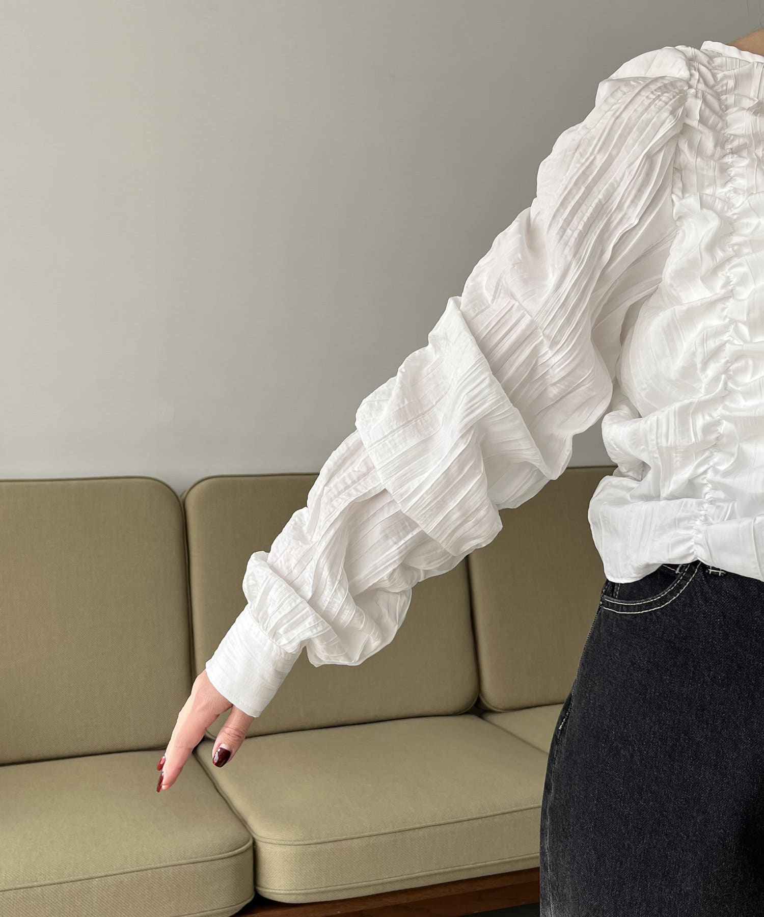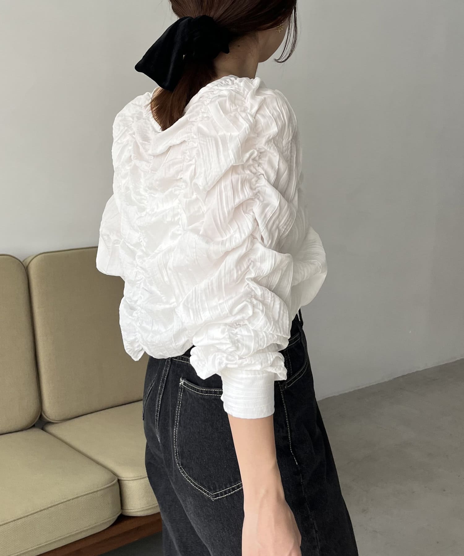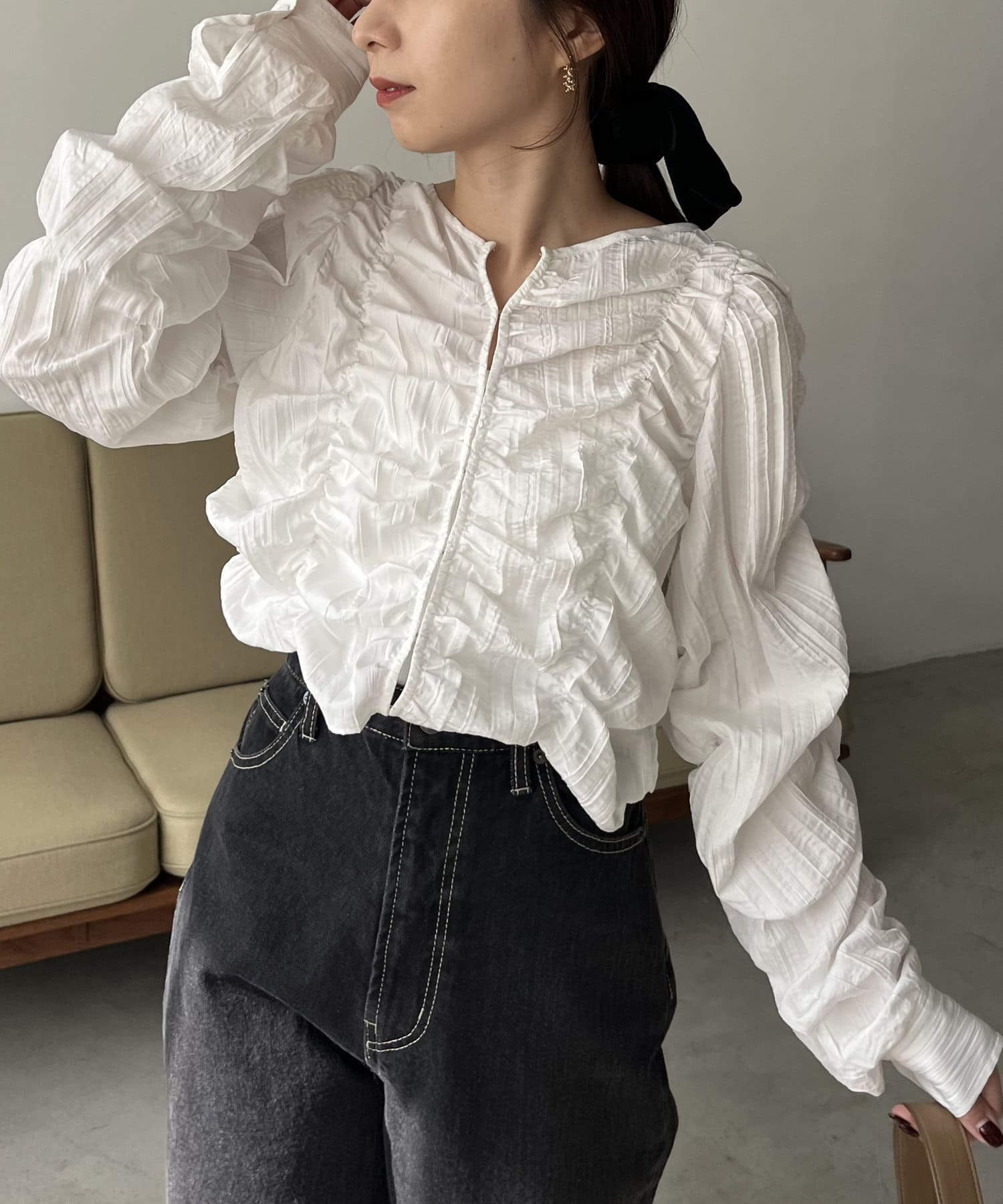 ・身頃や袖全体にシャーリングを入れた主役トップス