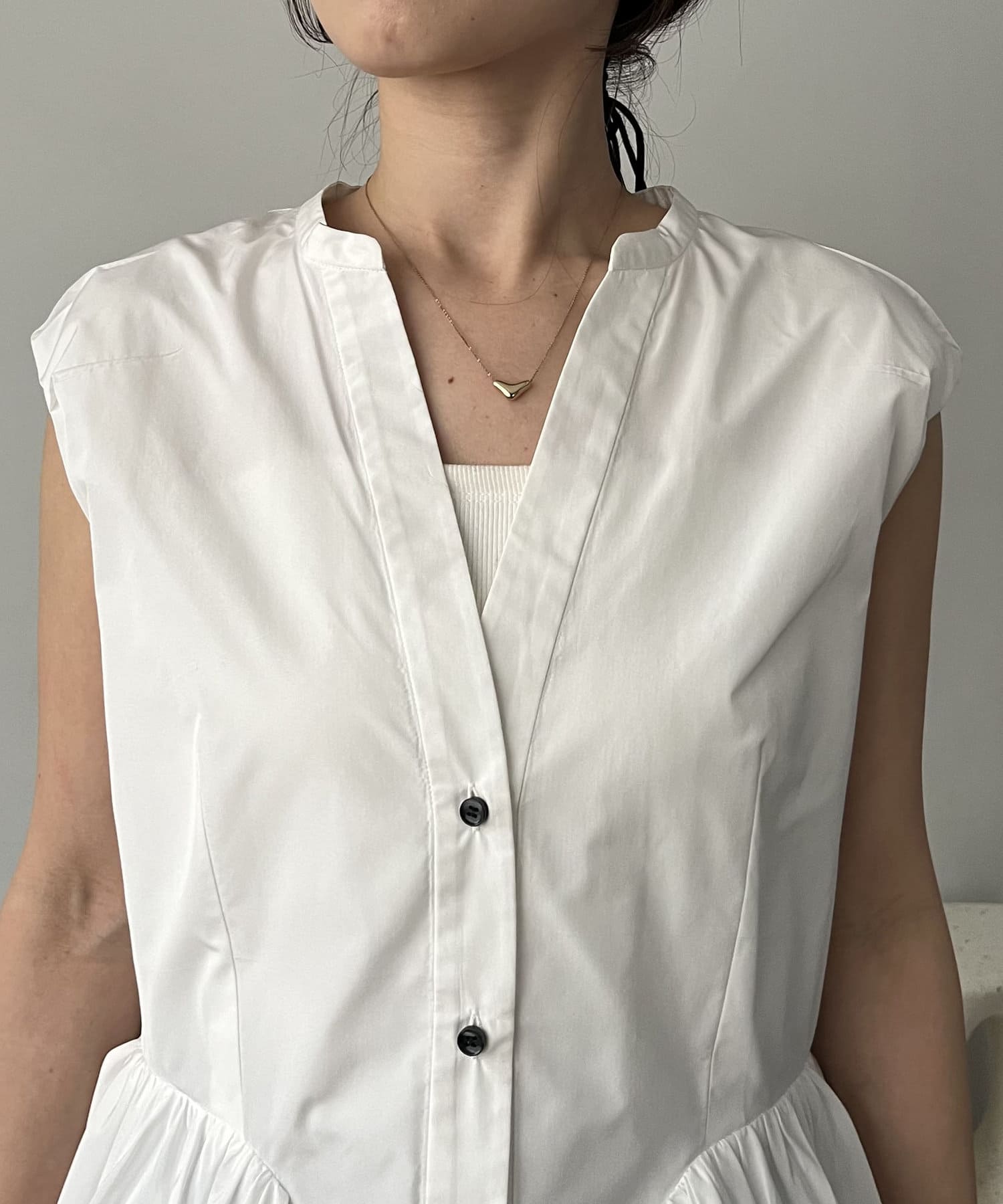 ・襟は甘くなりすぎないバンドカラーのスキッパーシャツでシャープに