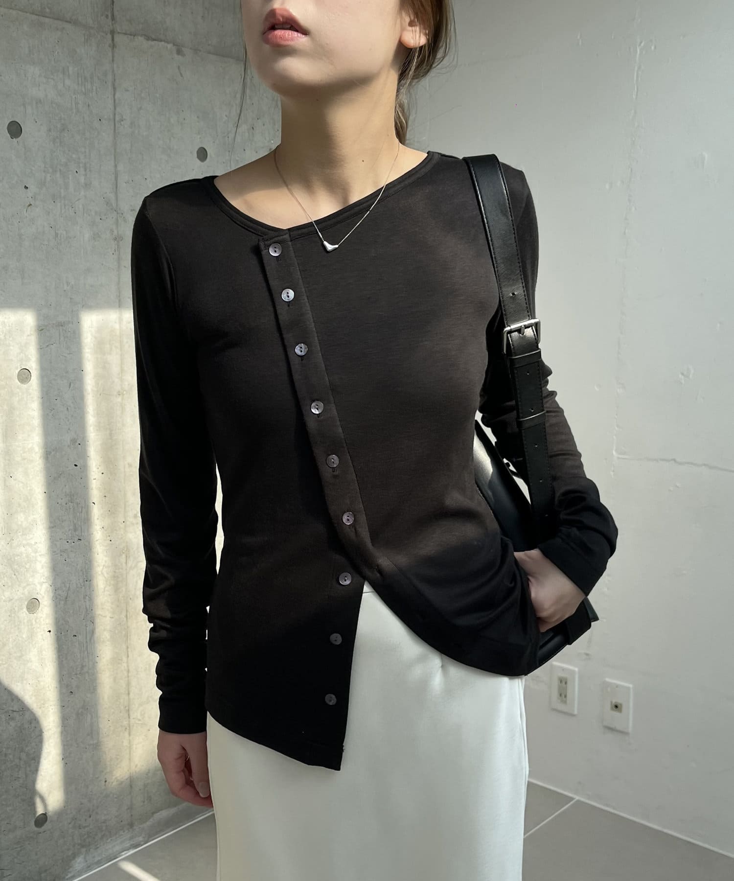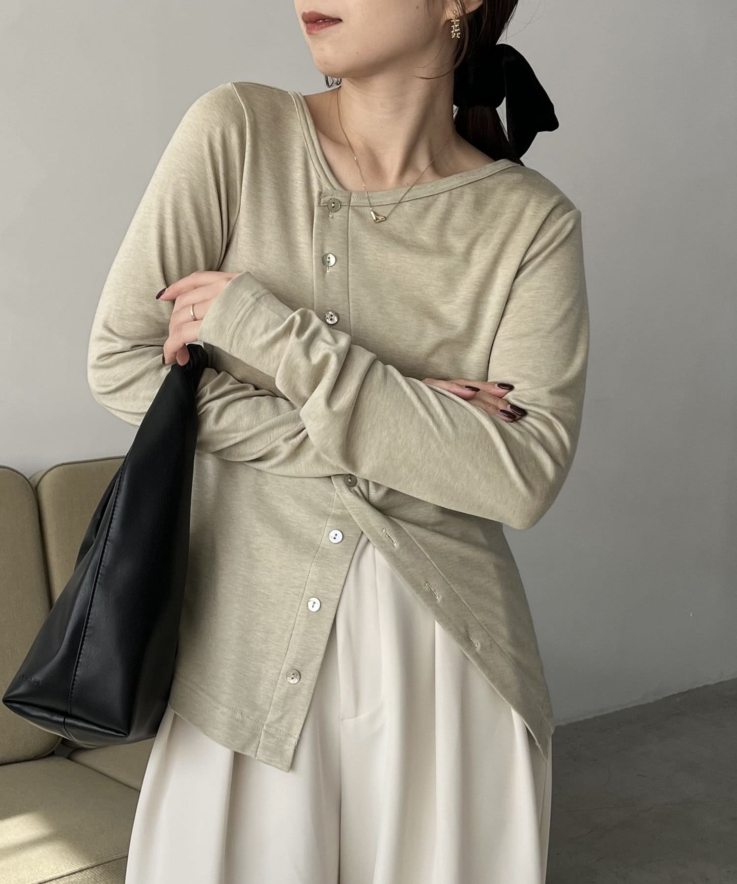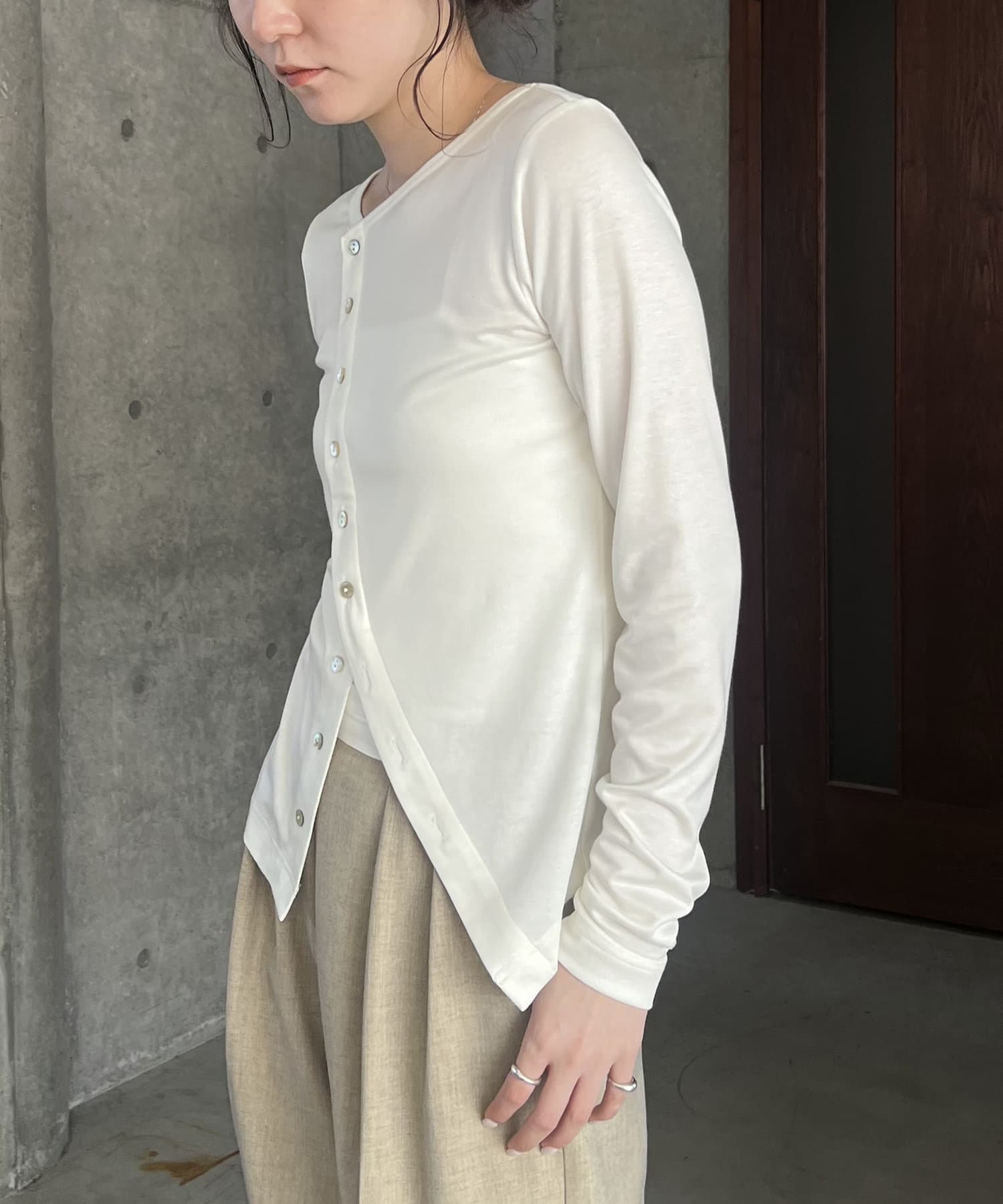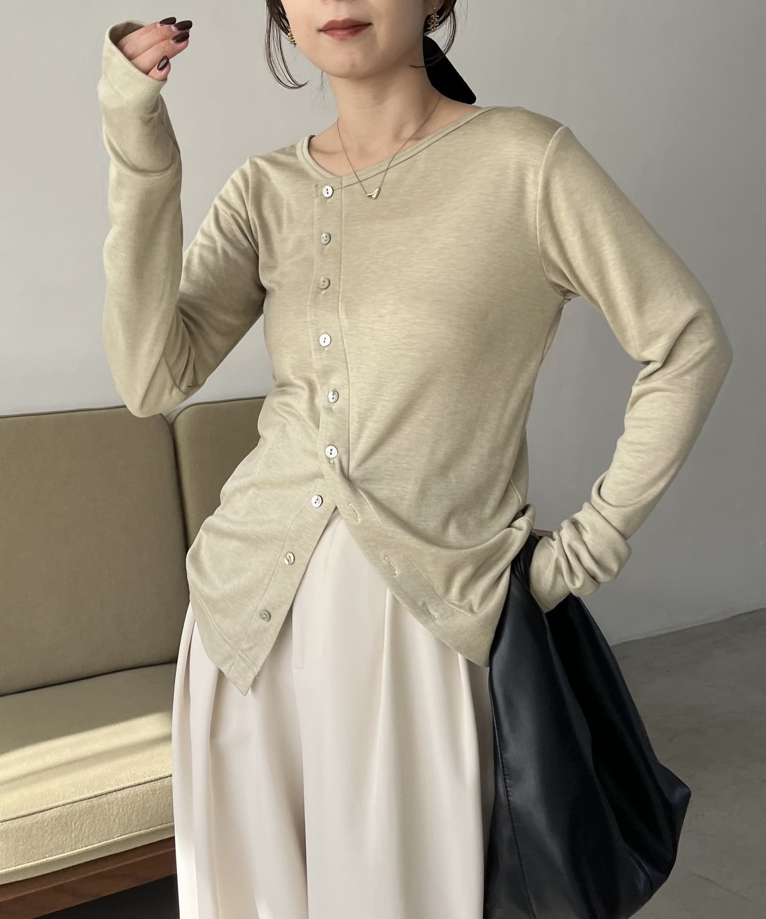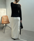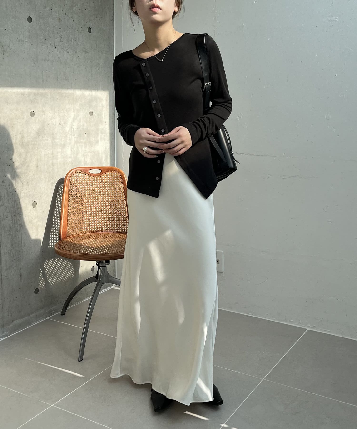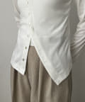 ・左右アシンメトリーのネックラインと裾のスリットもポイント