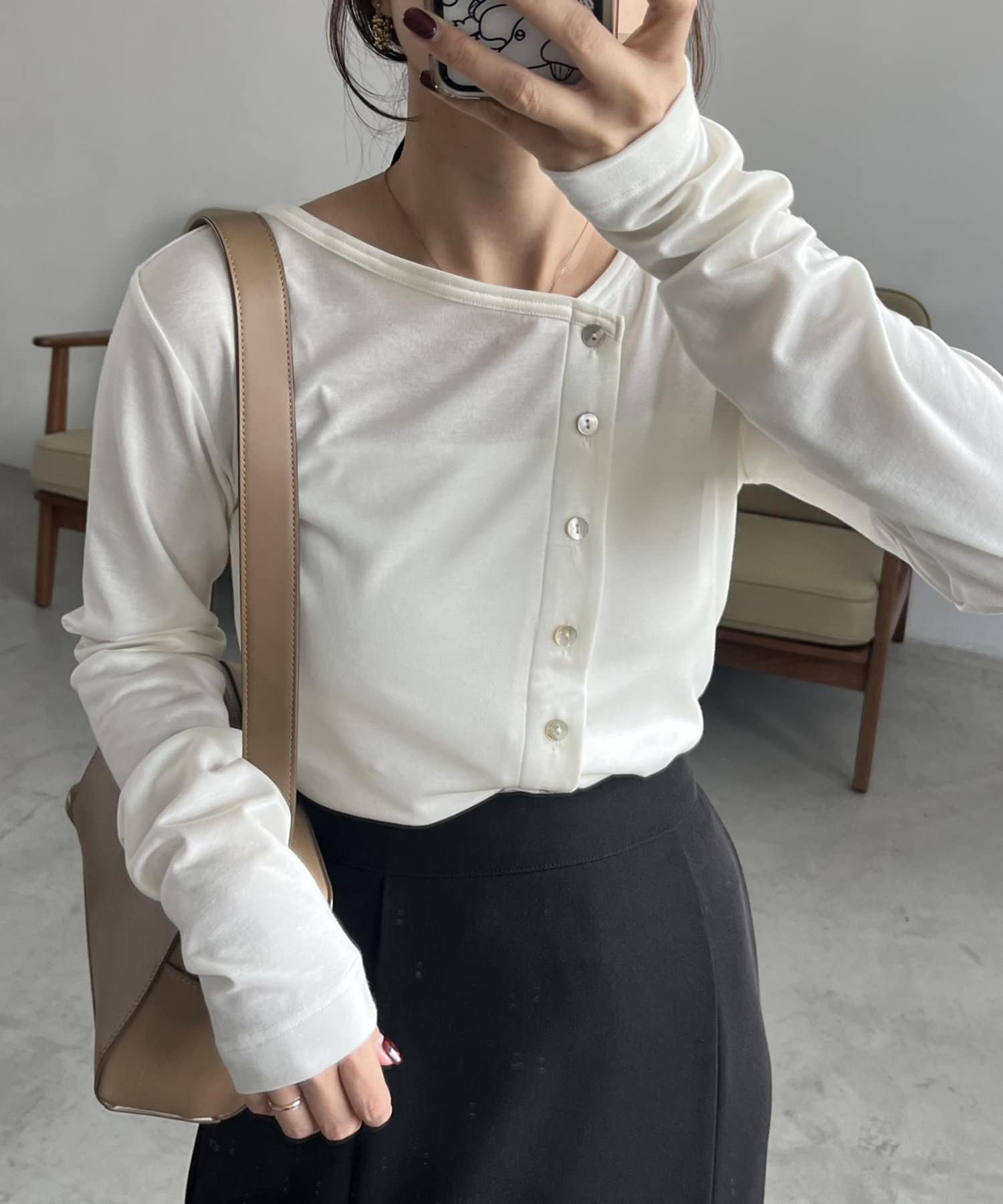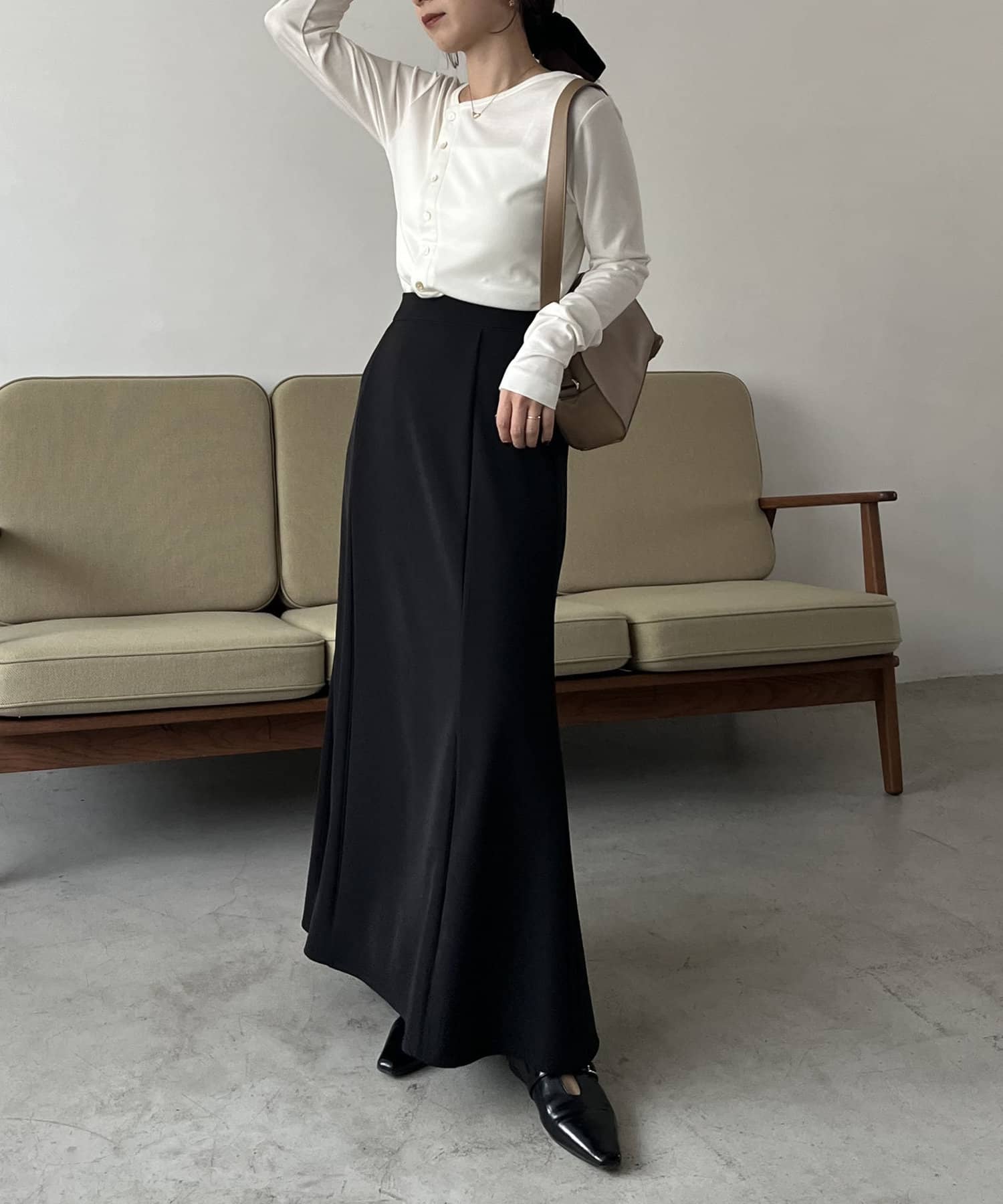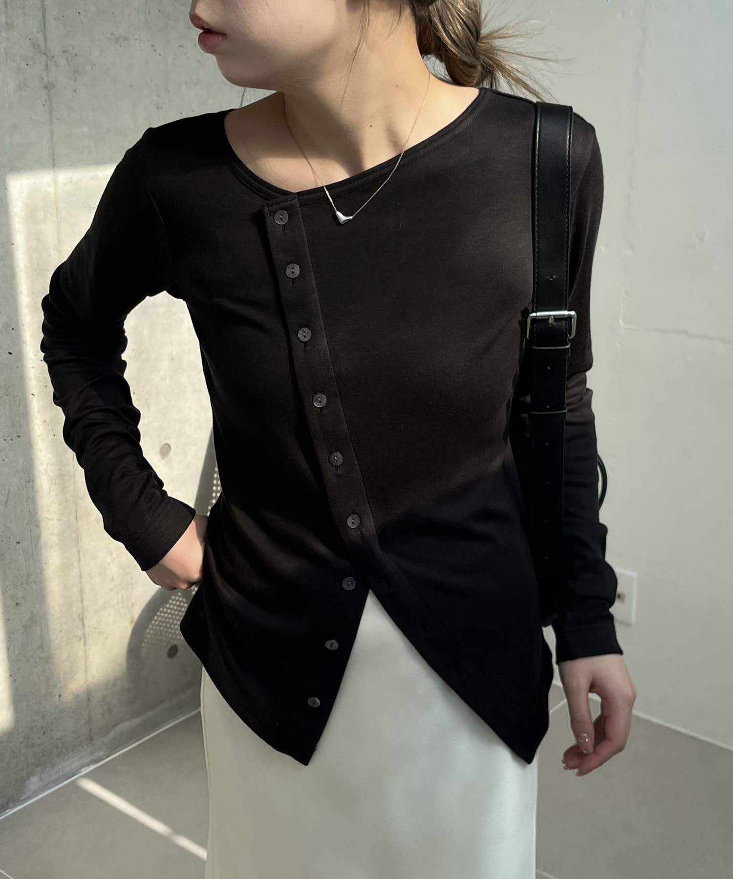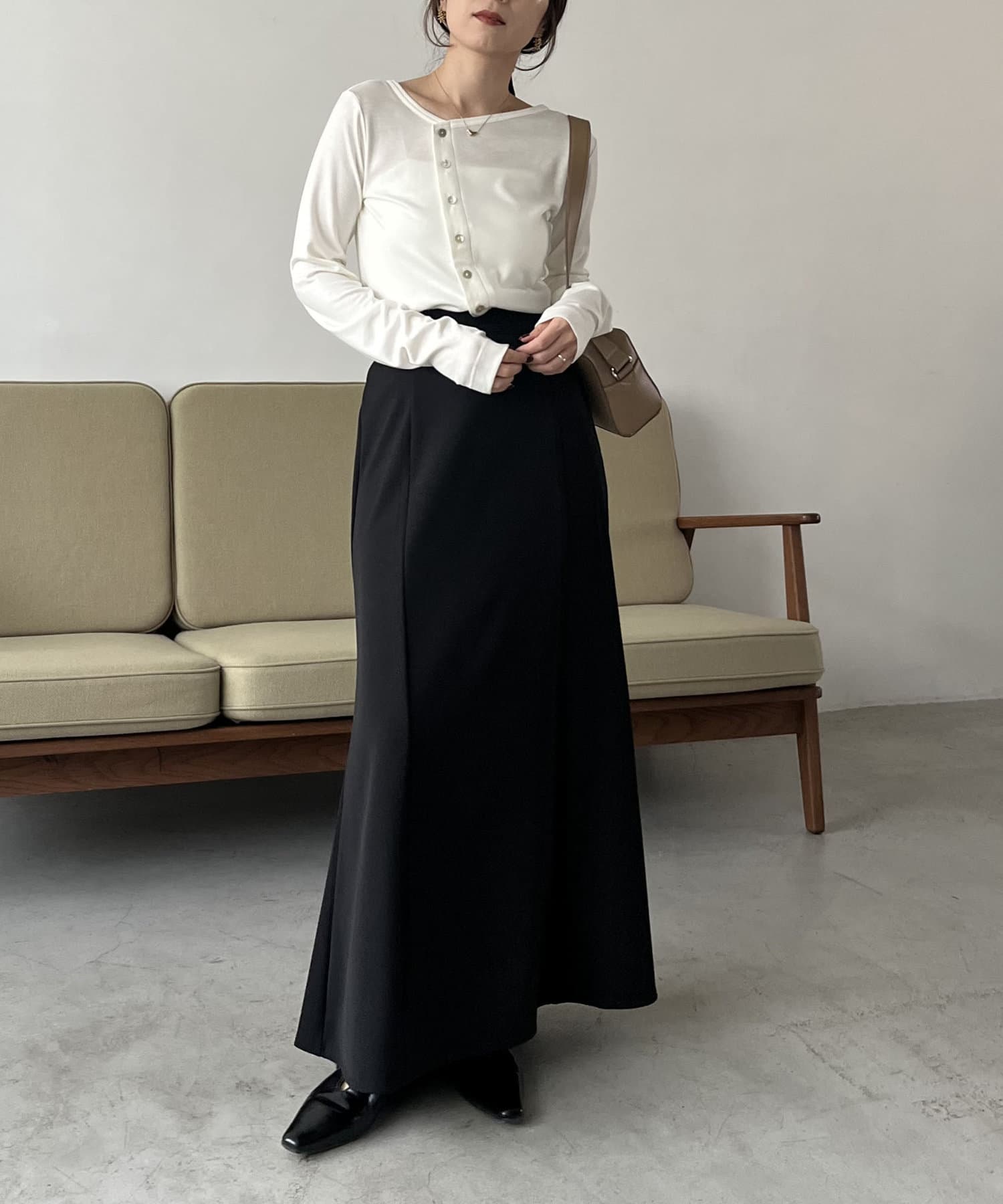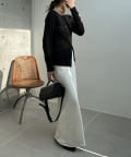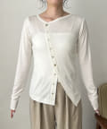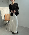 ・左右アシンメトリーのネックラインと裾のスリットもポイント