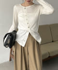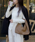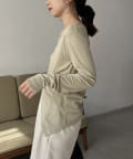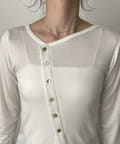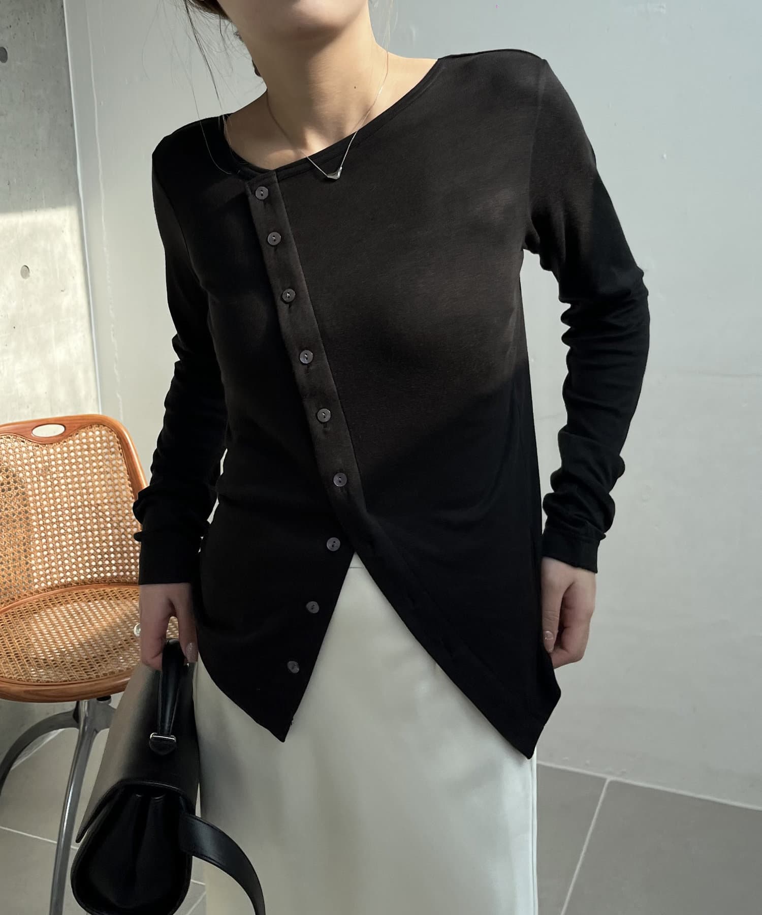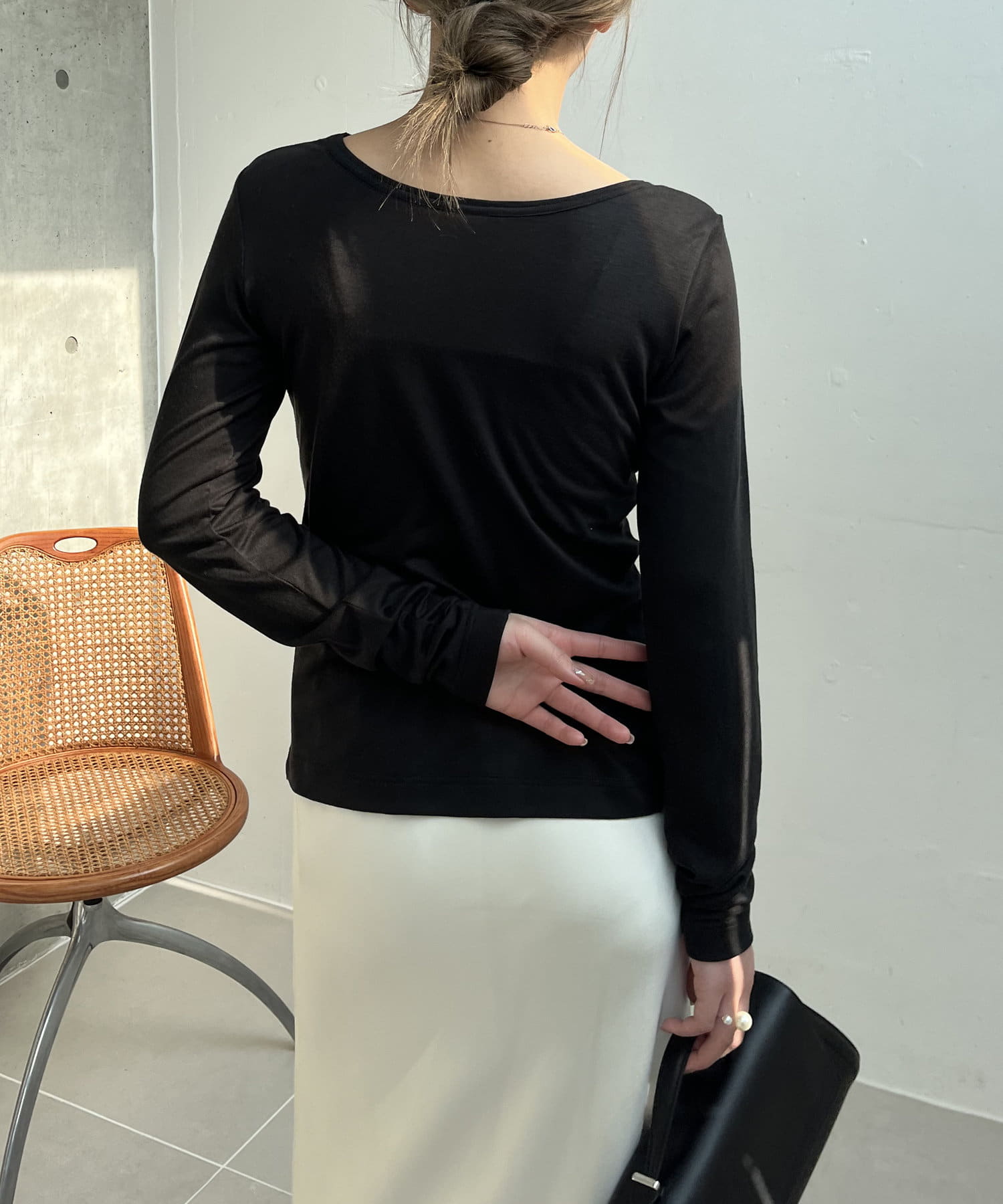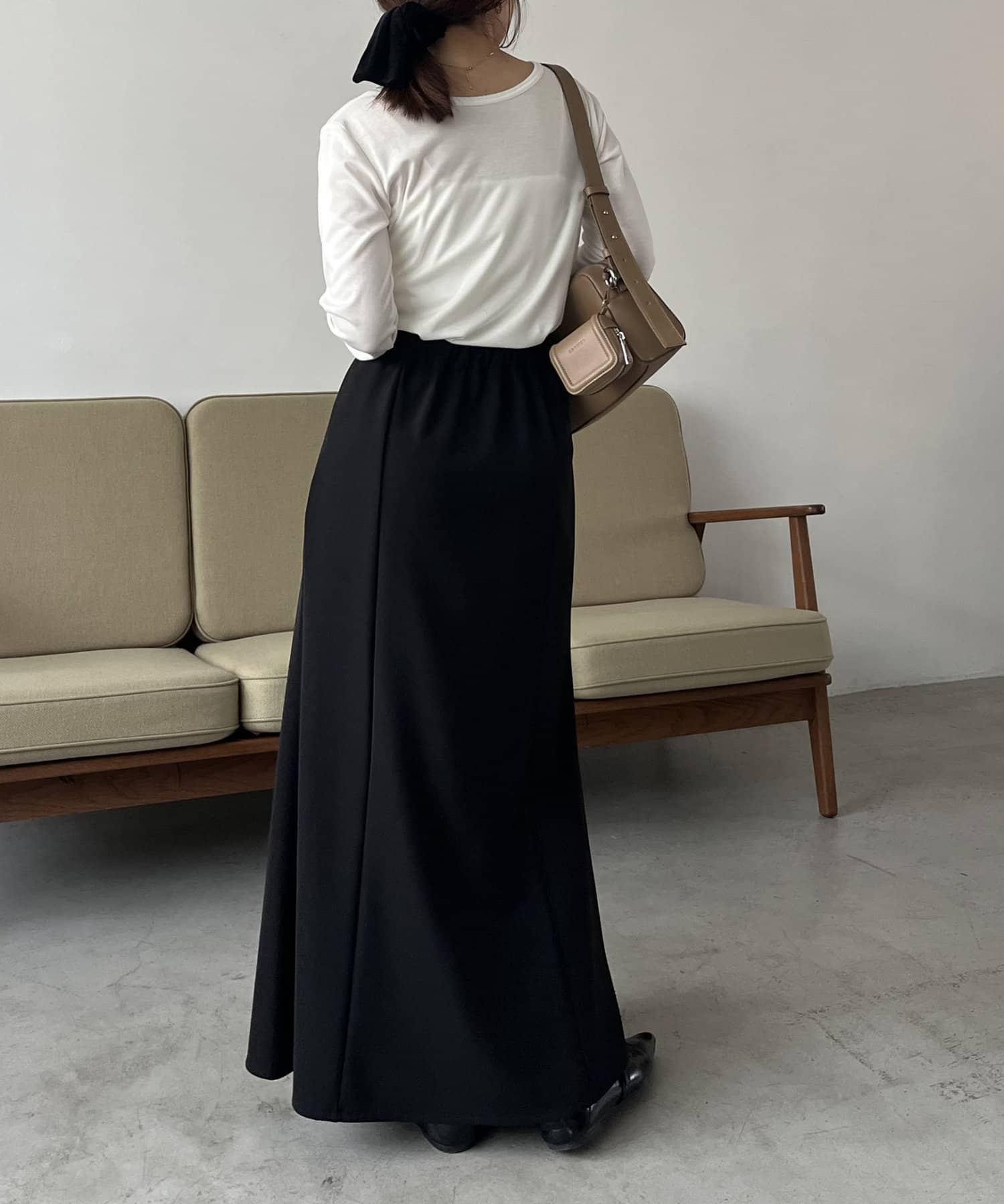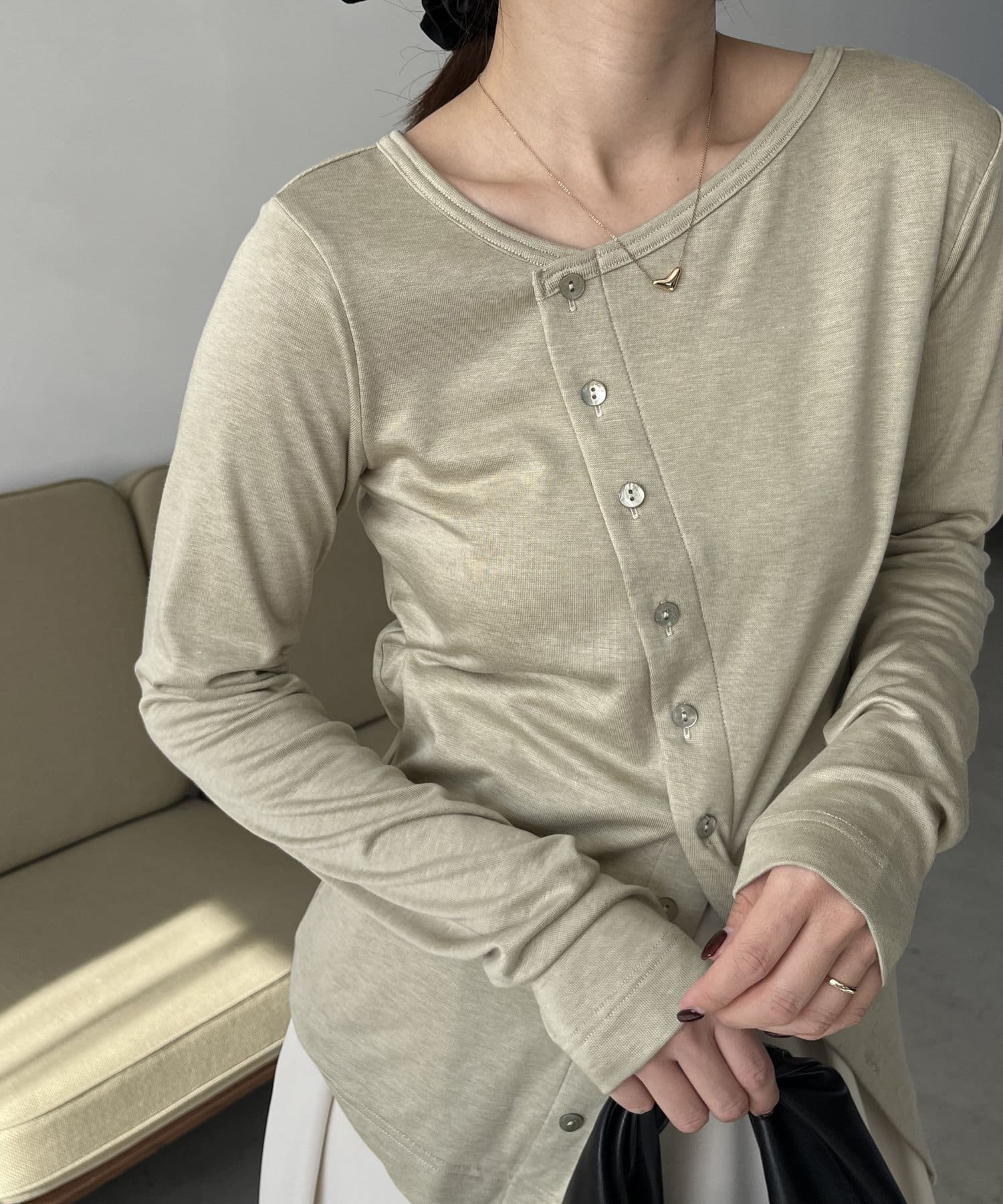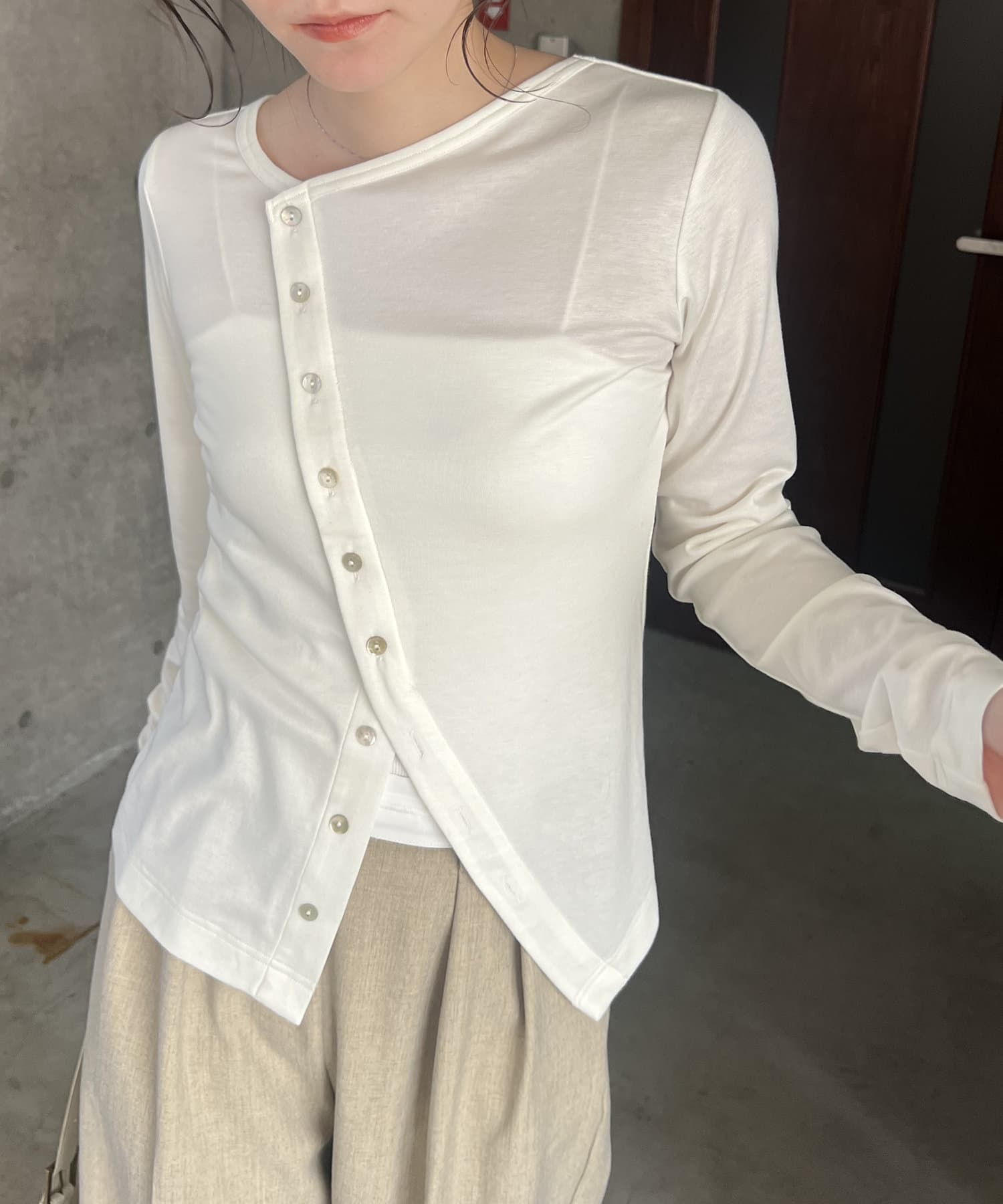 ・左右アシンメトリーのネックラインと裾のスリットもポイント