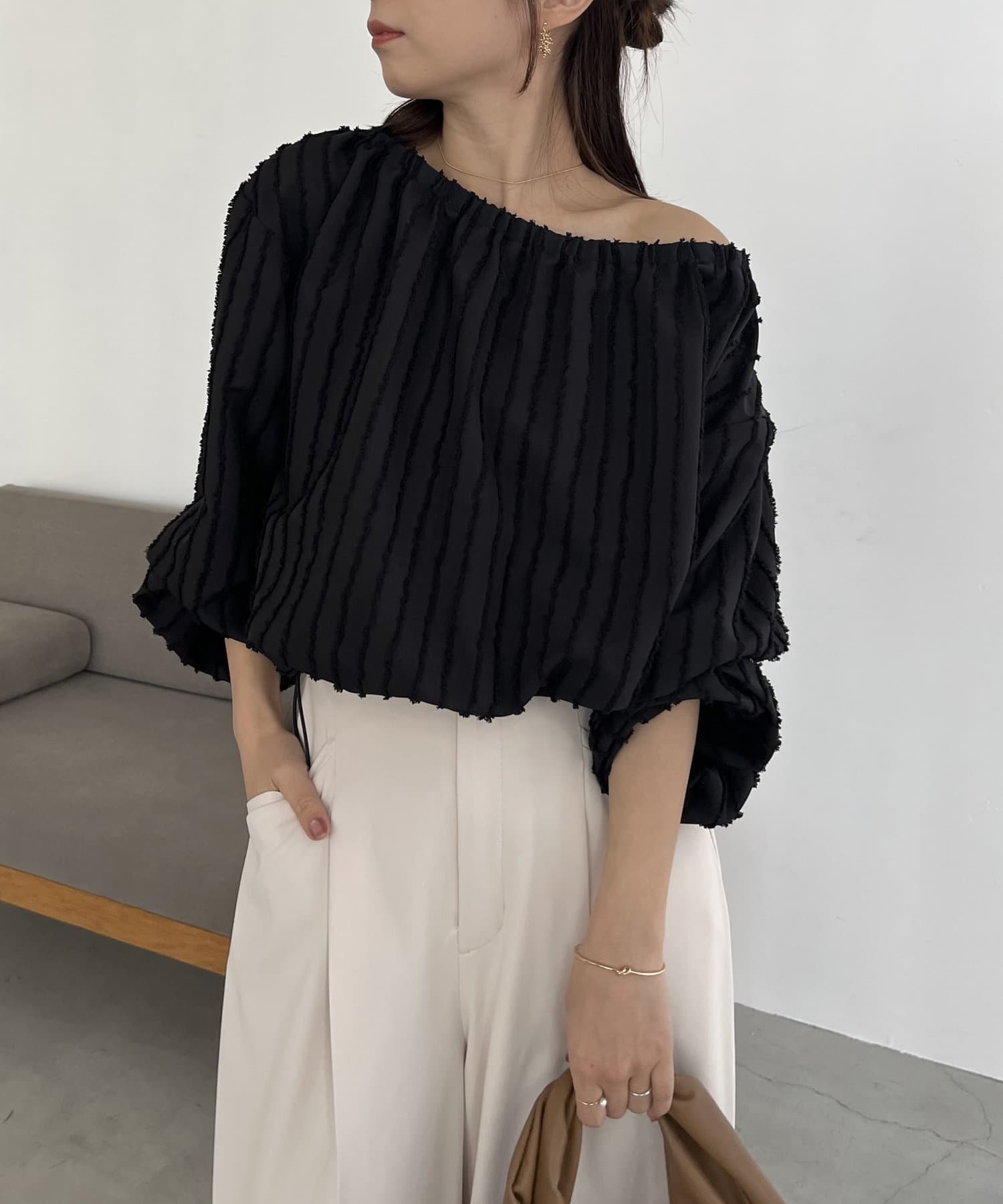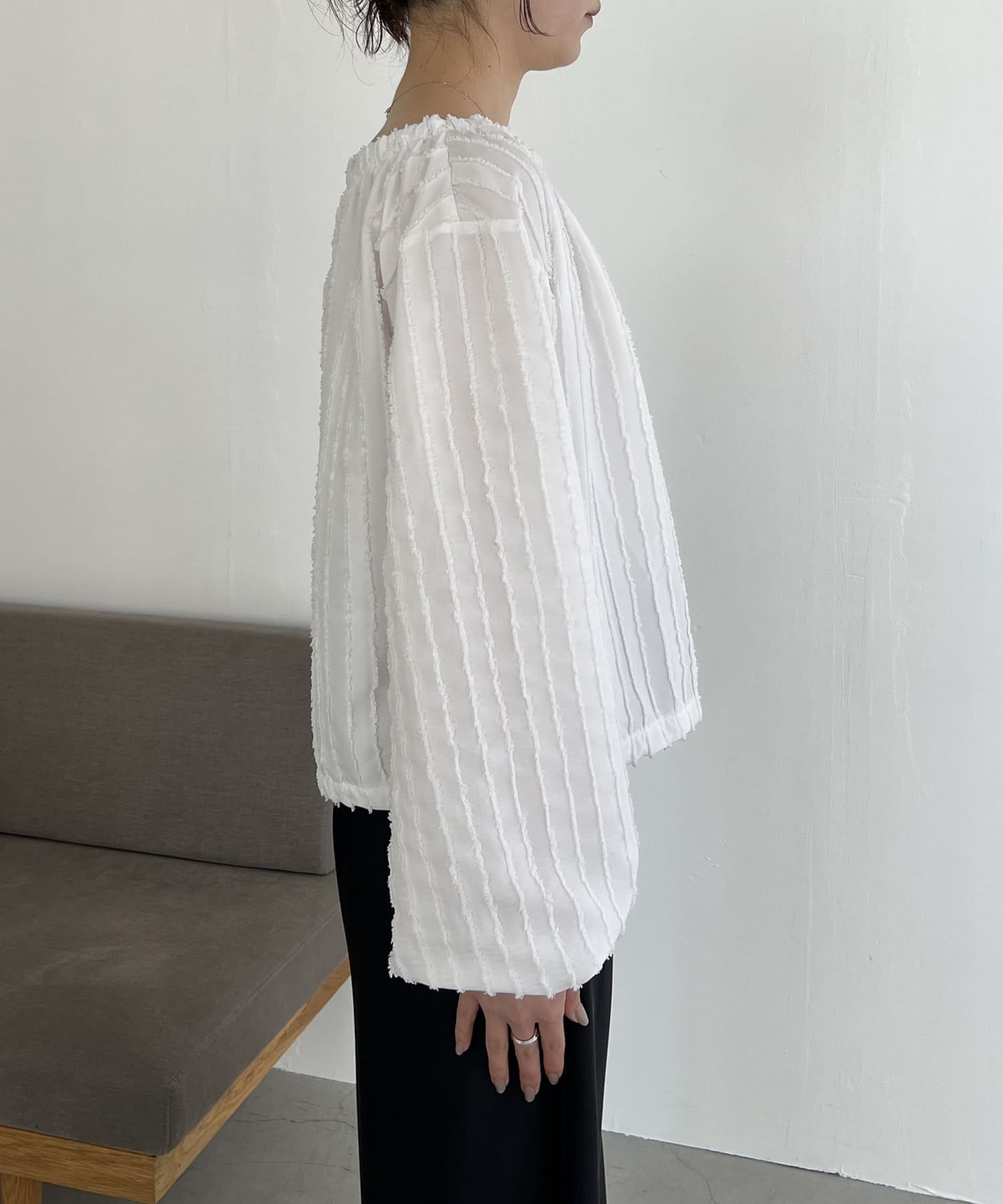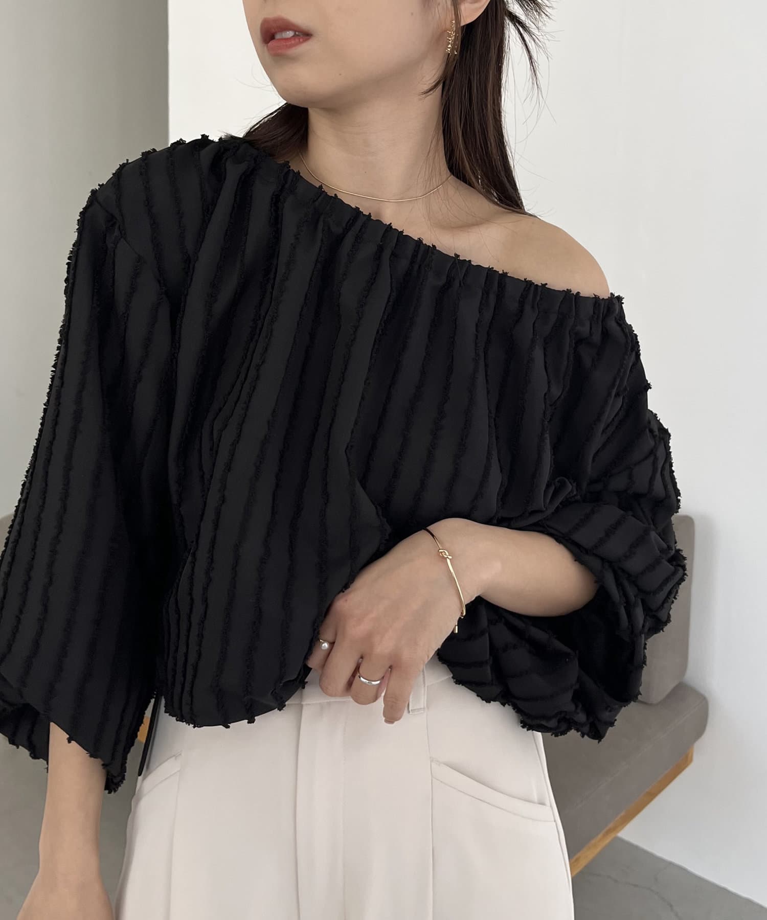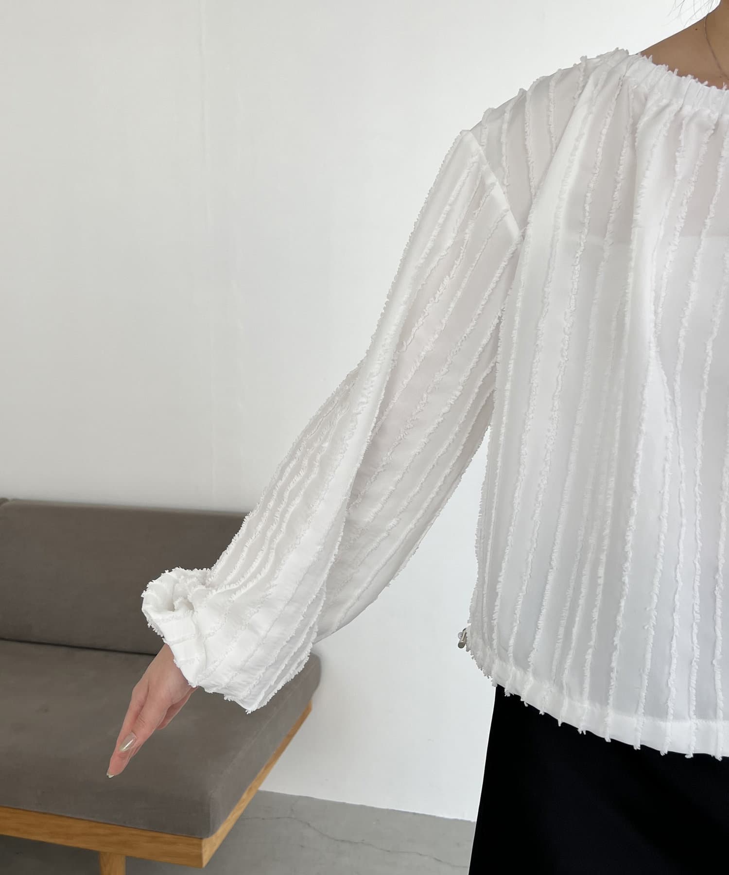 表面感あるカットオフデザインの生地が特徴的なブラウス