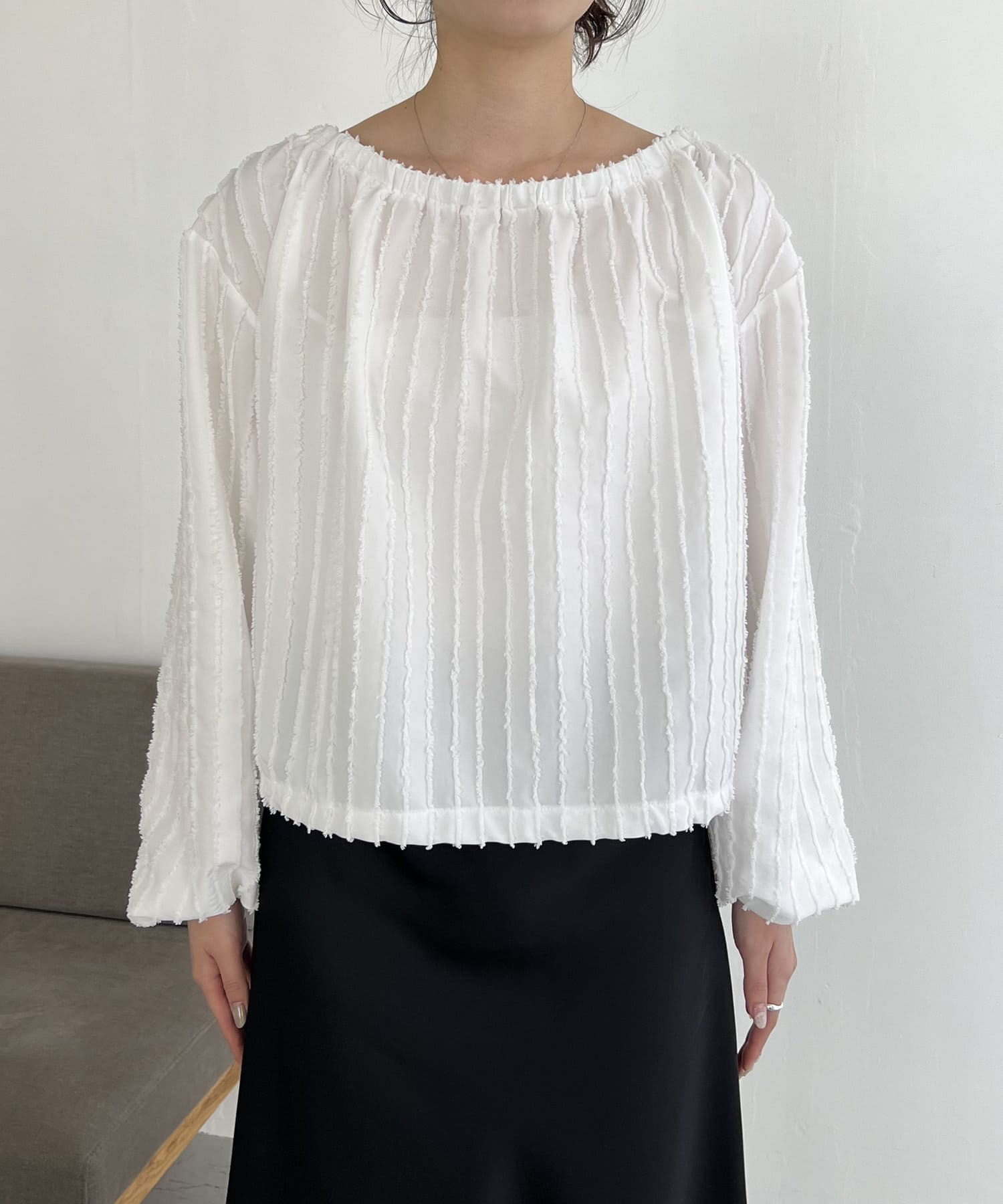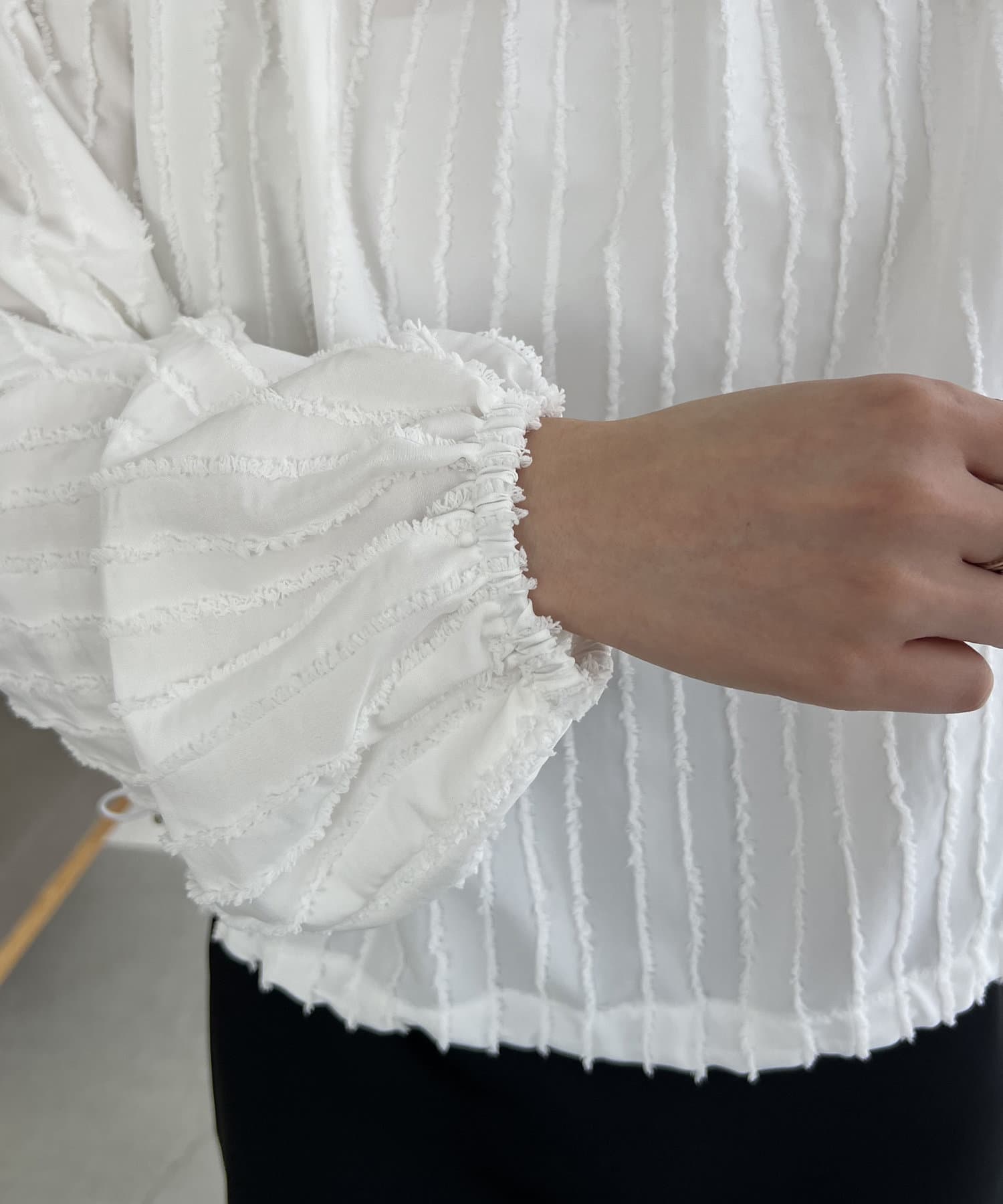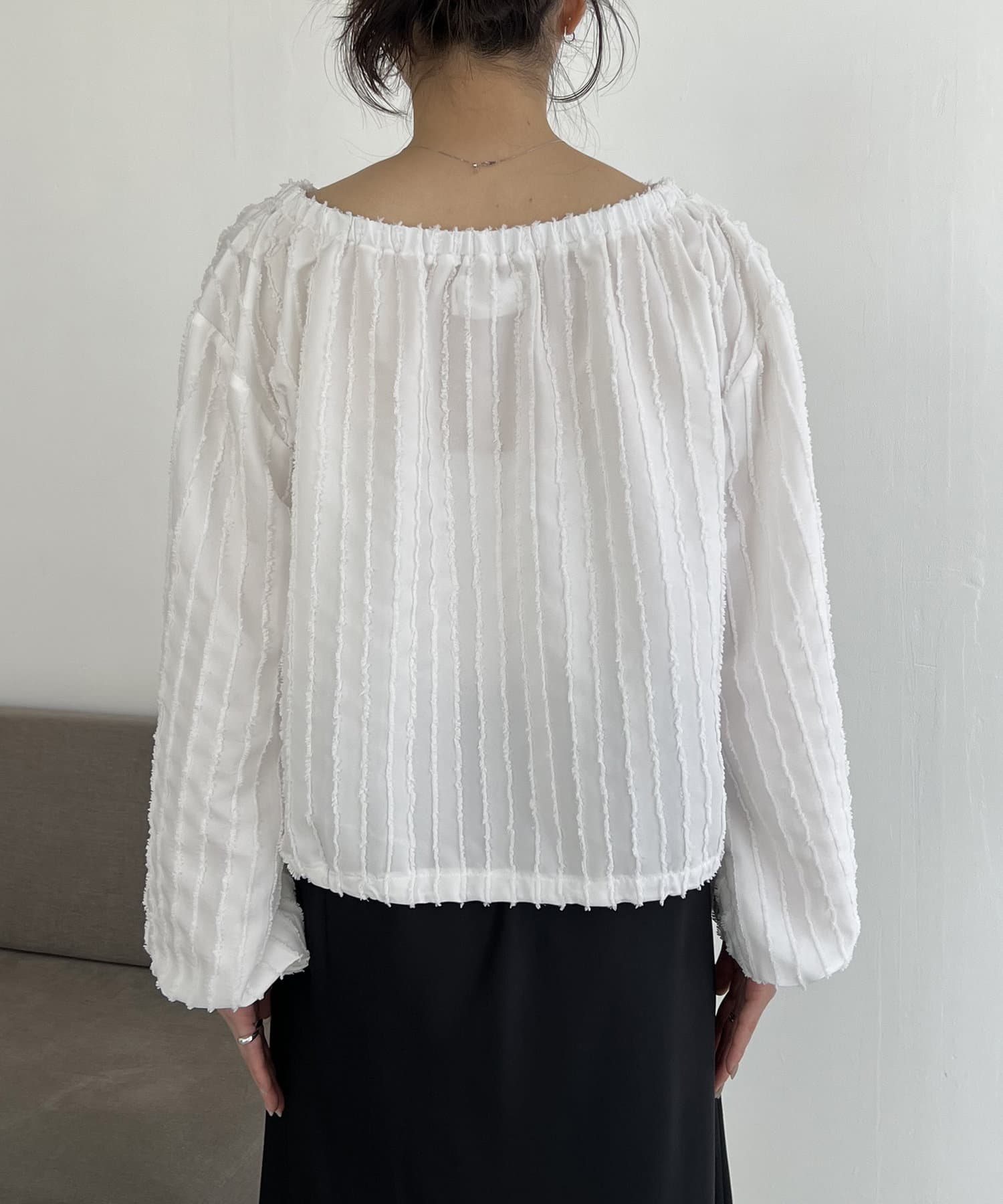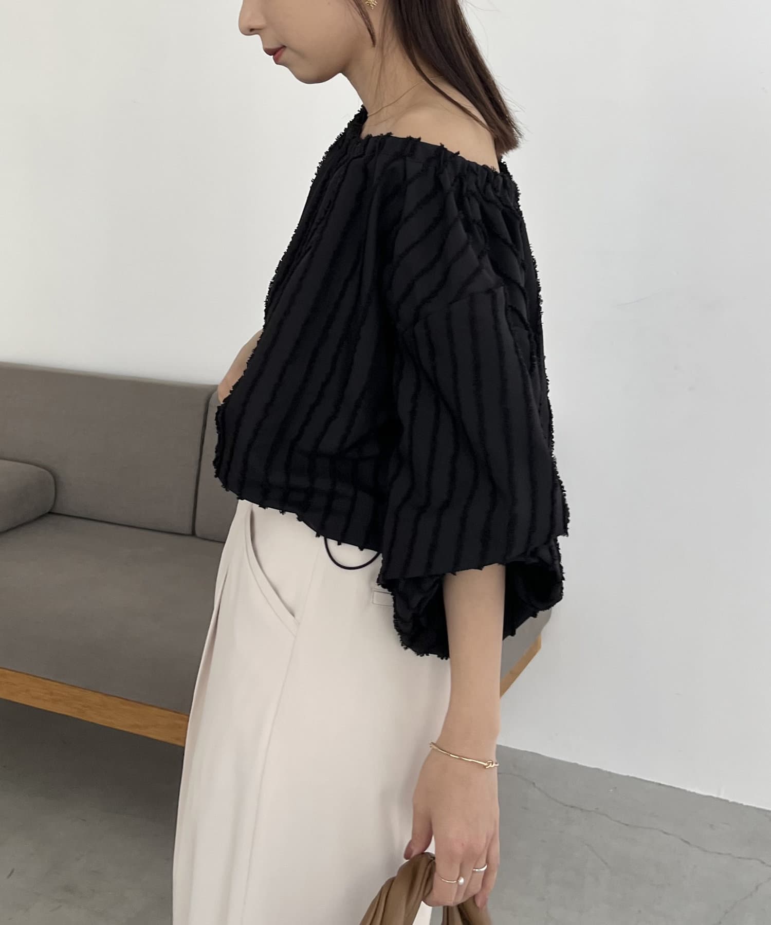表面感あるカットオフデザインの生地が特徴的なブラウス