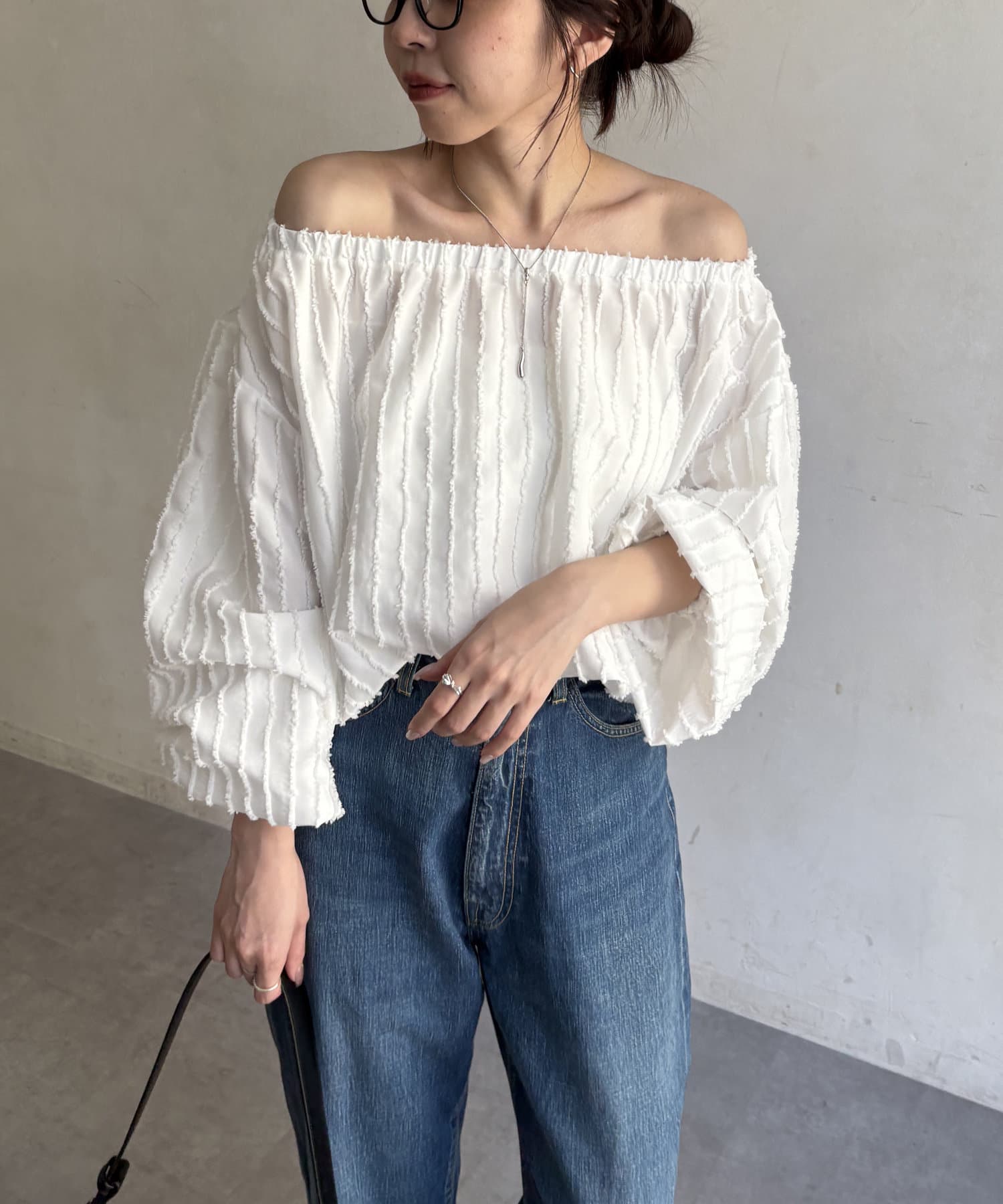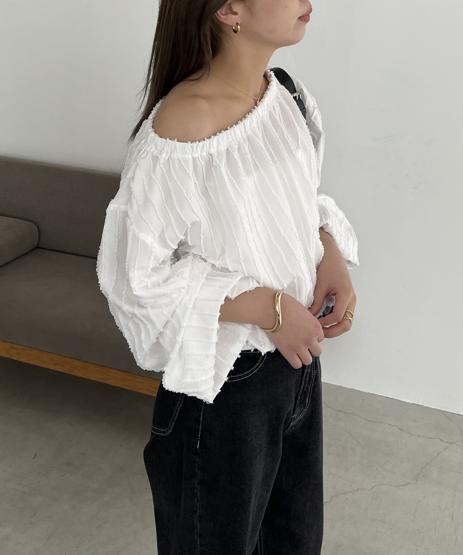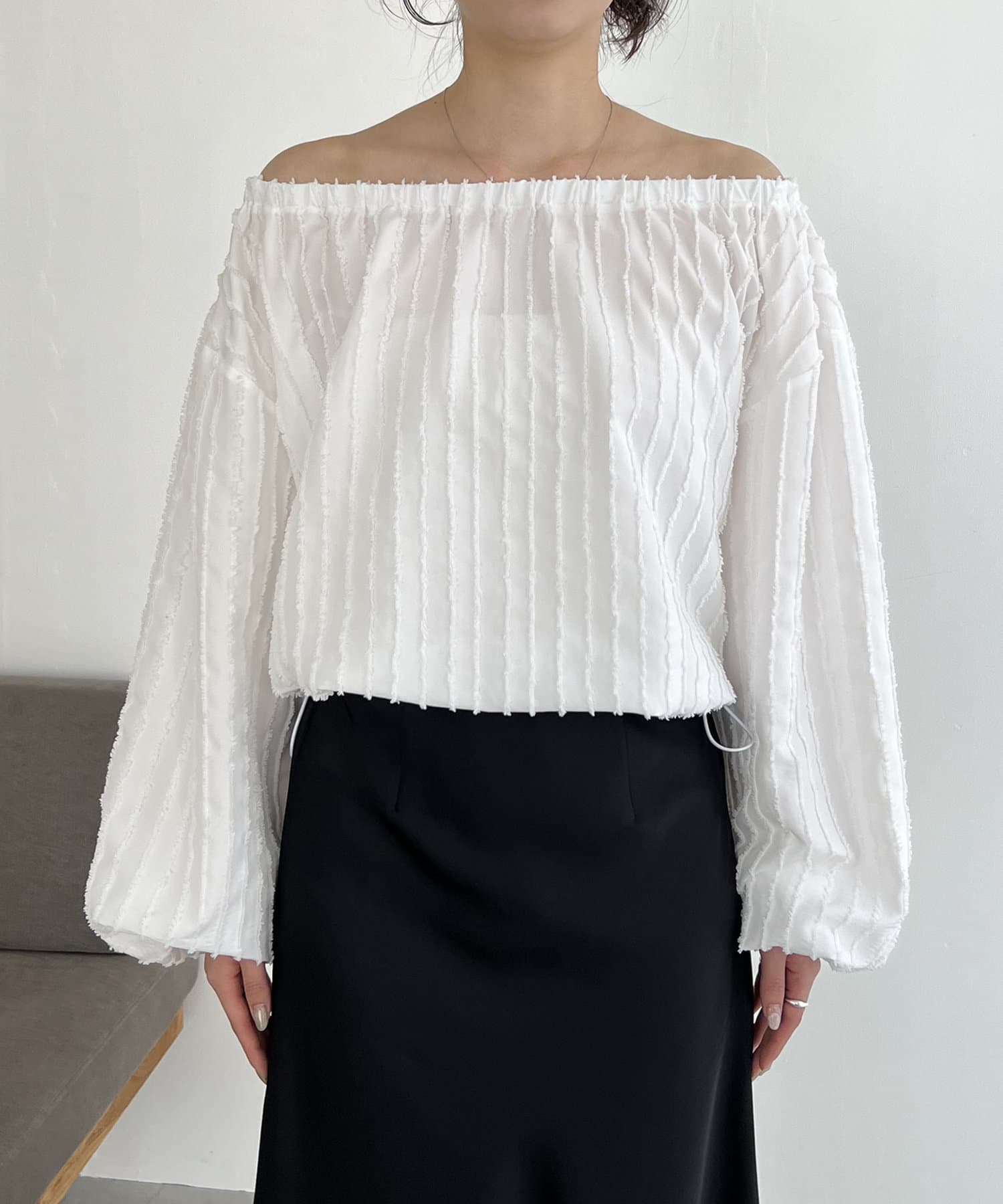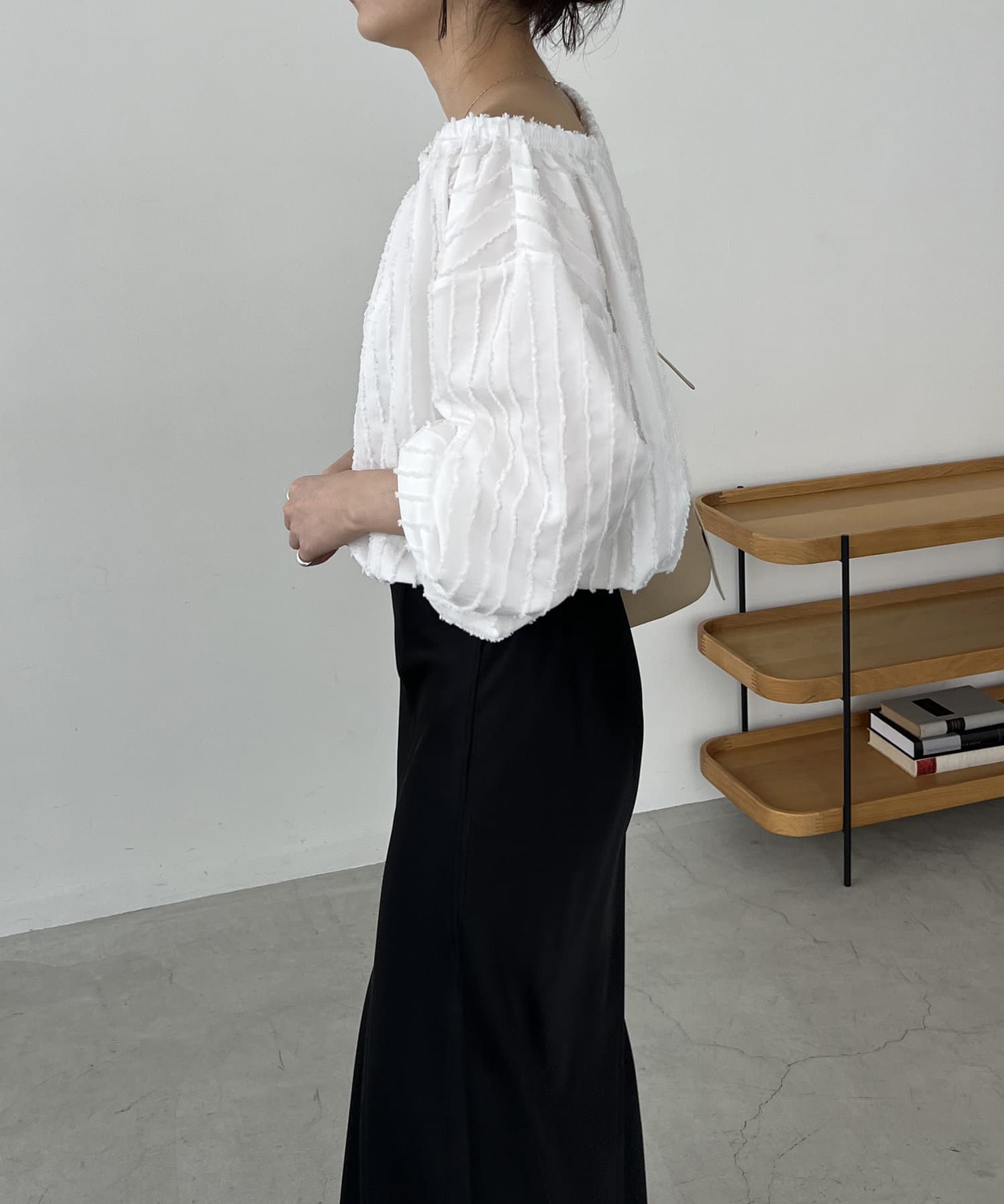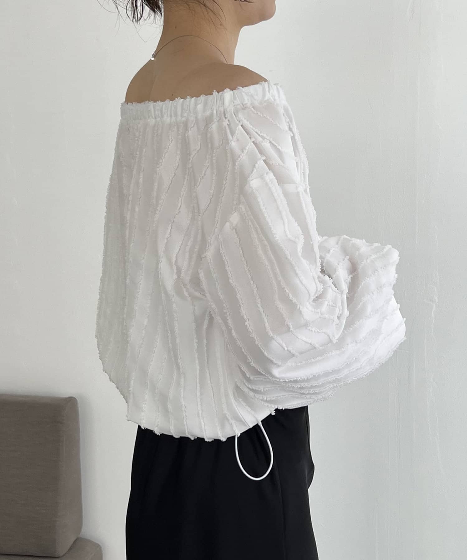 表面感あるカットオフデザインの生地が特徴的なブラウス