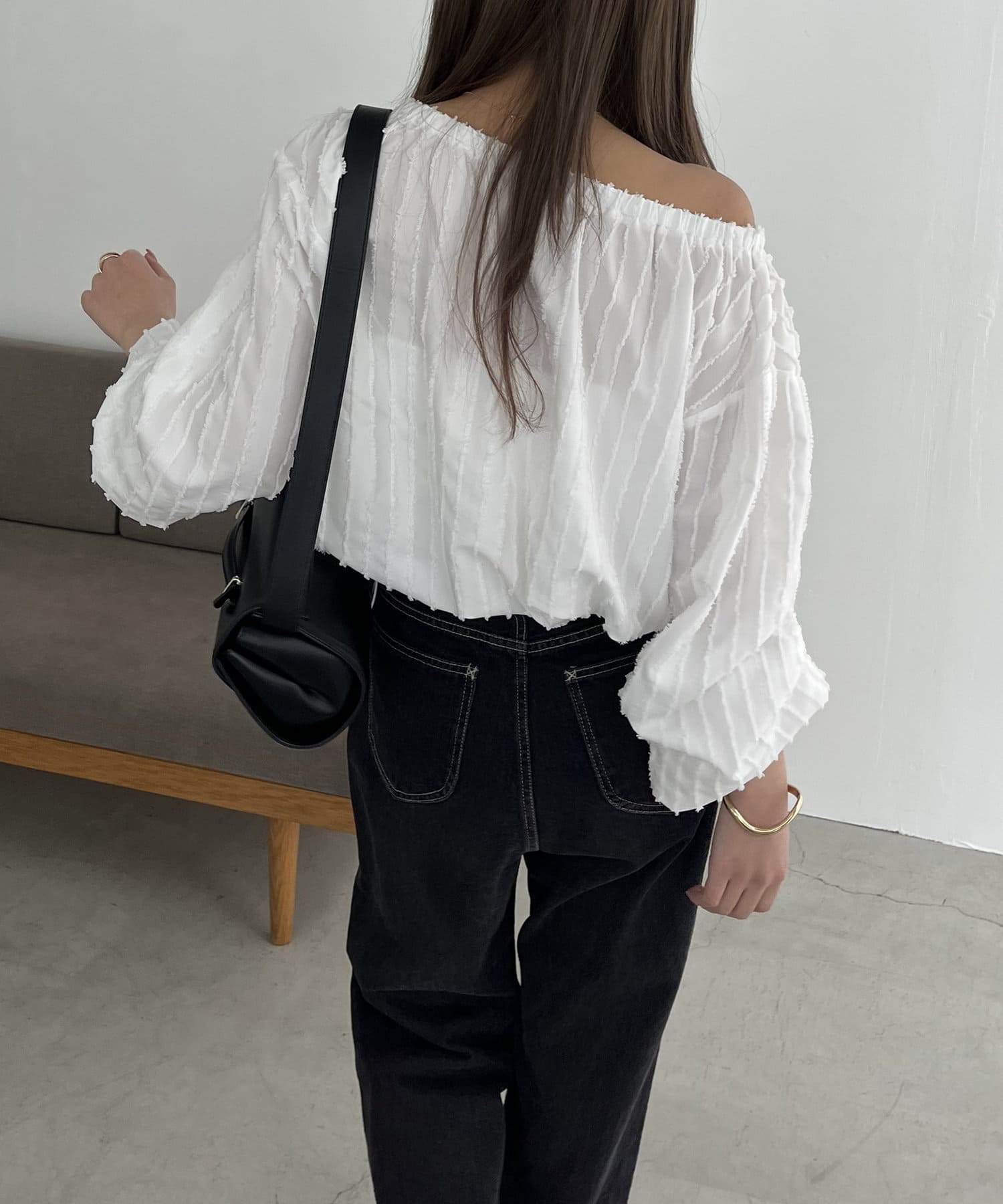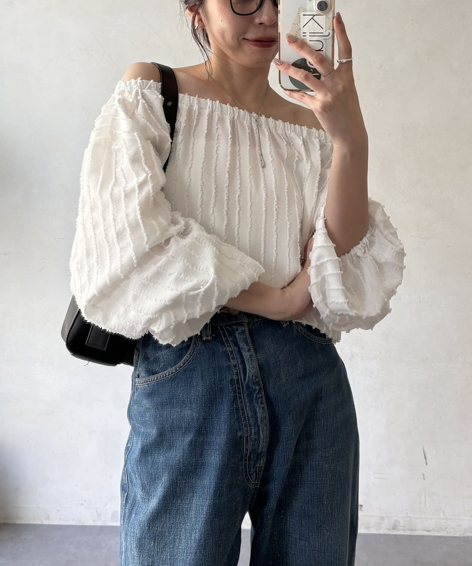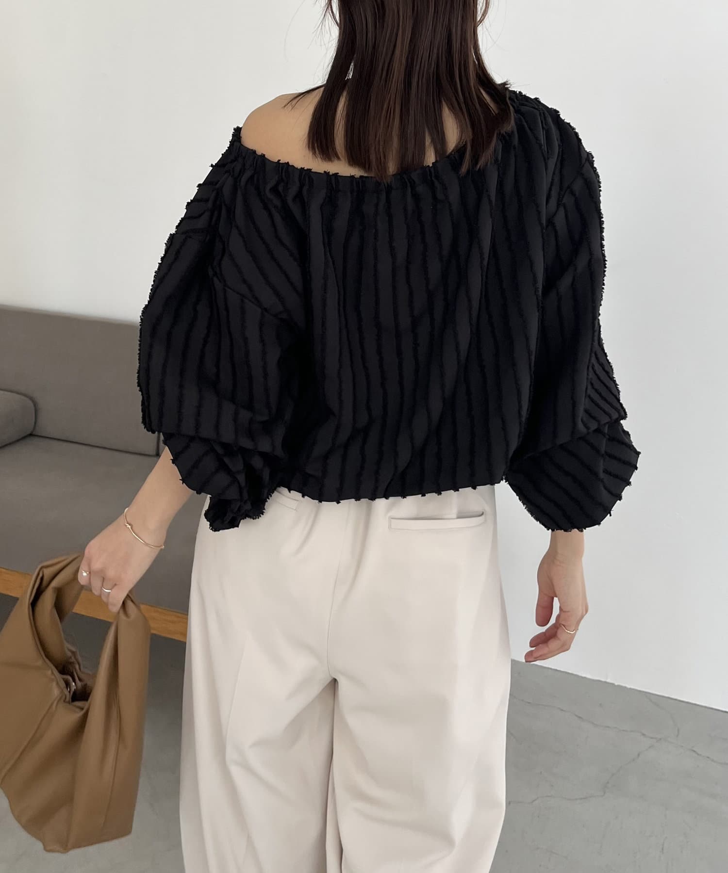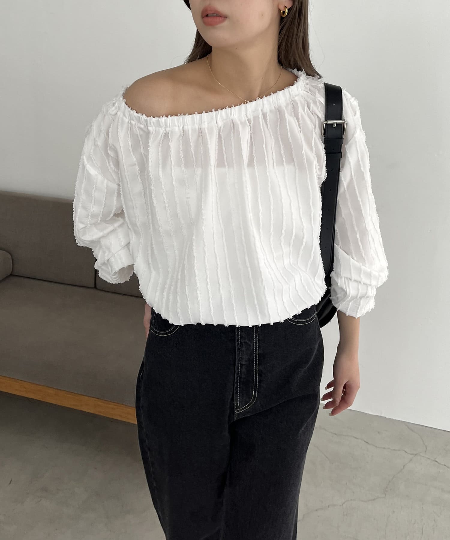 表面感あるカットオフデザインの生地が特徴的なブラウス