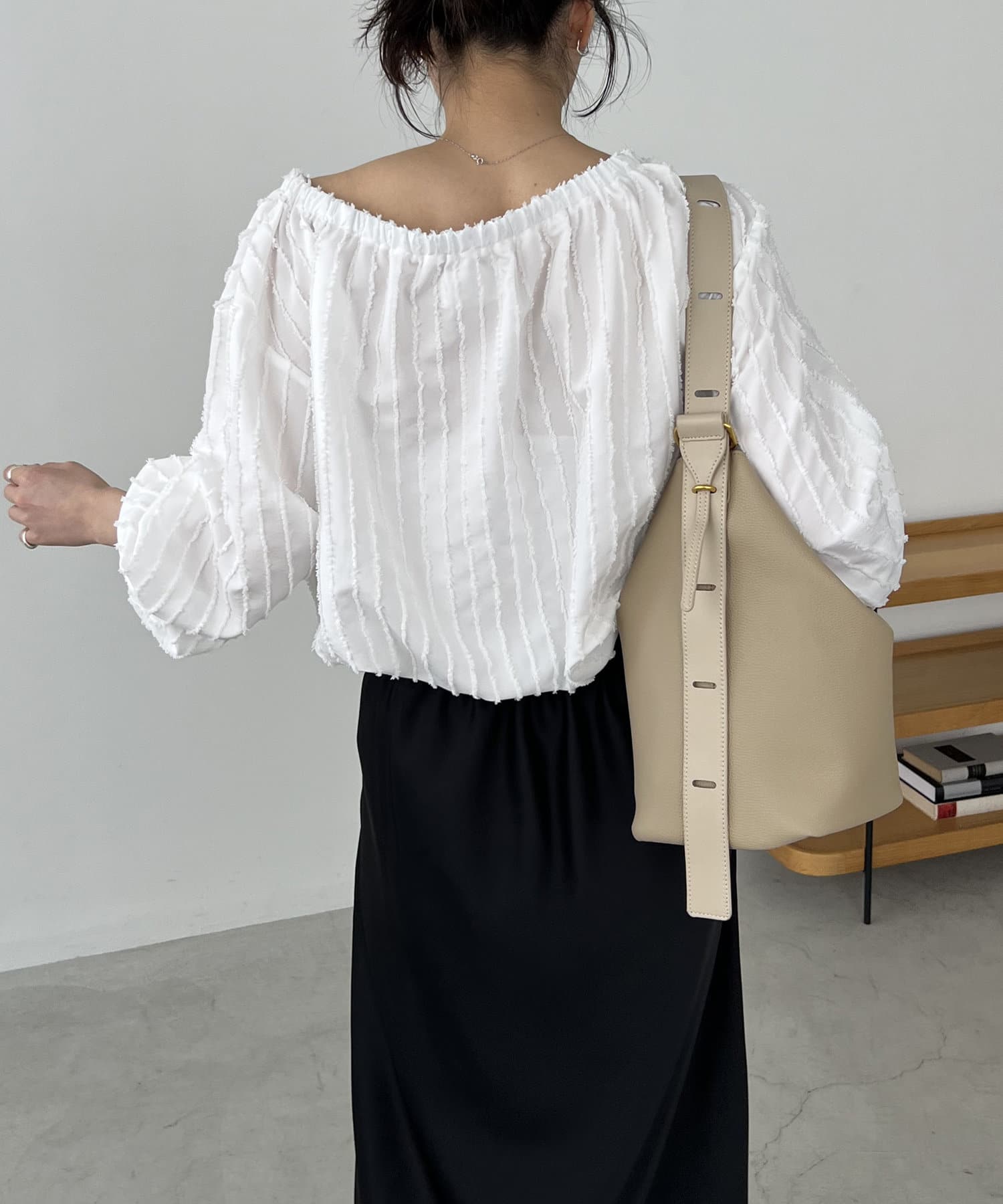 ・ネックにゴムが入っておりワンショルやオフショルで着用可能