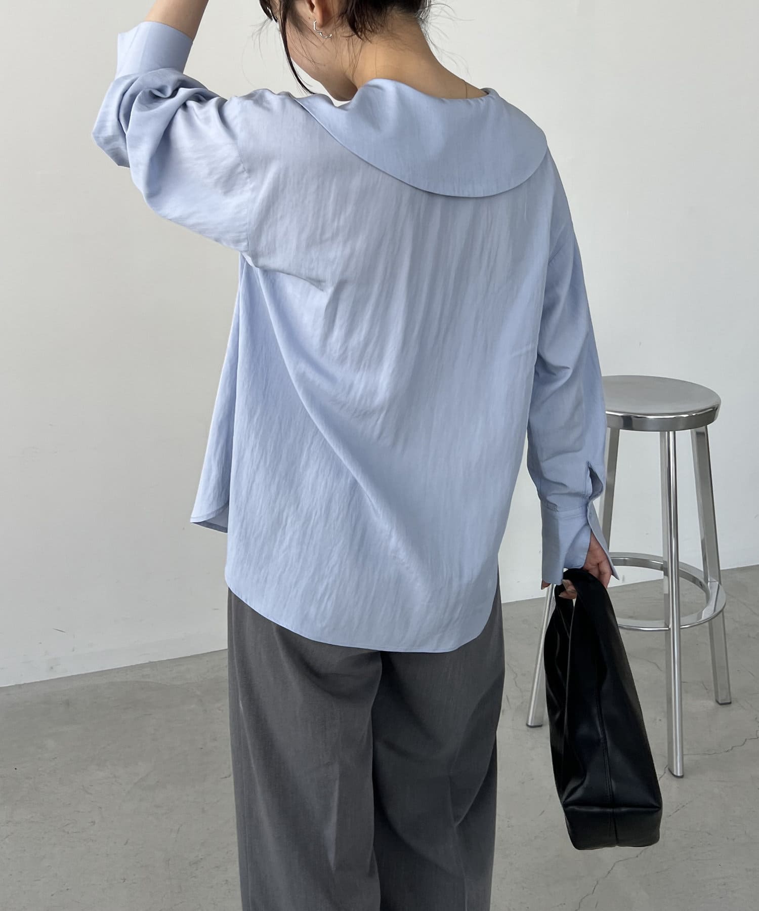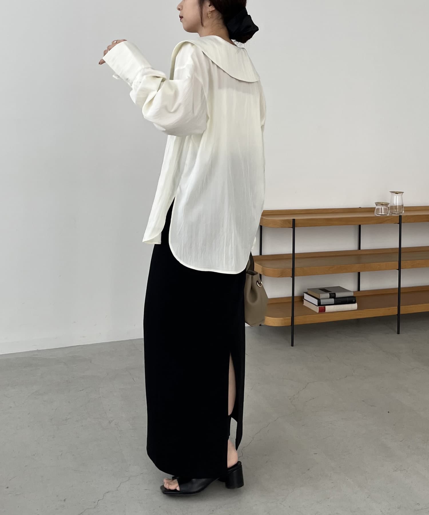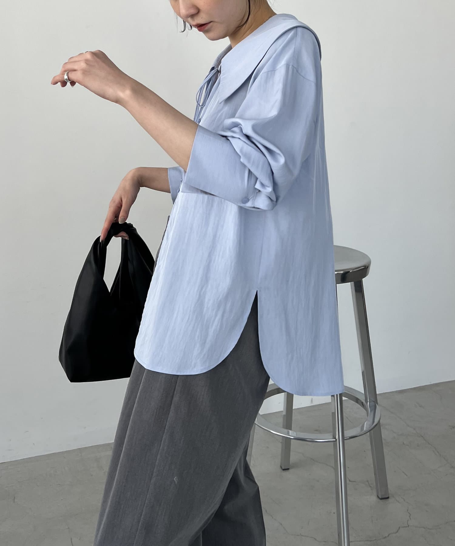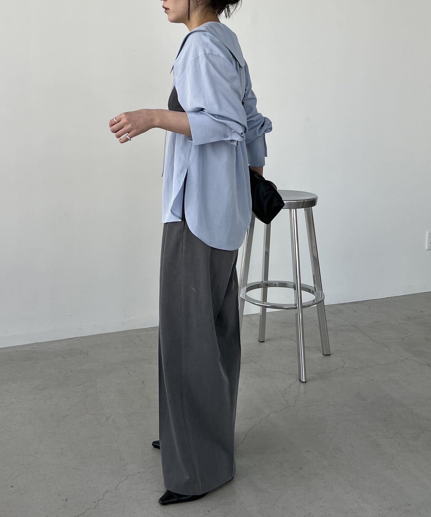 ・シャツはトレンドの大きめ襟で1枚でも着映え