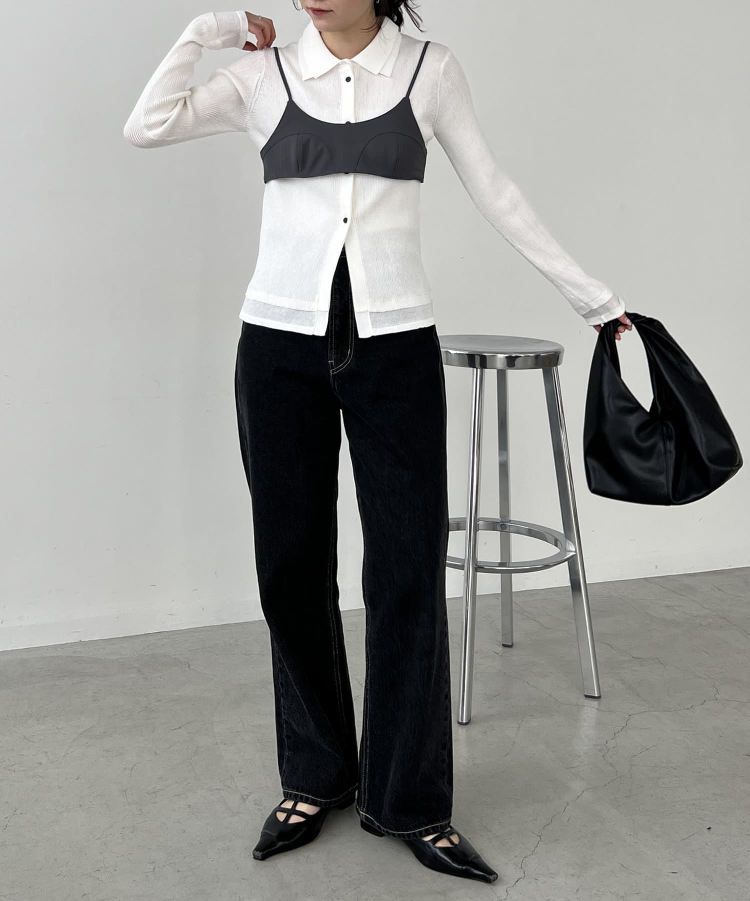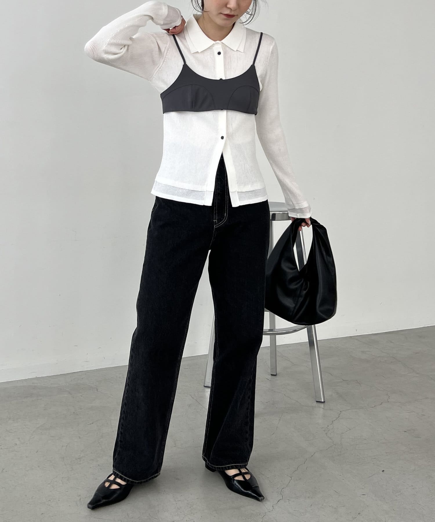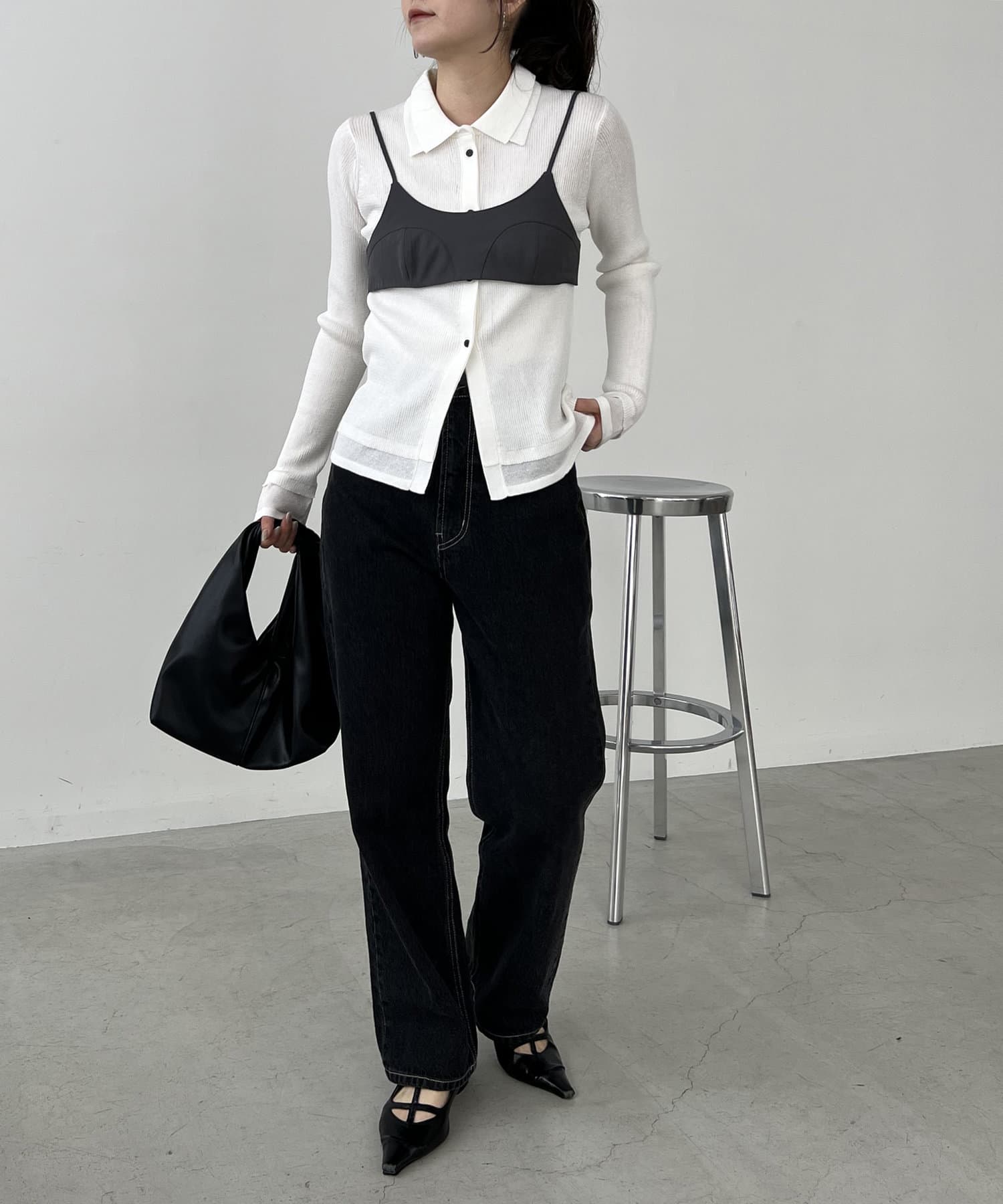 【ブルー着用アイテム②】トップス:2重襟リブカーディガン ボトムス:13ozハイウエストストレートデニム