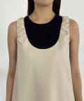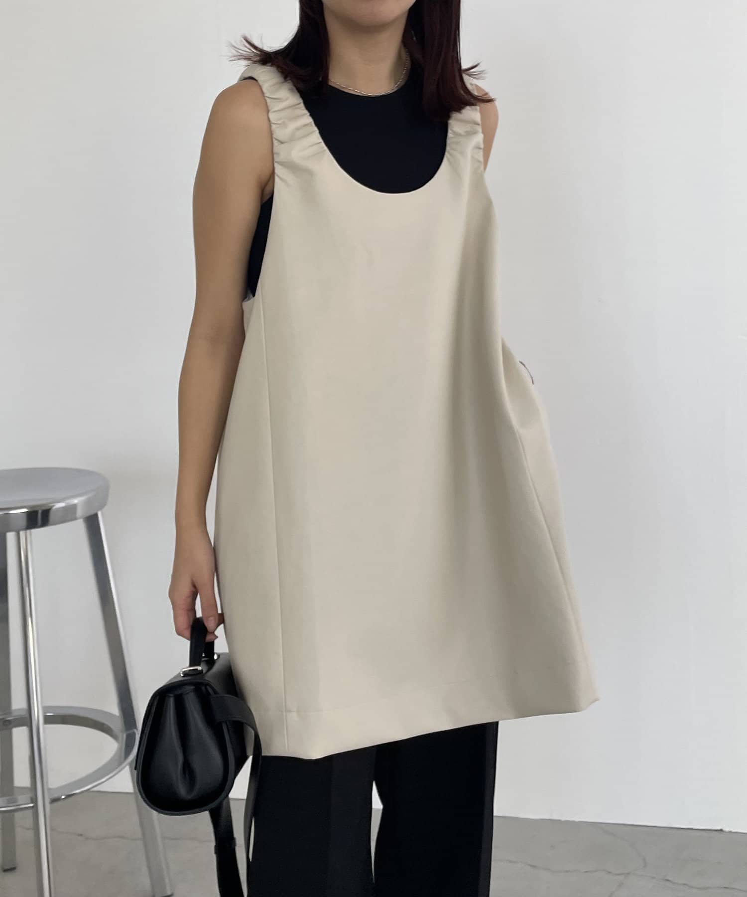・ウエストからヒップにかけて作る丸みのあるシルエットと、肩に施したギャザーデザインがポイント