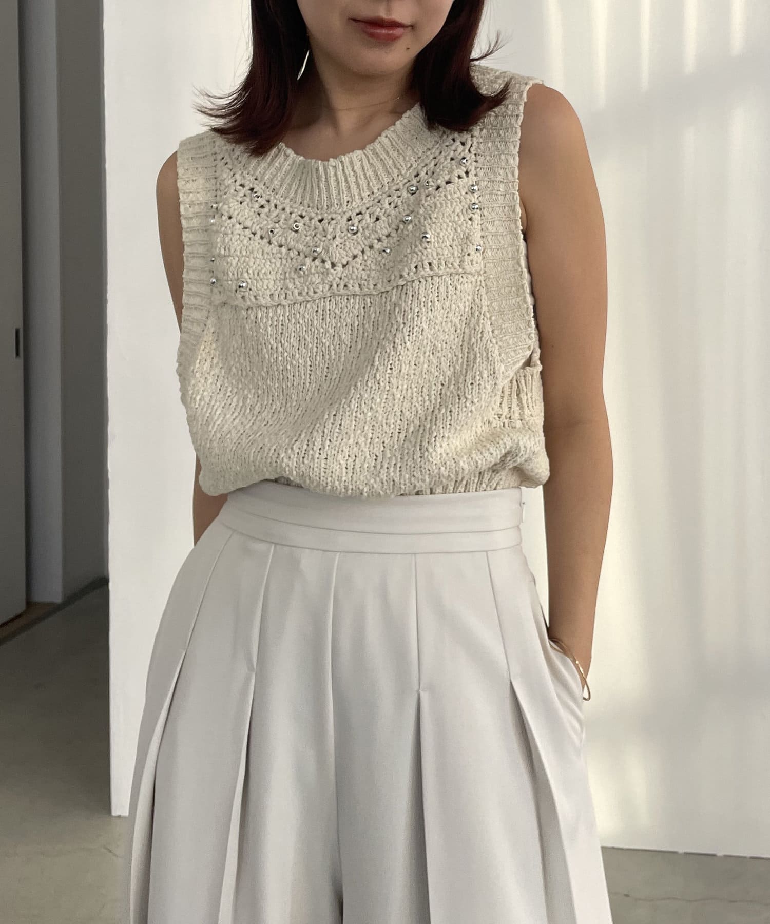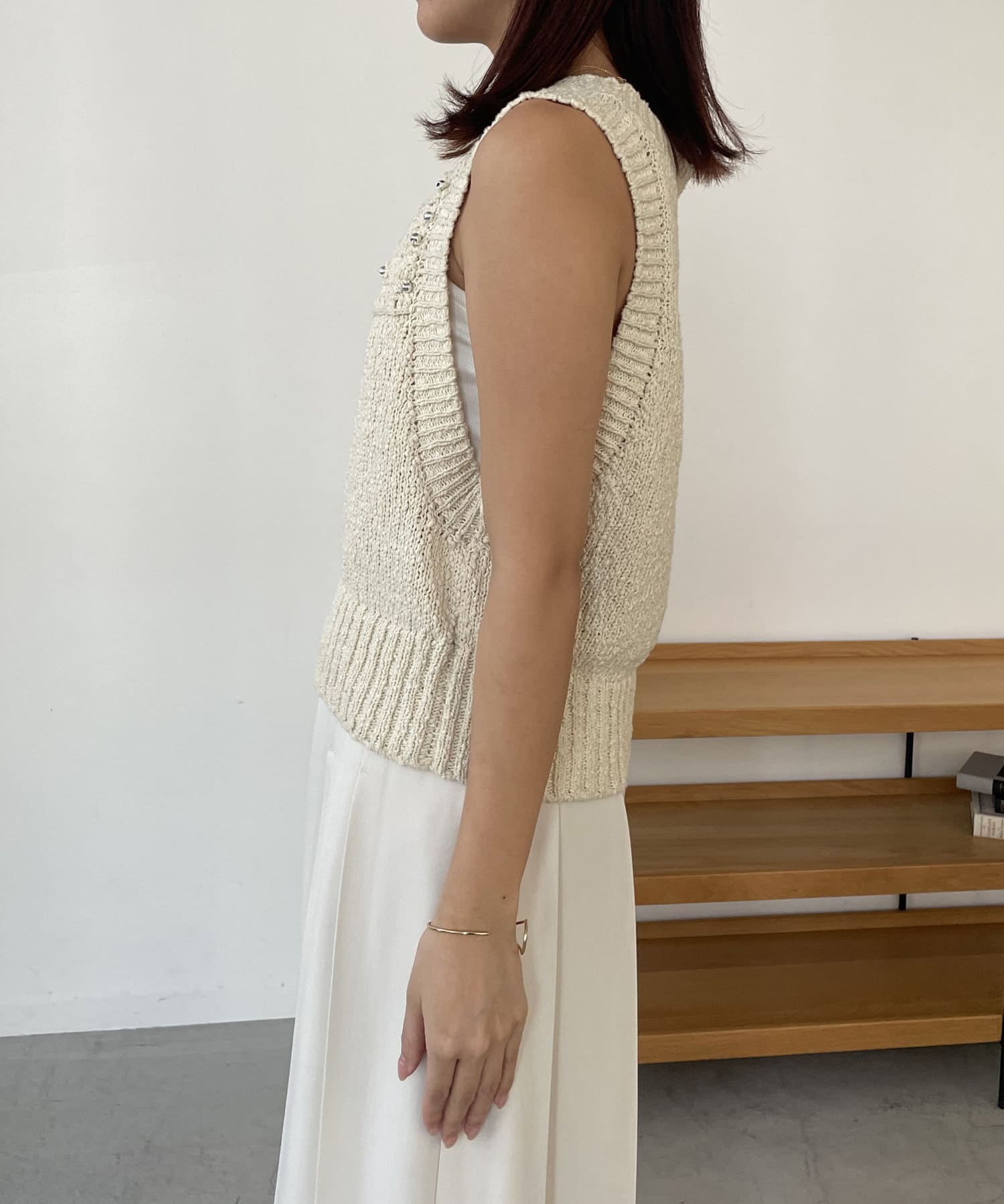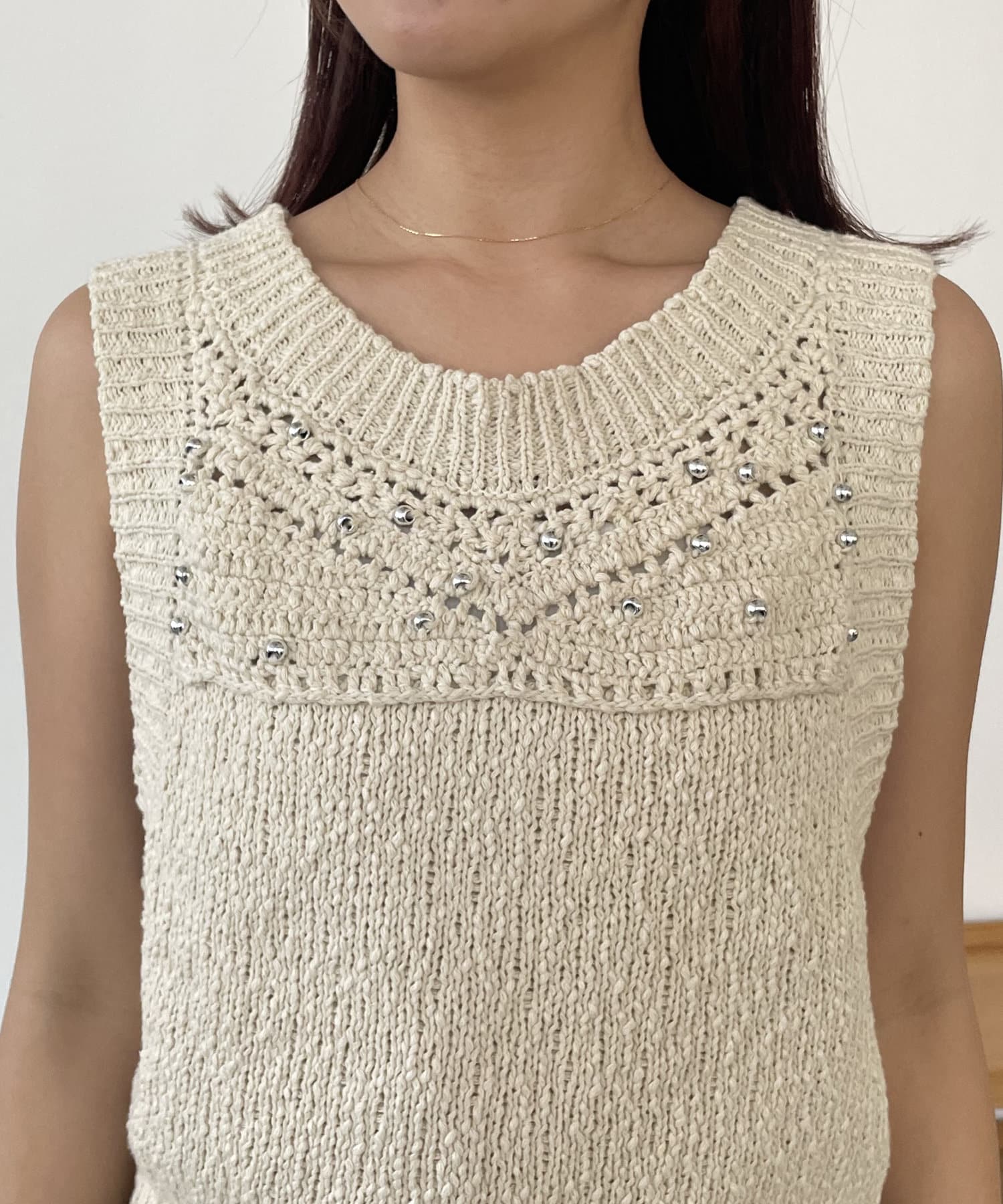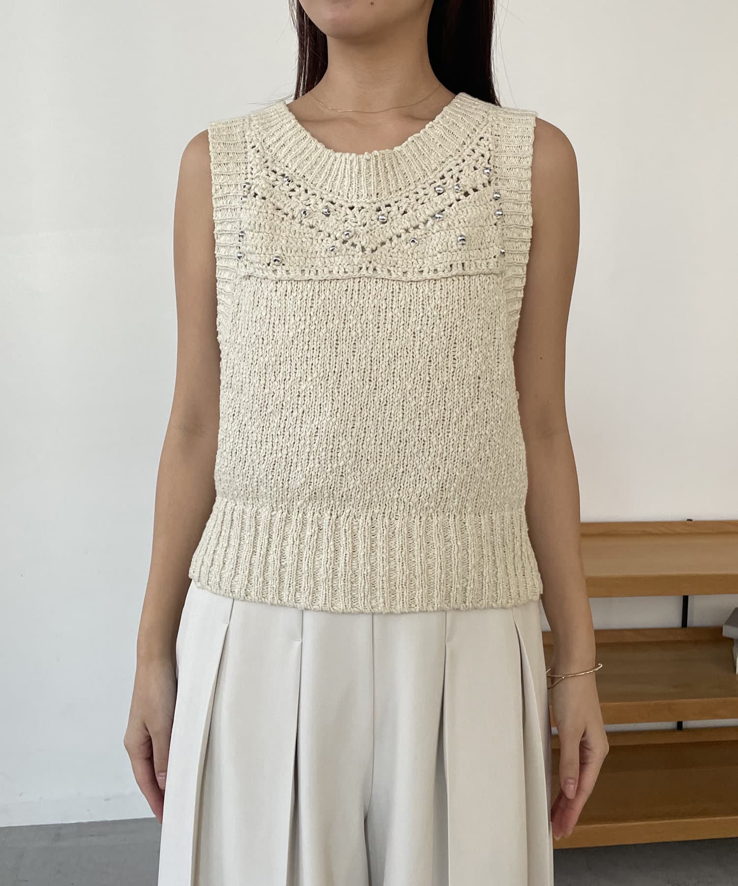 ・シルバーのメタルビーズを散らばせ、遊び心を加えたニットベスト