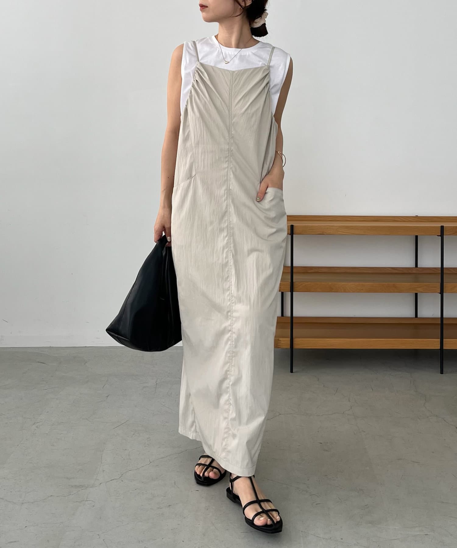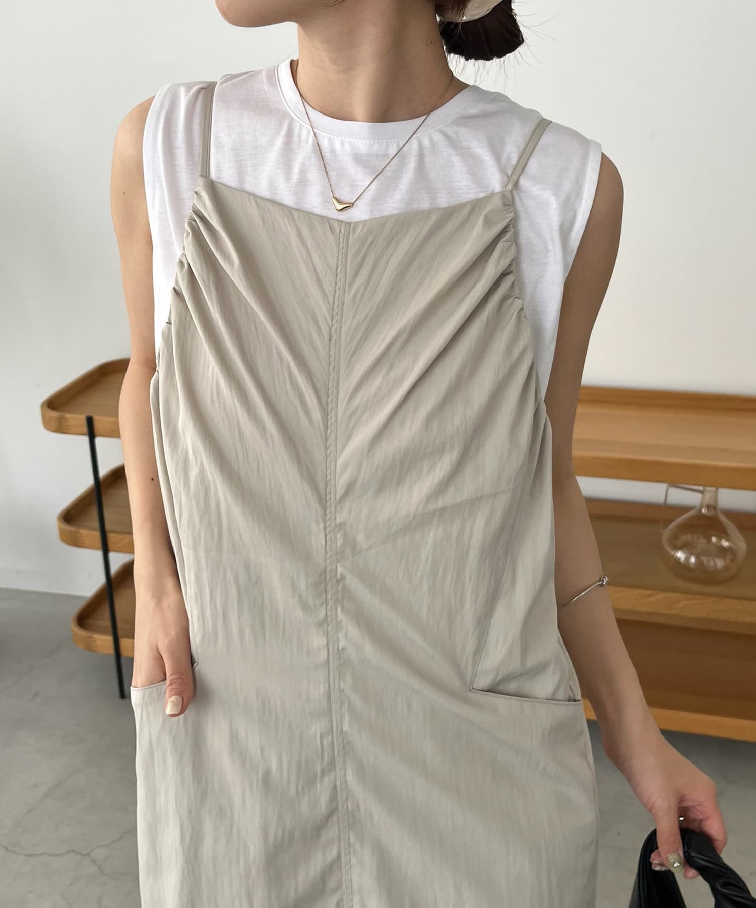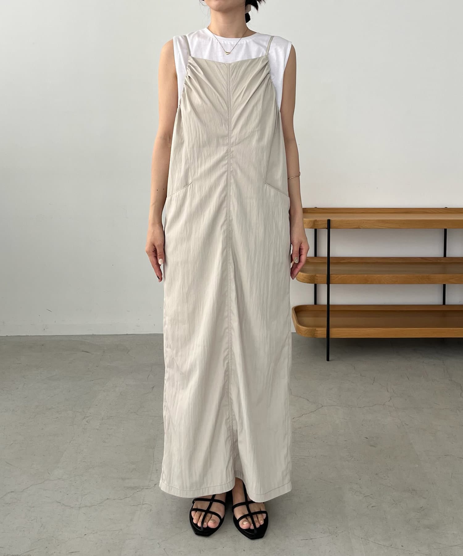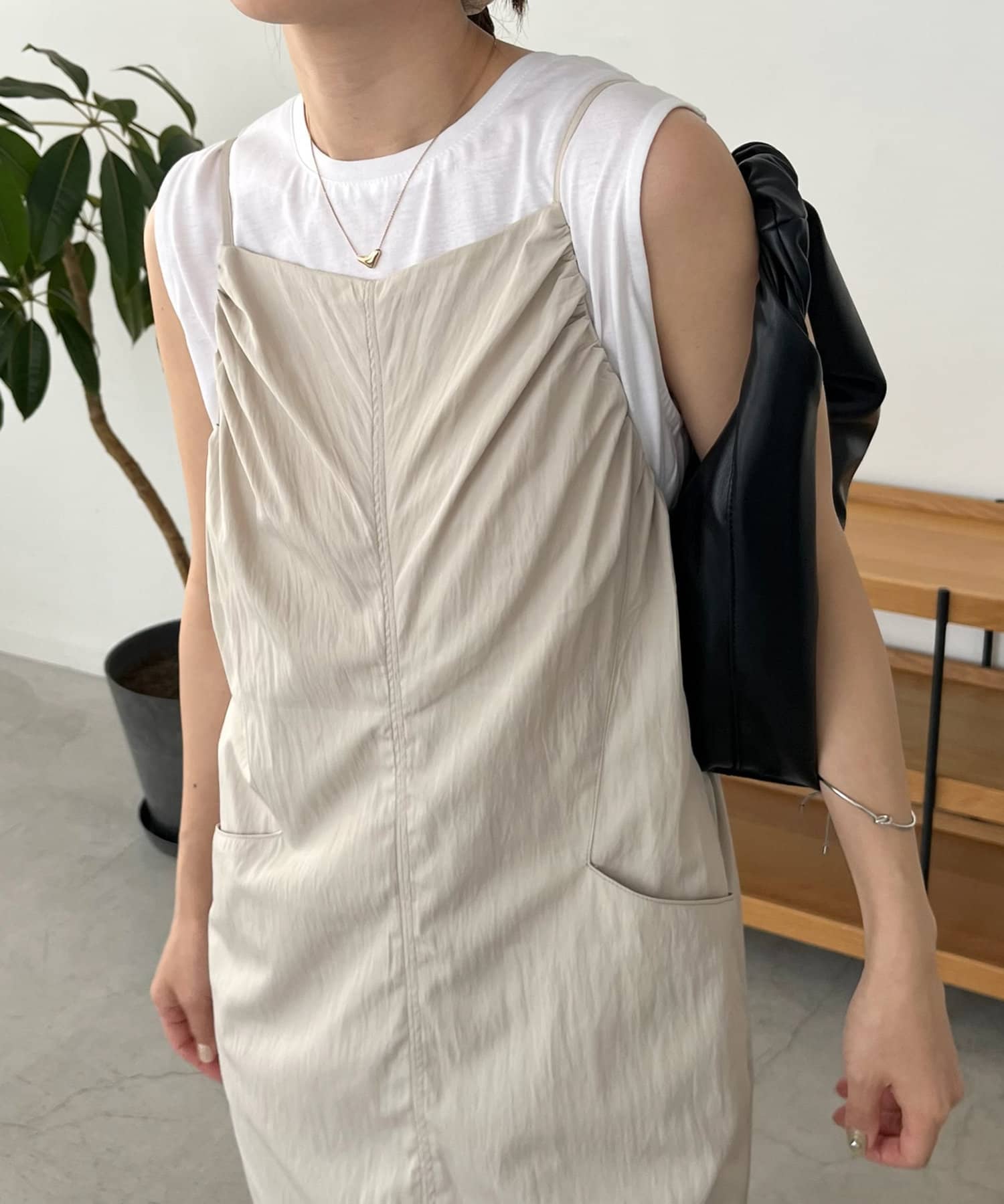 ・表面感のある素材で大人カジュアルに着られるキャミワンピース