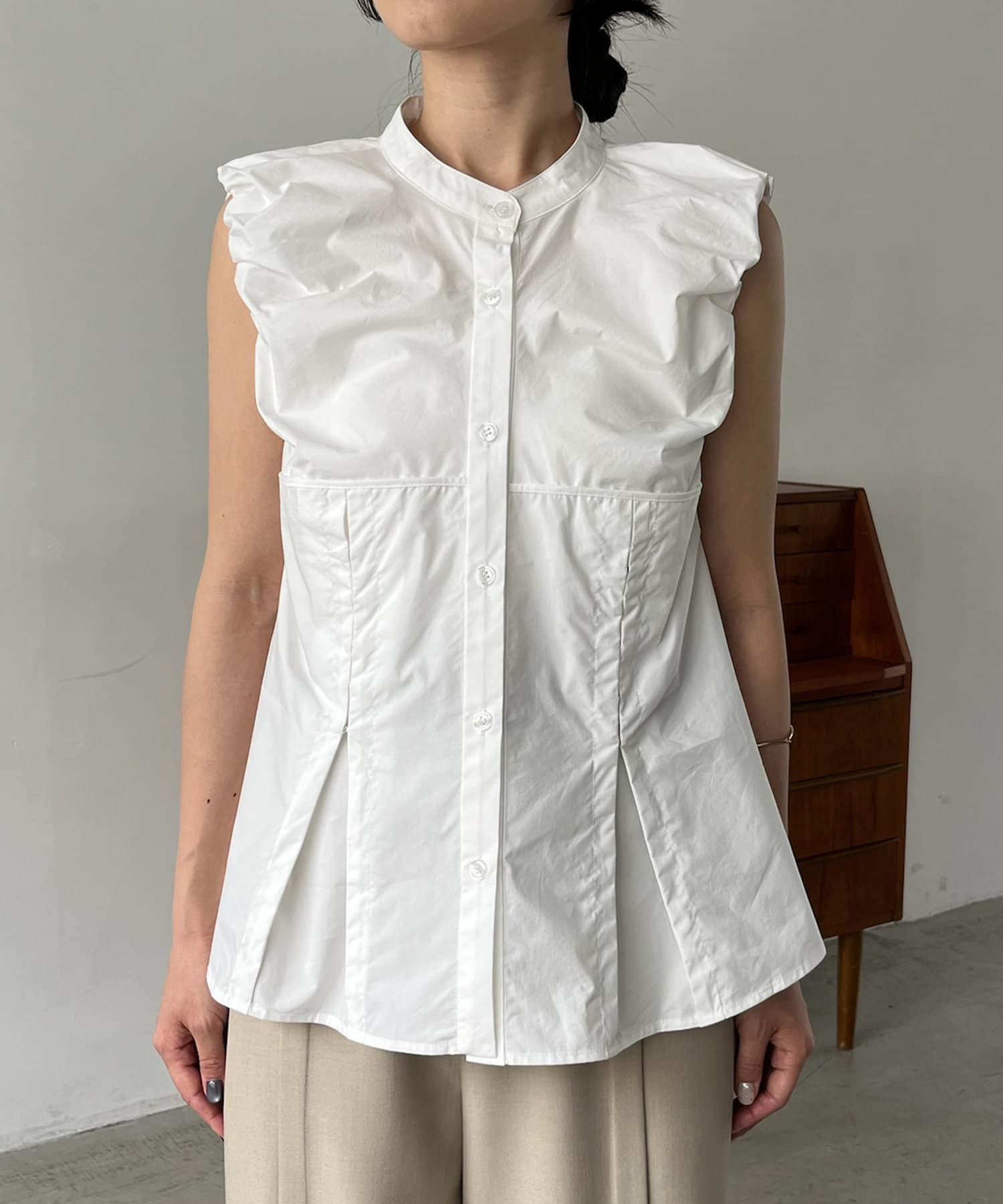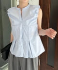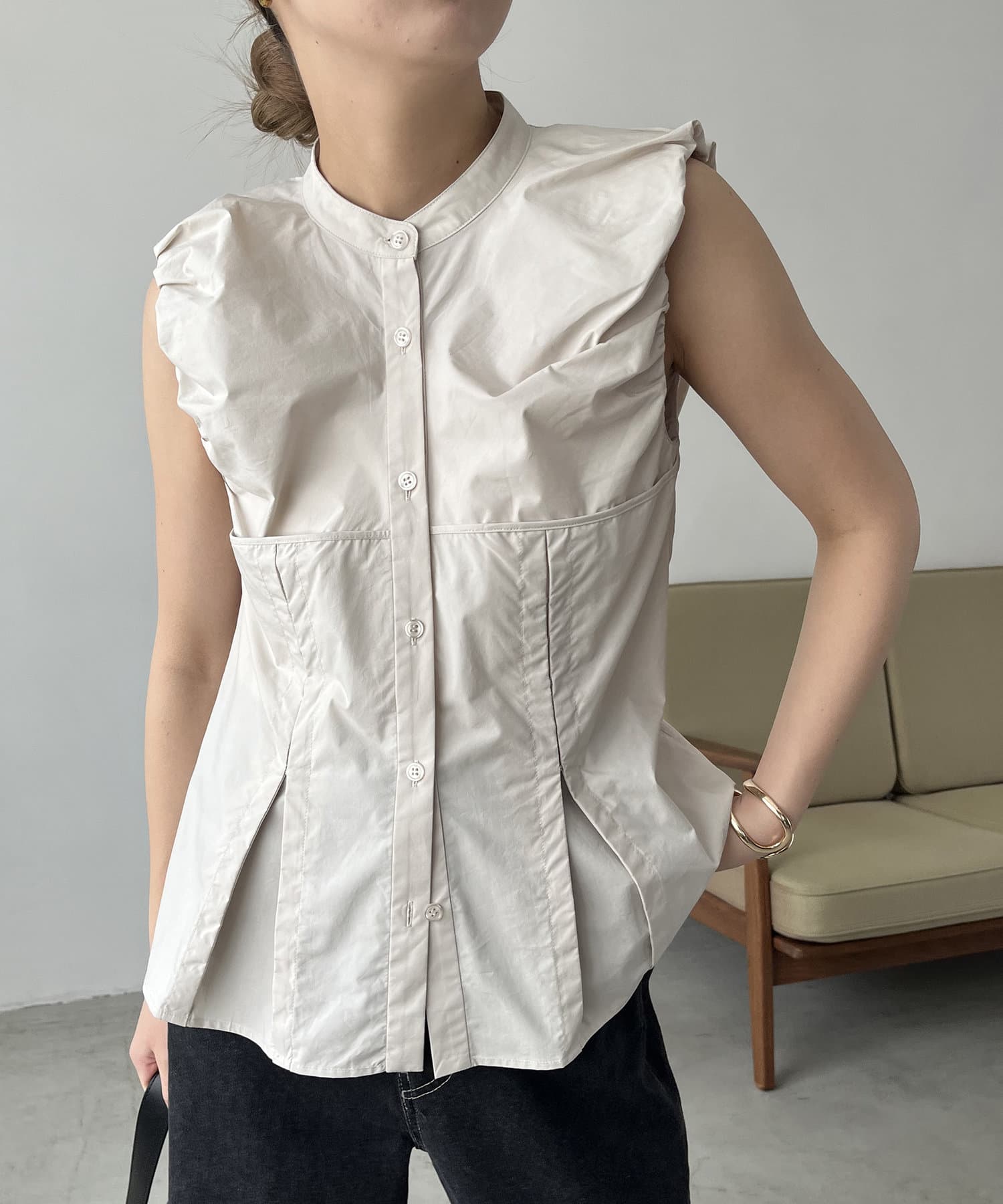 胸下のコルセットのような切替が女性らしいノースリシャツ
