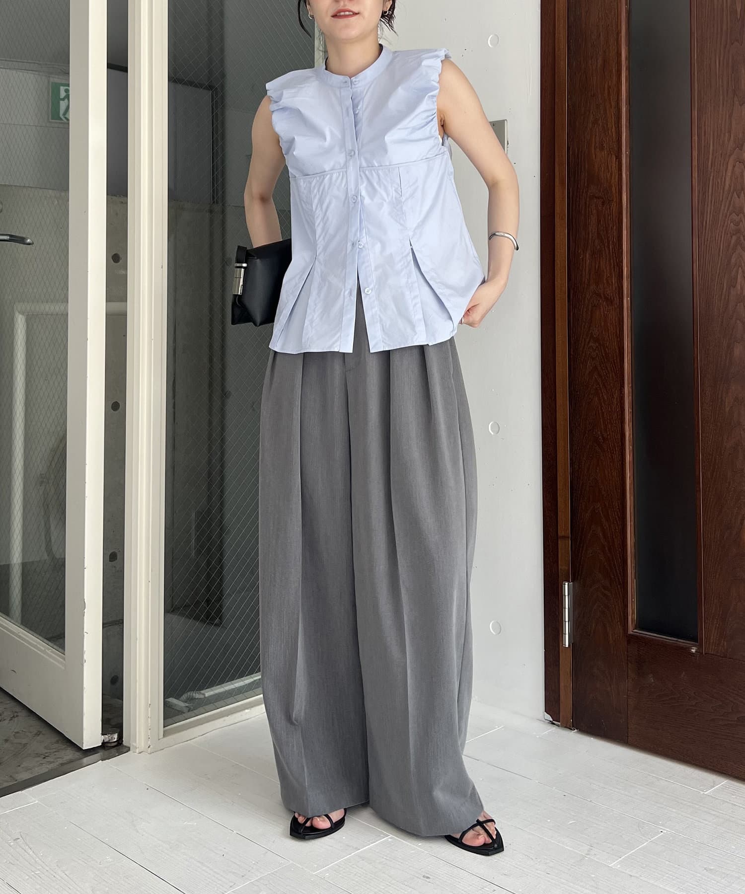 ・裾のボタンを開けてワイドパンツに合わせて