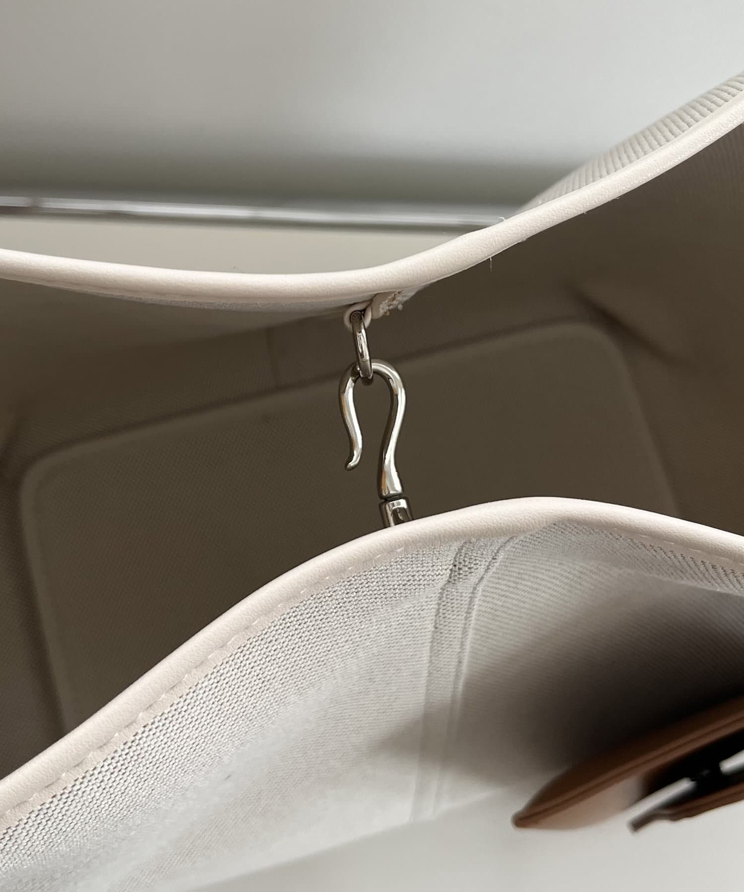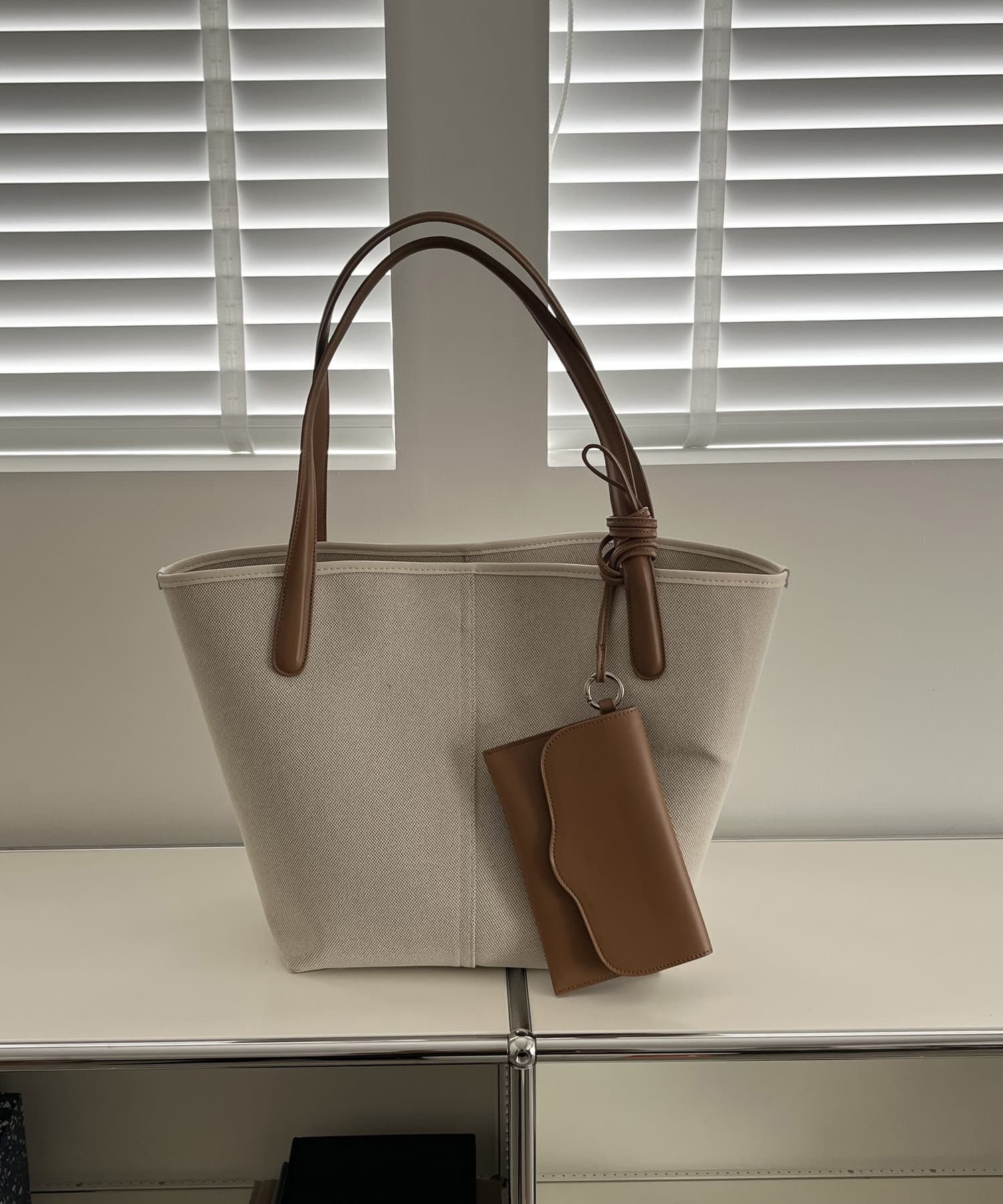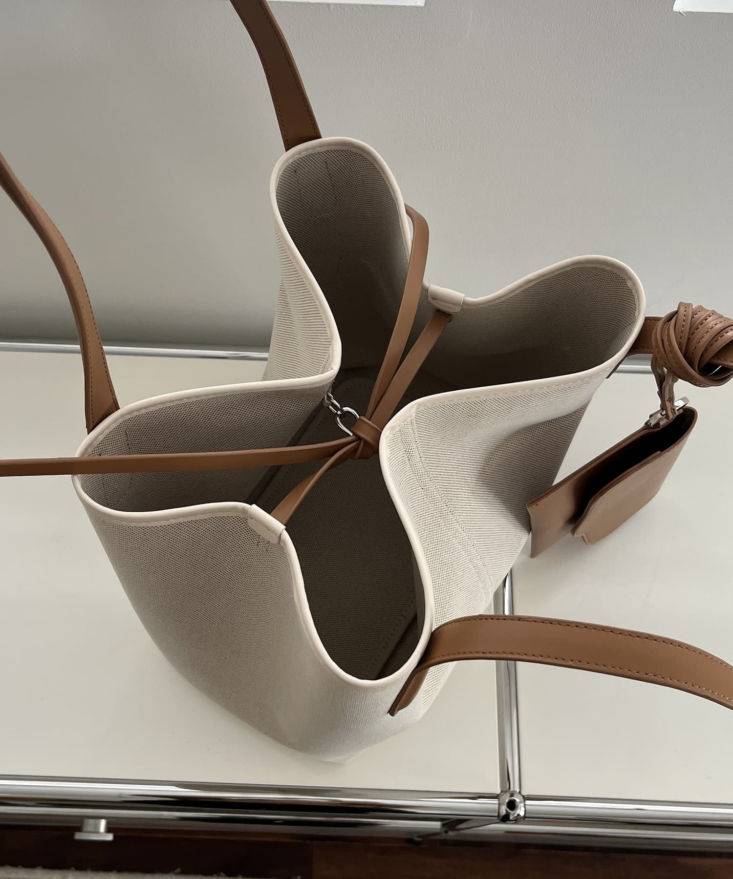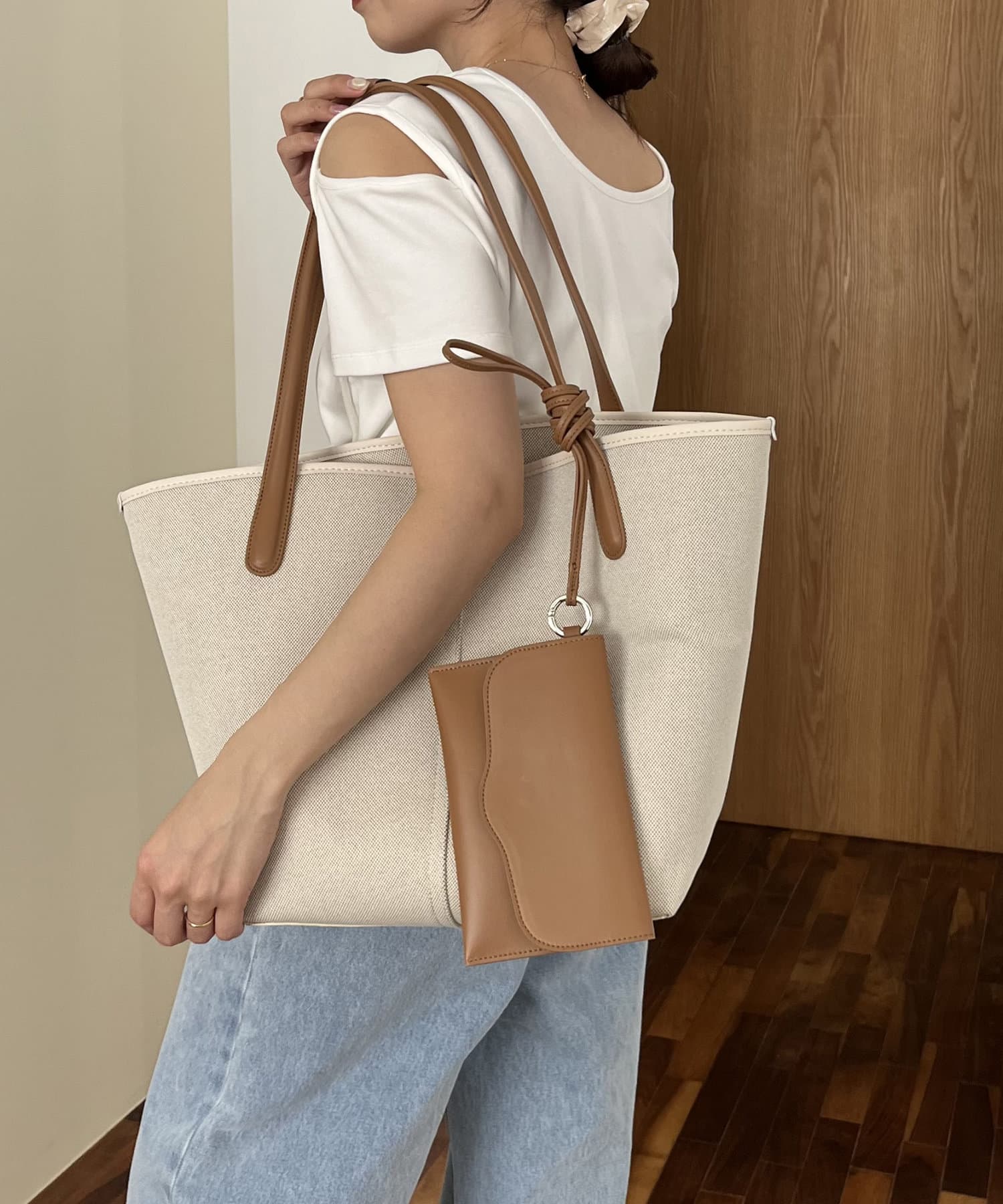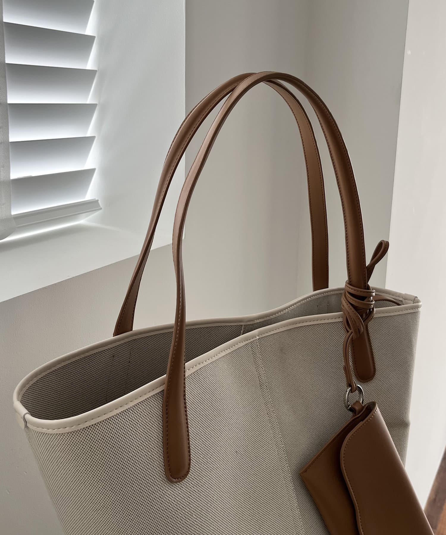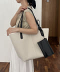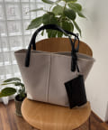 ・ボディとハンドル、付属のポーチが異素材でバイカラーに切り替わったデザイン