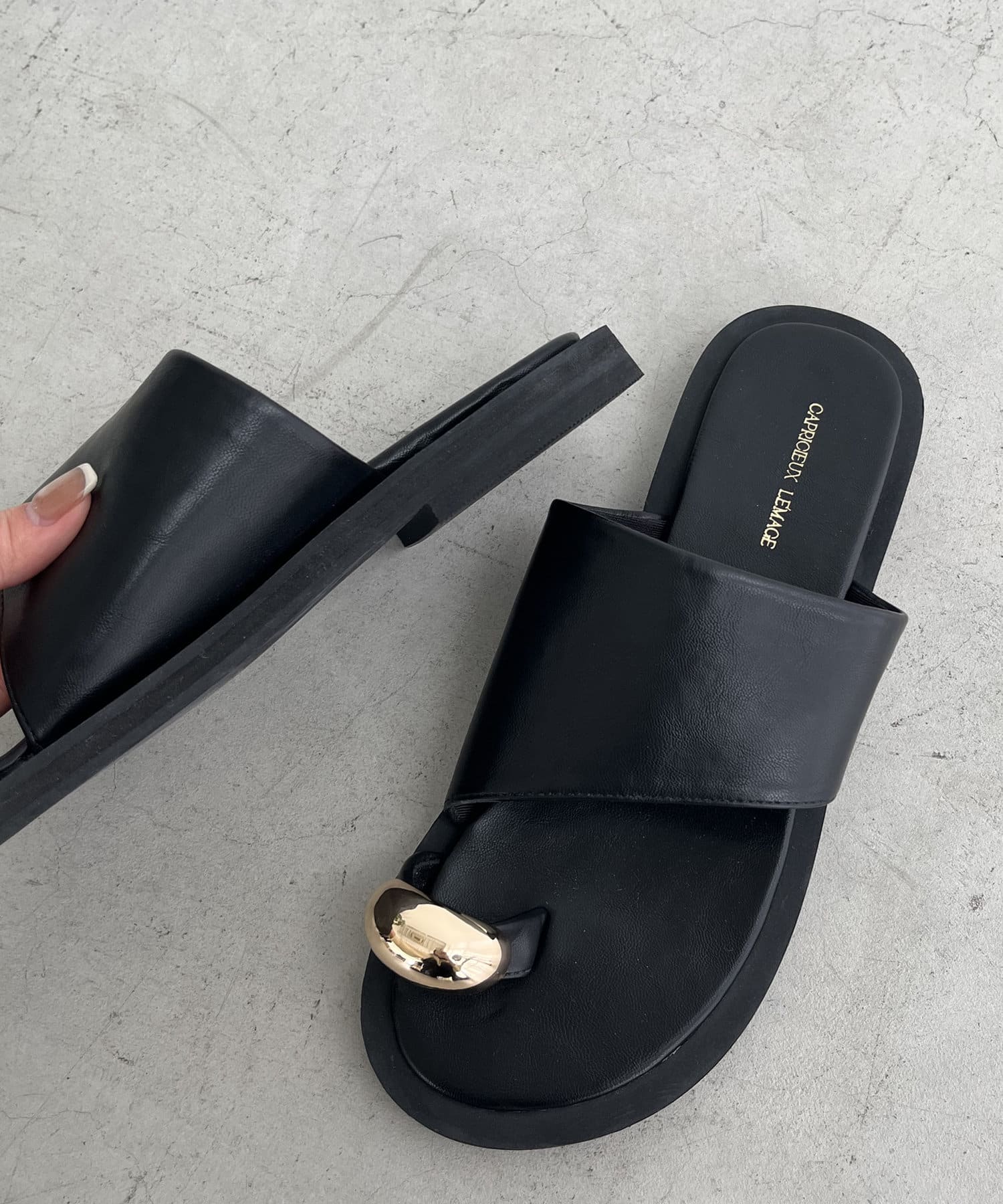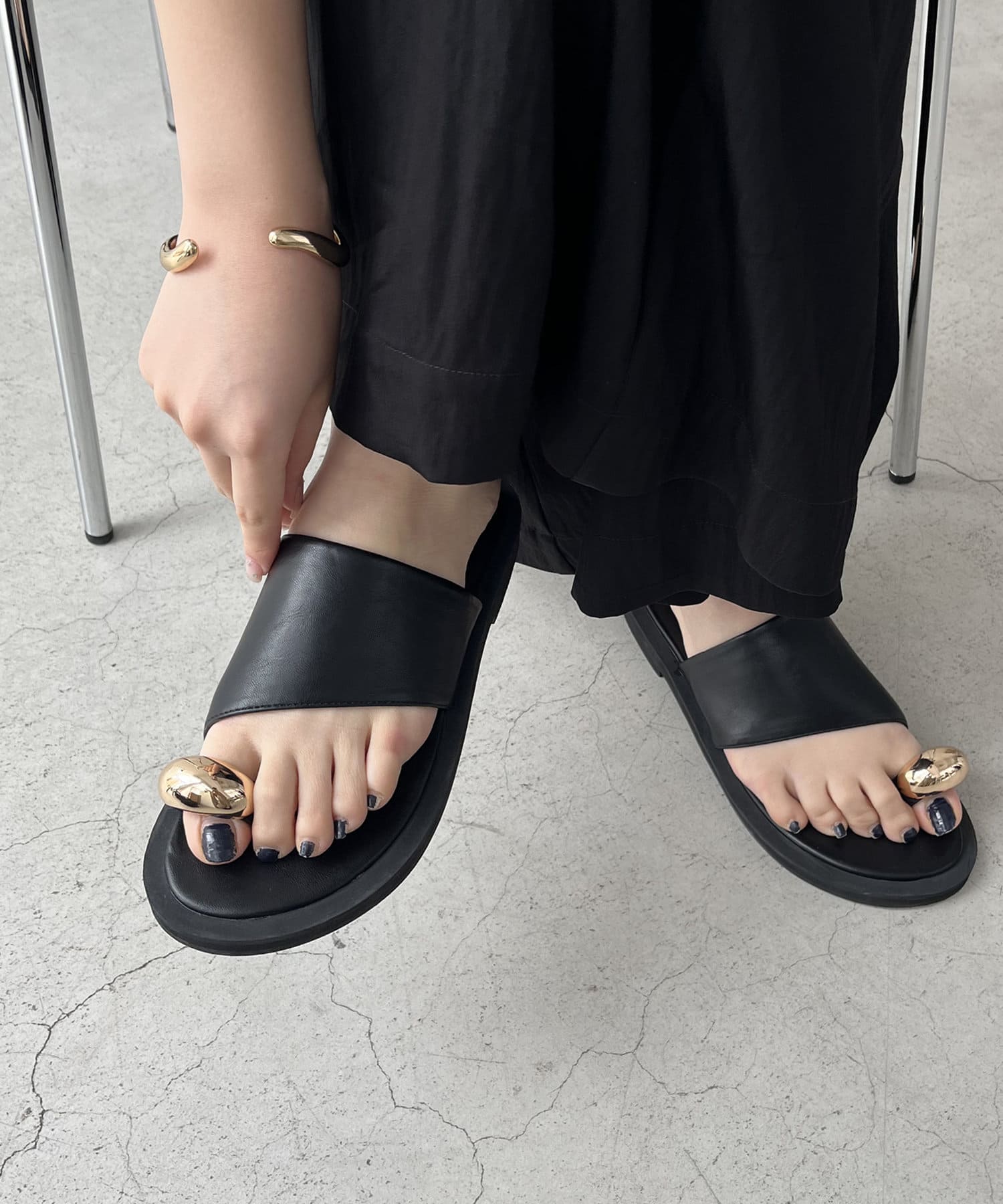 ・トング部分にメタリックパーツが付いたこなれ感漂うフラットサンダル