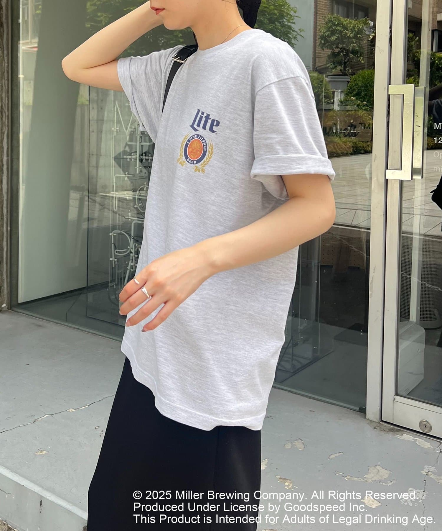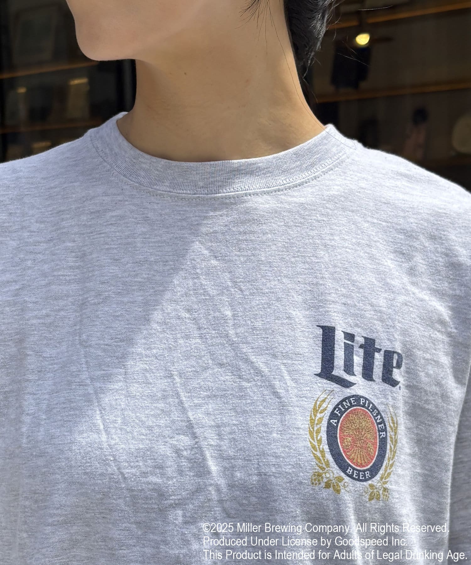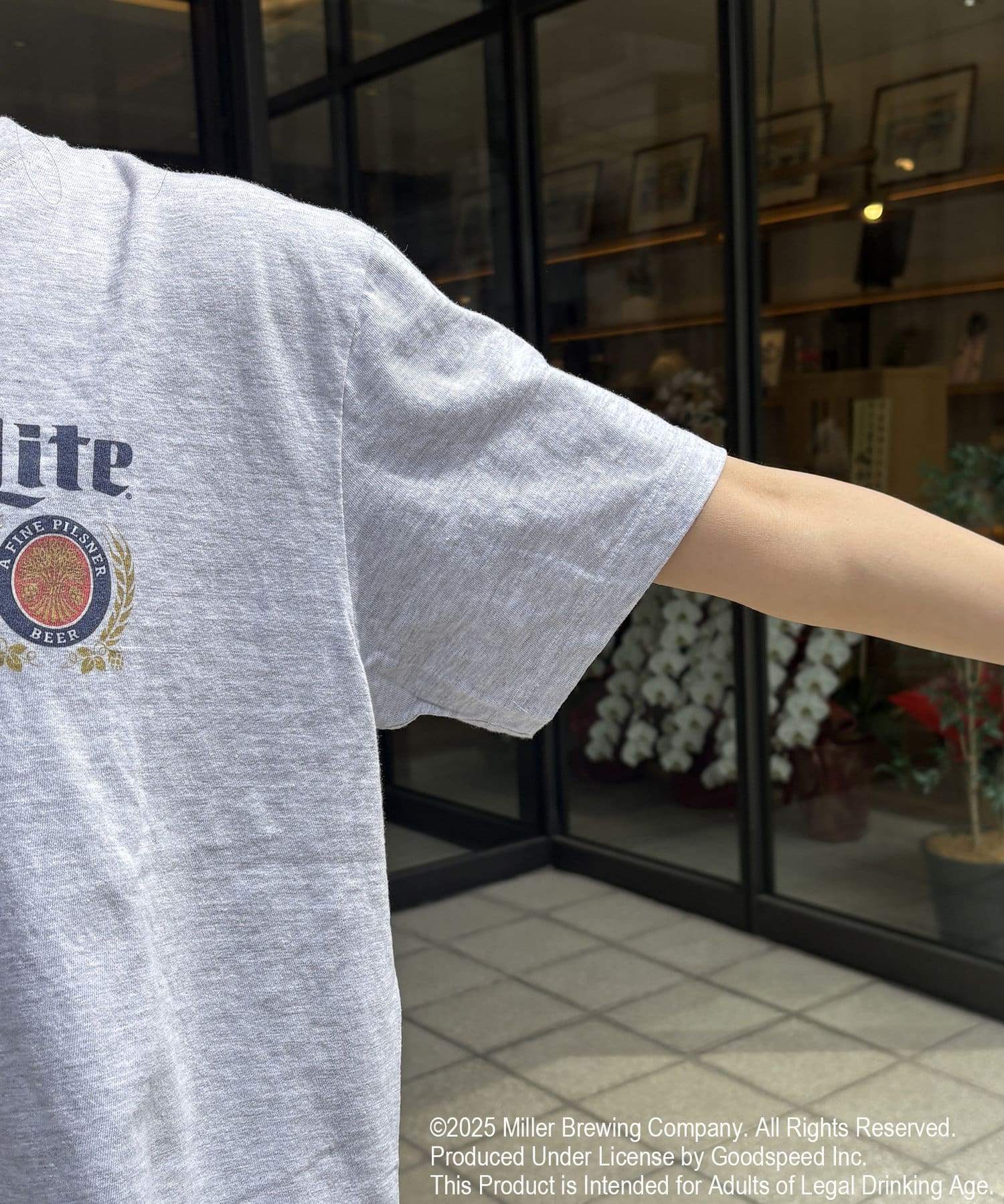 アメリカのビールブランド「ミラーライト」のロゴがプリントされた半袖Tシャツ