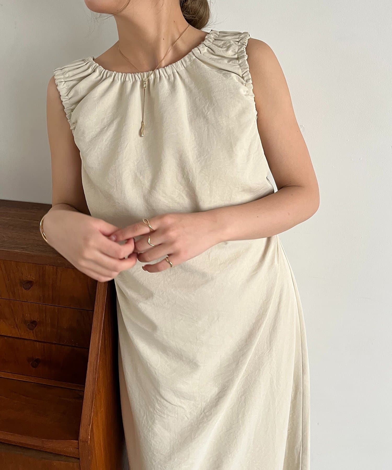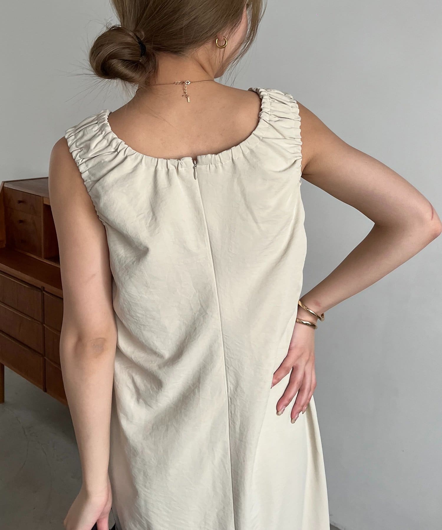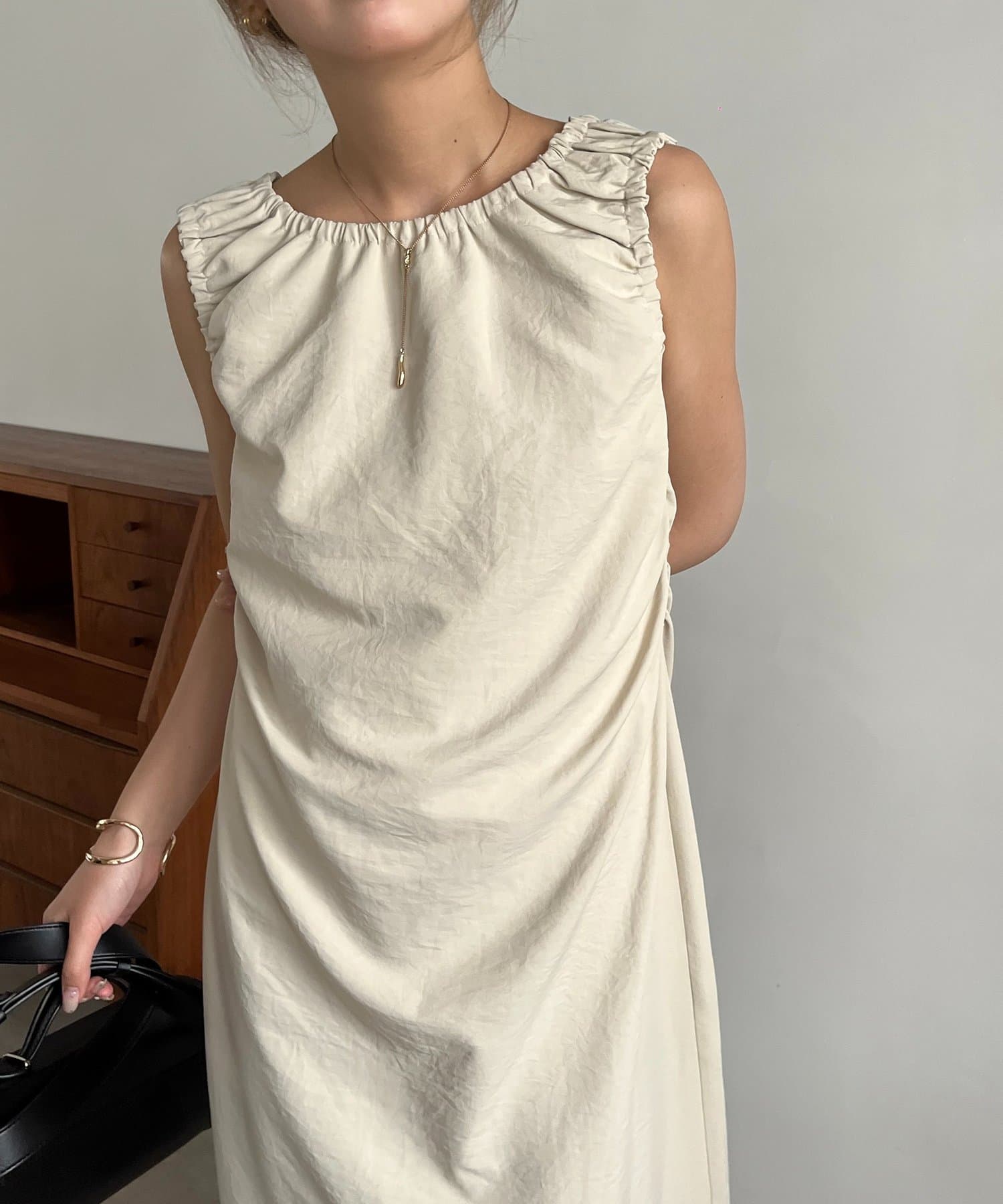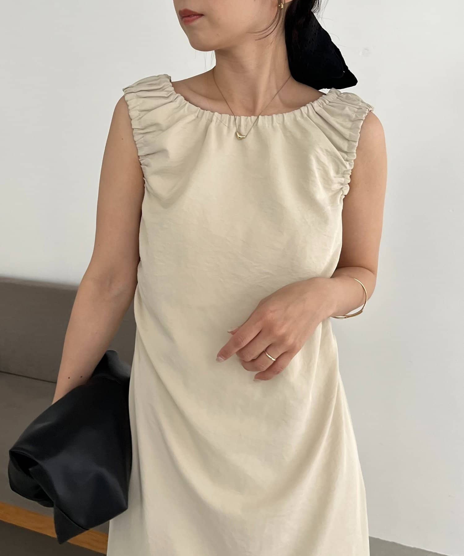 ・肩周りのギャザーがポイントの大人シンプルなワンピース