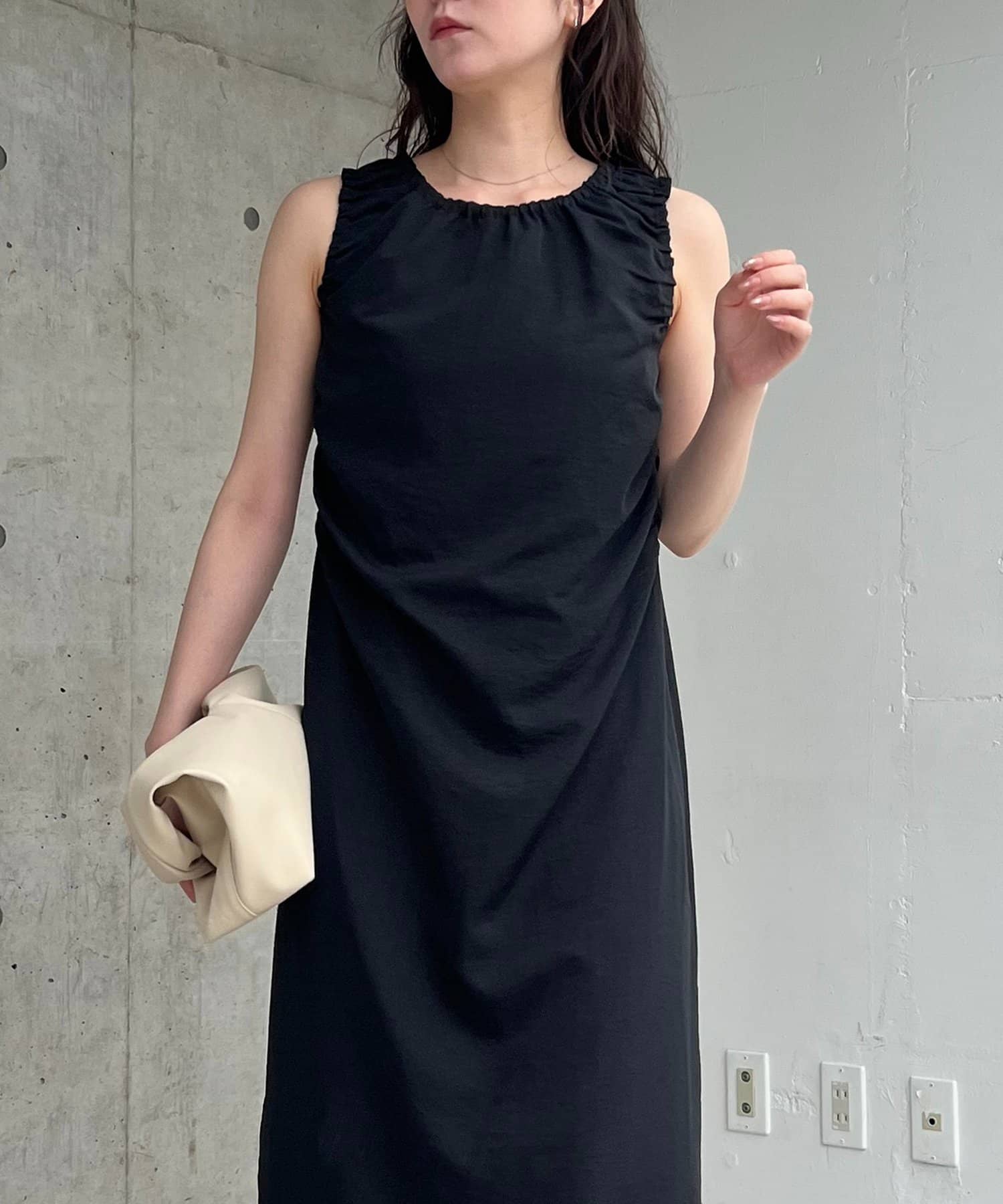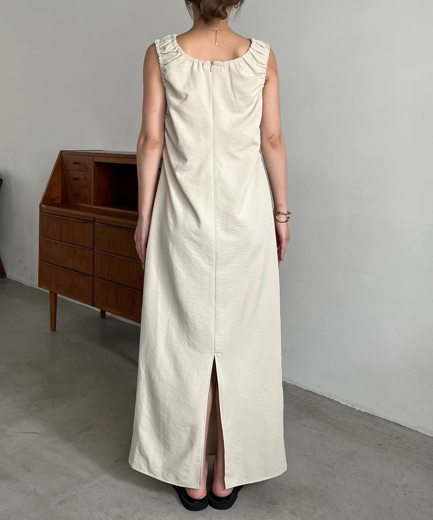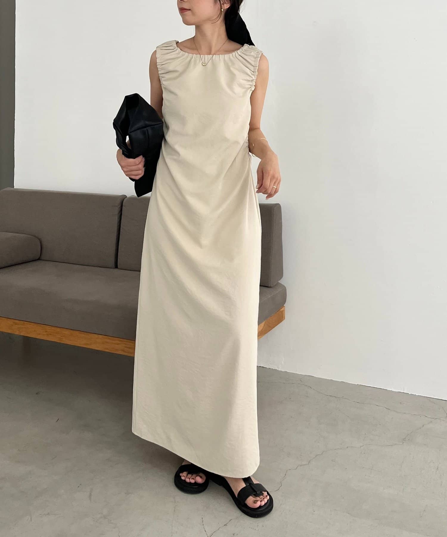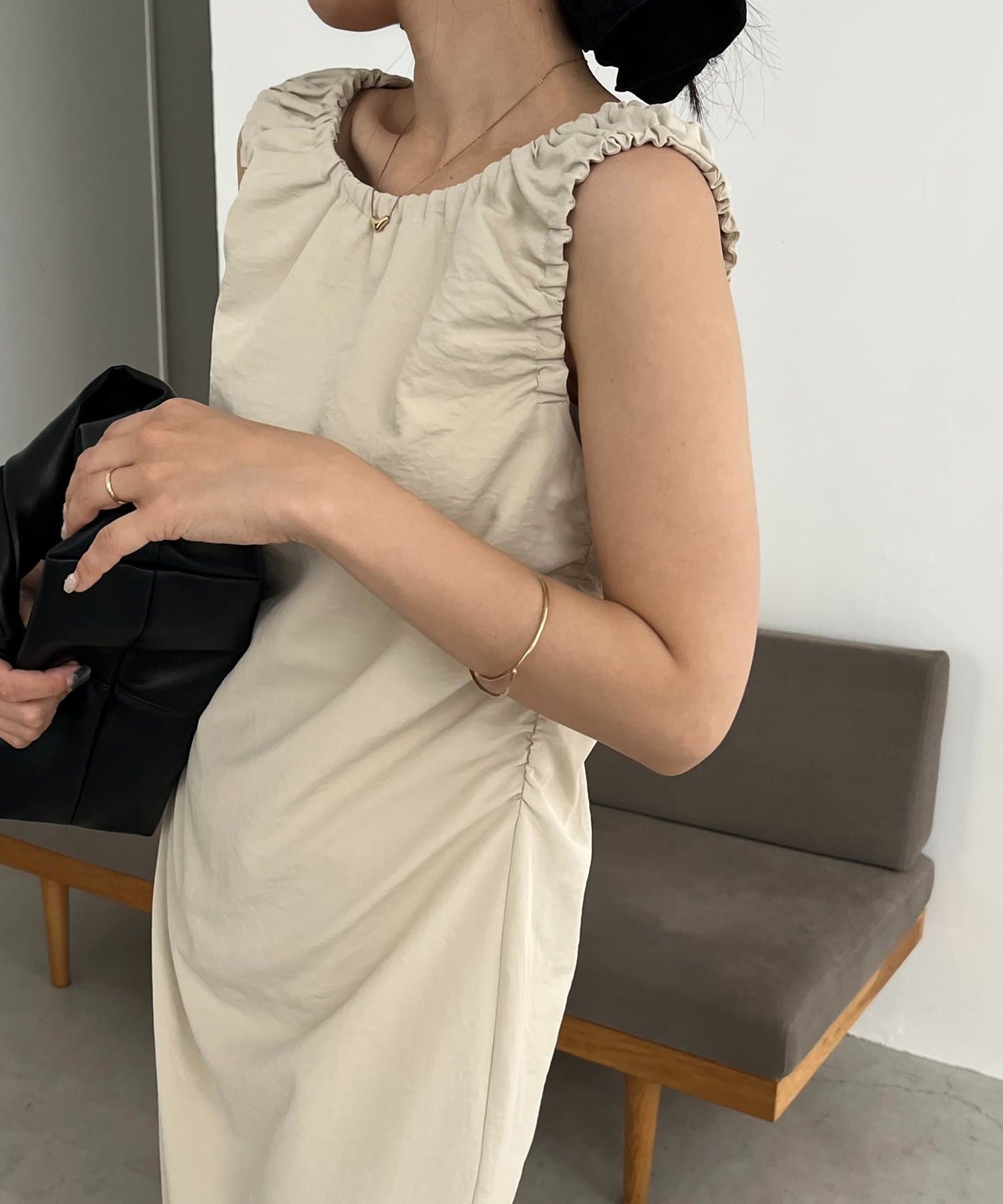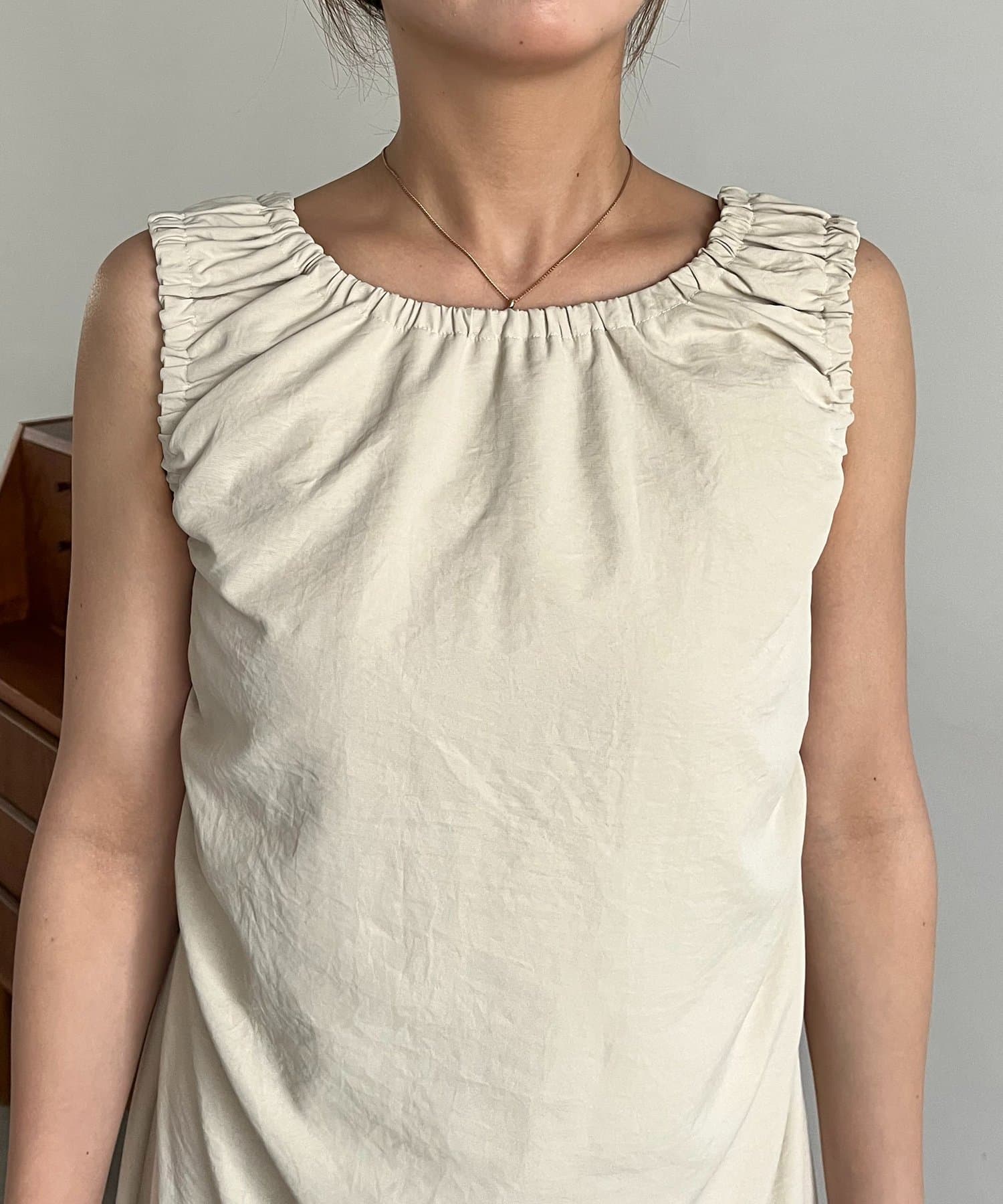 ・肩周りのギャザーがポイントの大人シンプルなワンピース