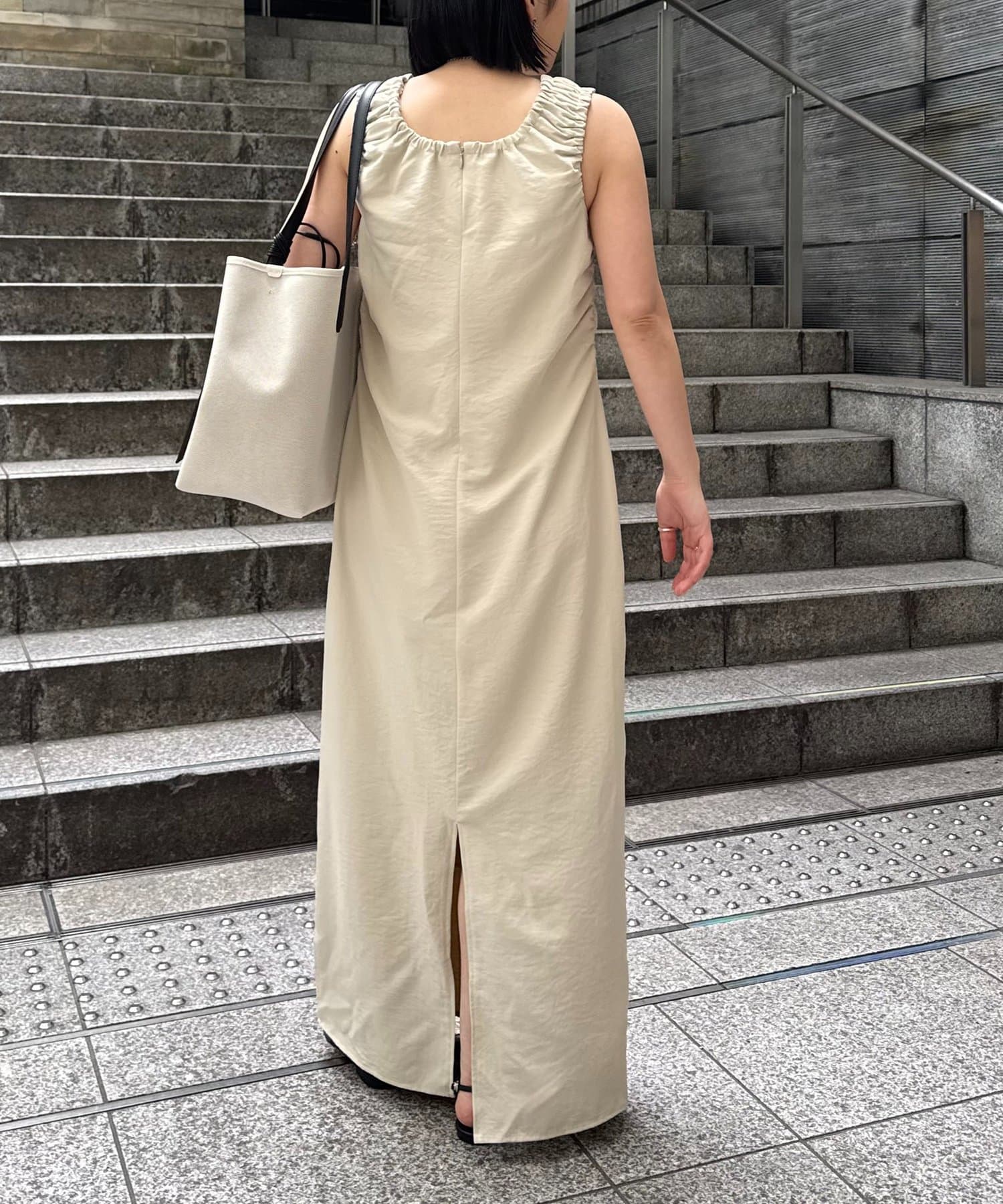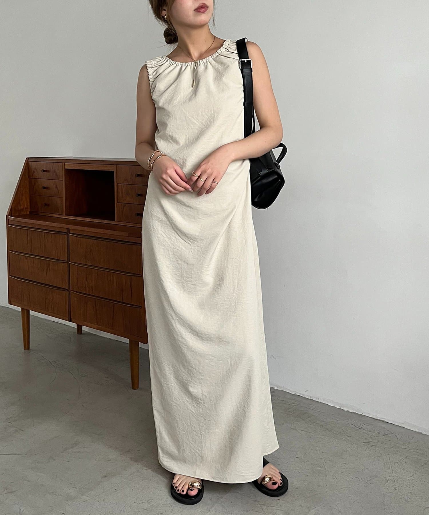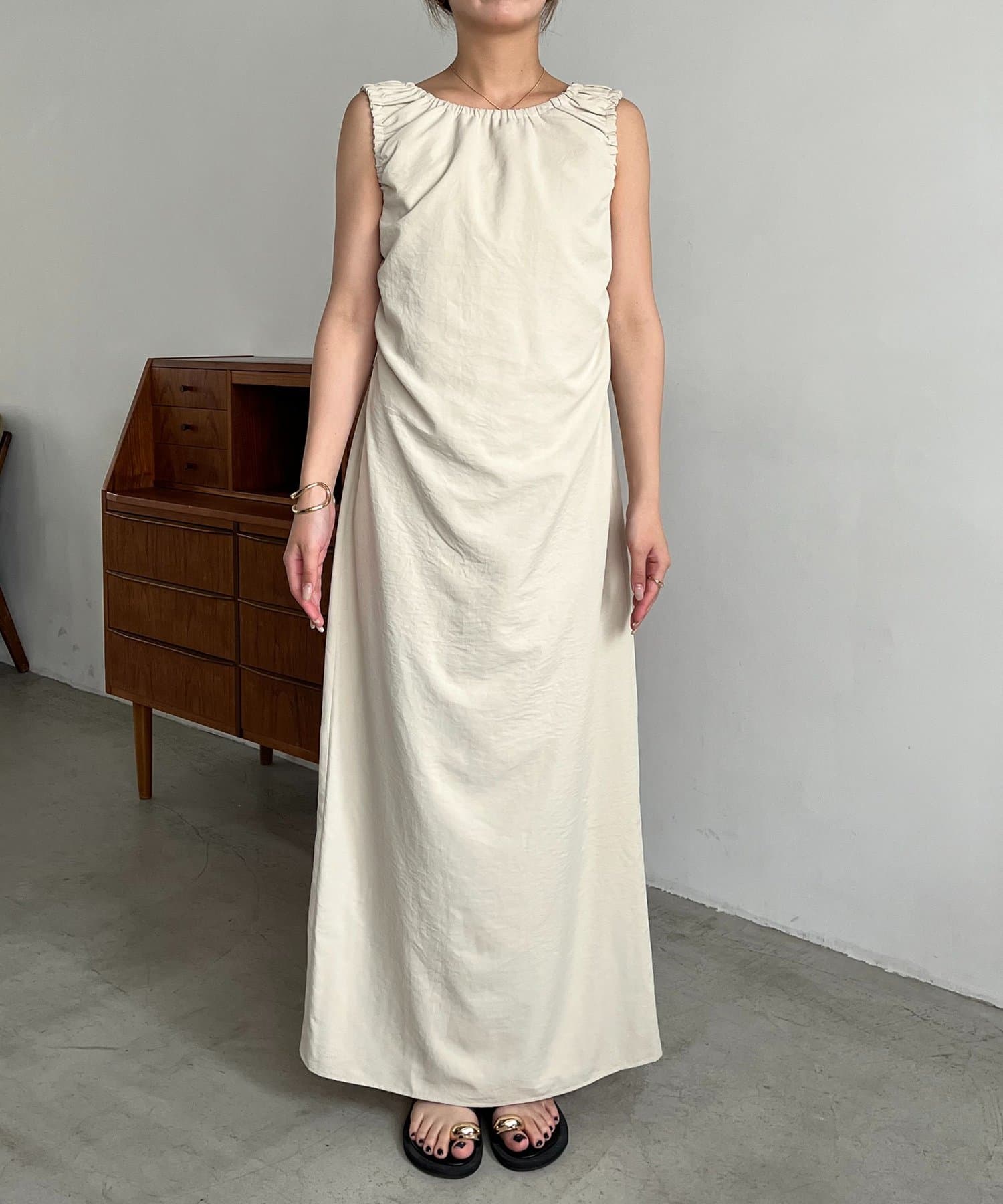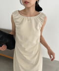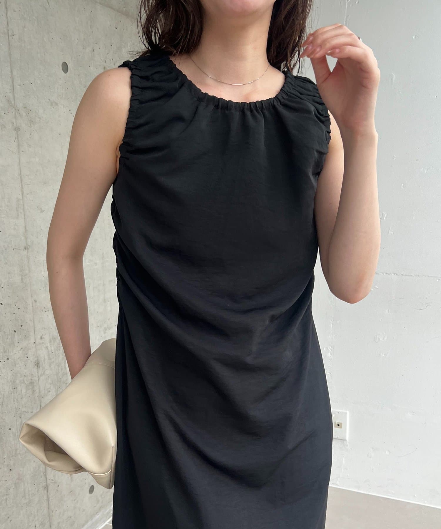 ・肩周りのギャザーがポイントの大人シンプルなワンピース