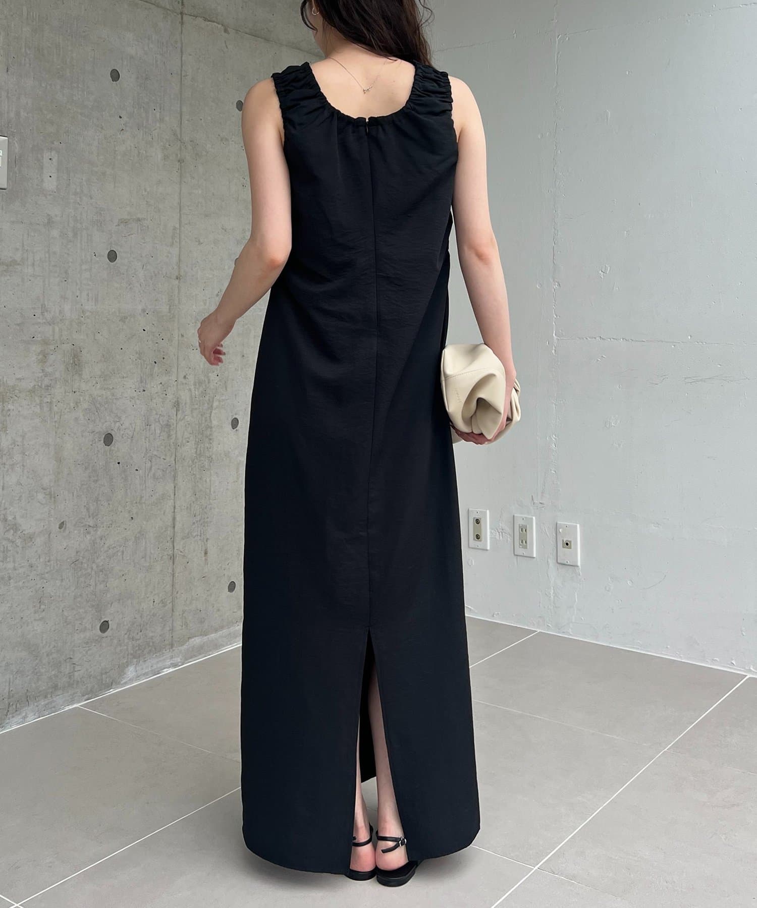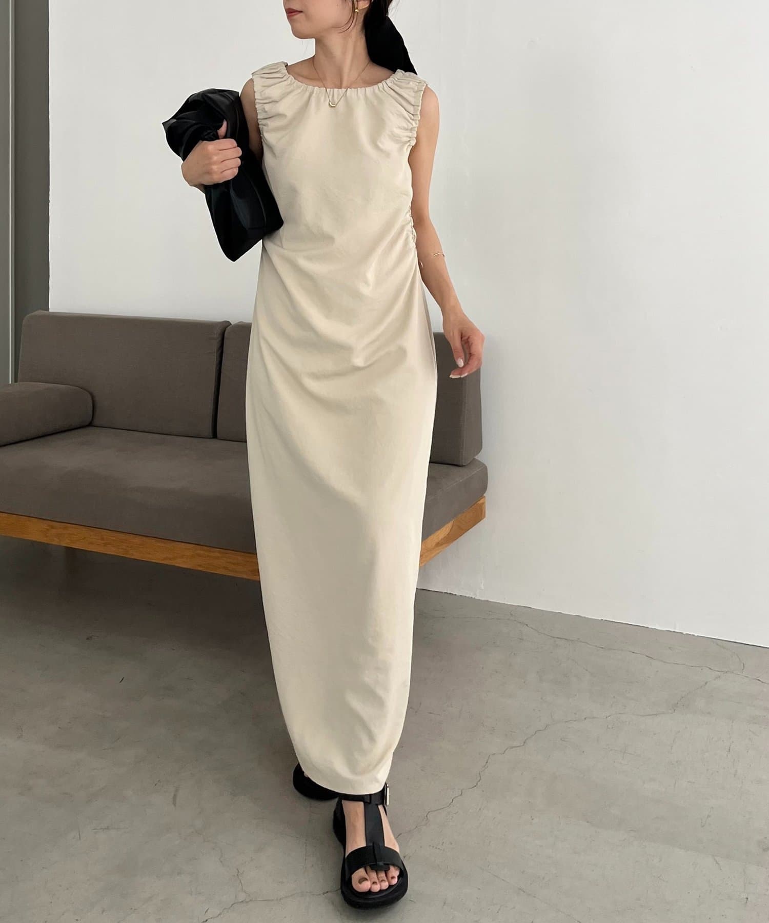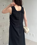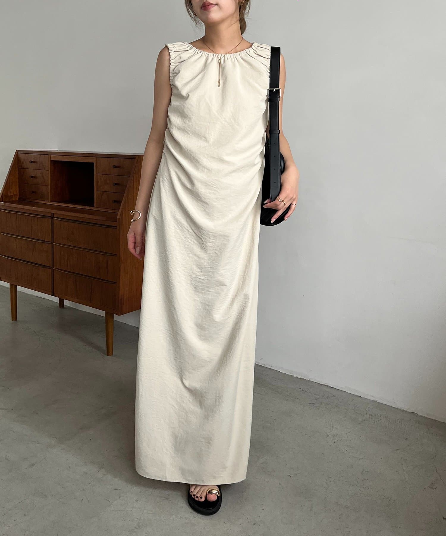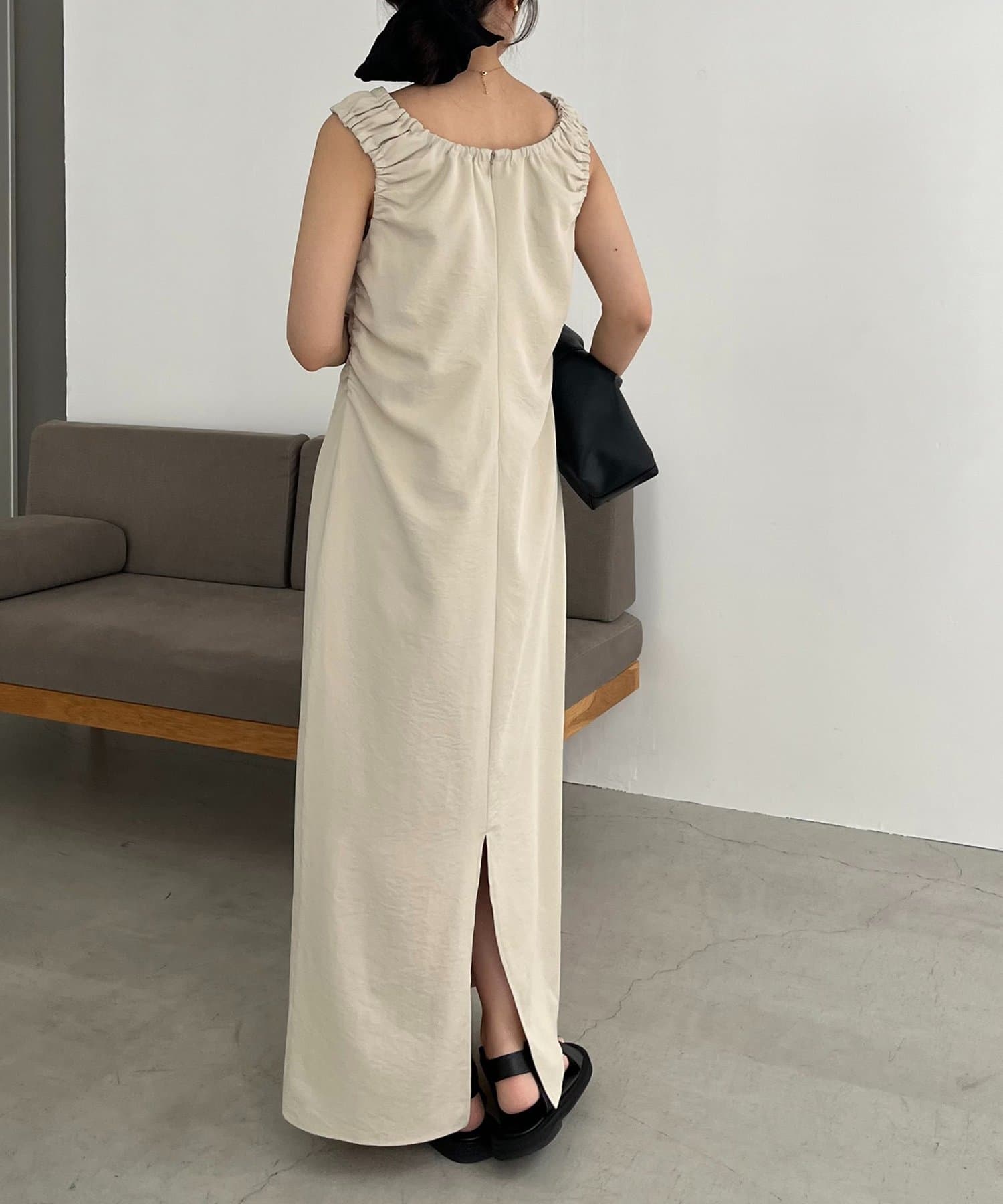 ・肩周りのギャザーがポイントの大人シンプルなワンピース