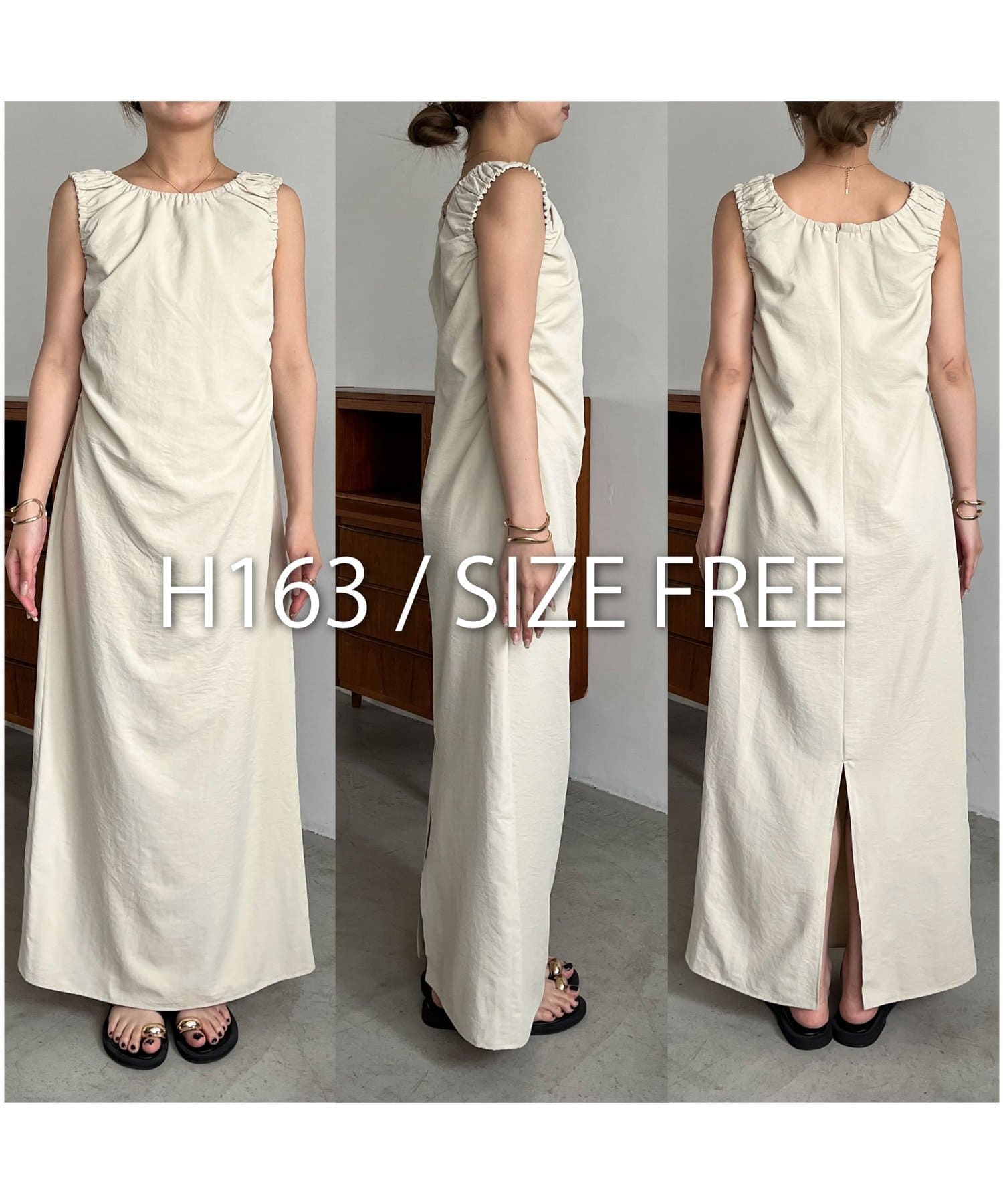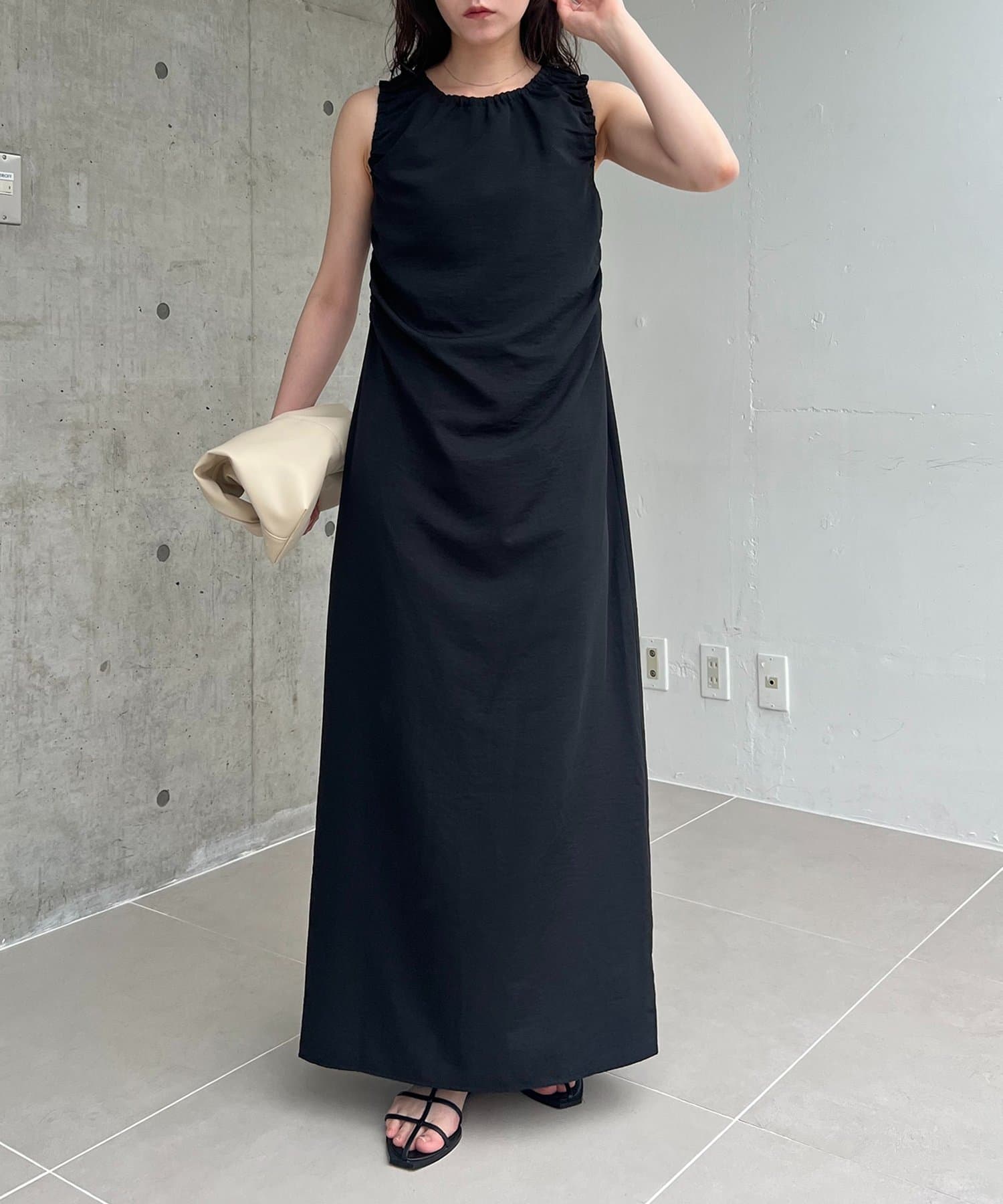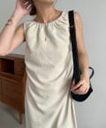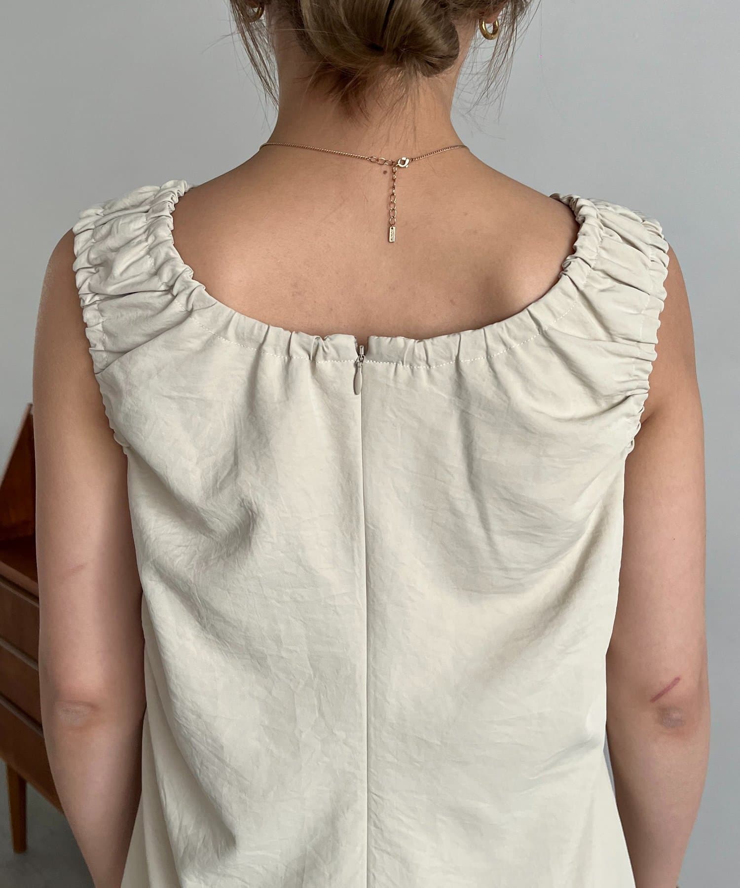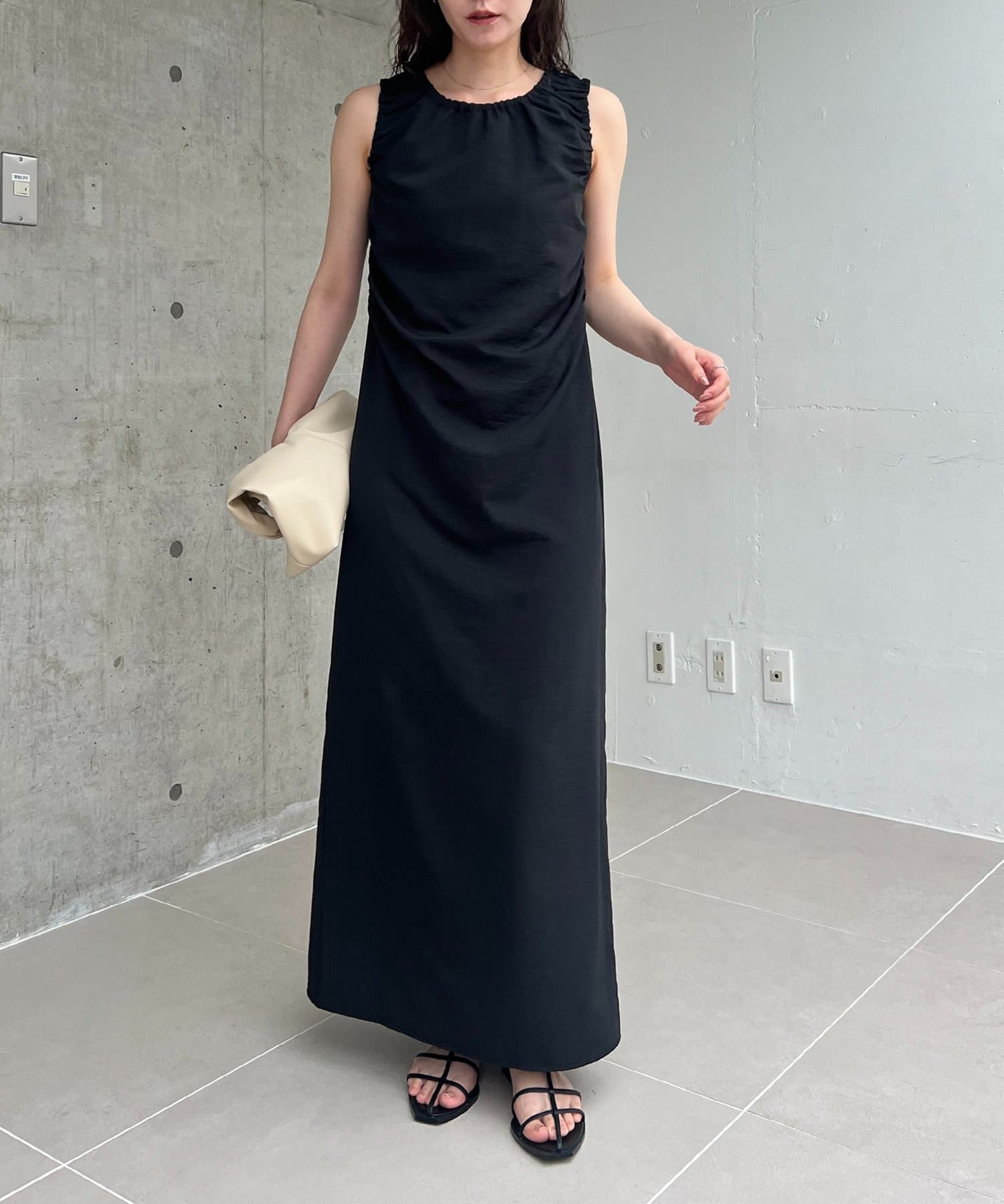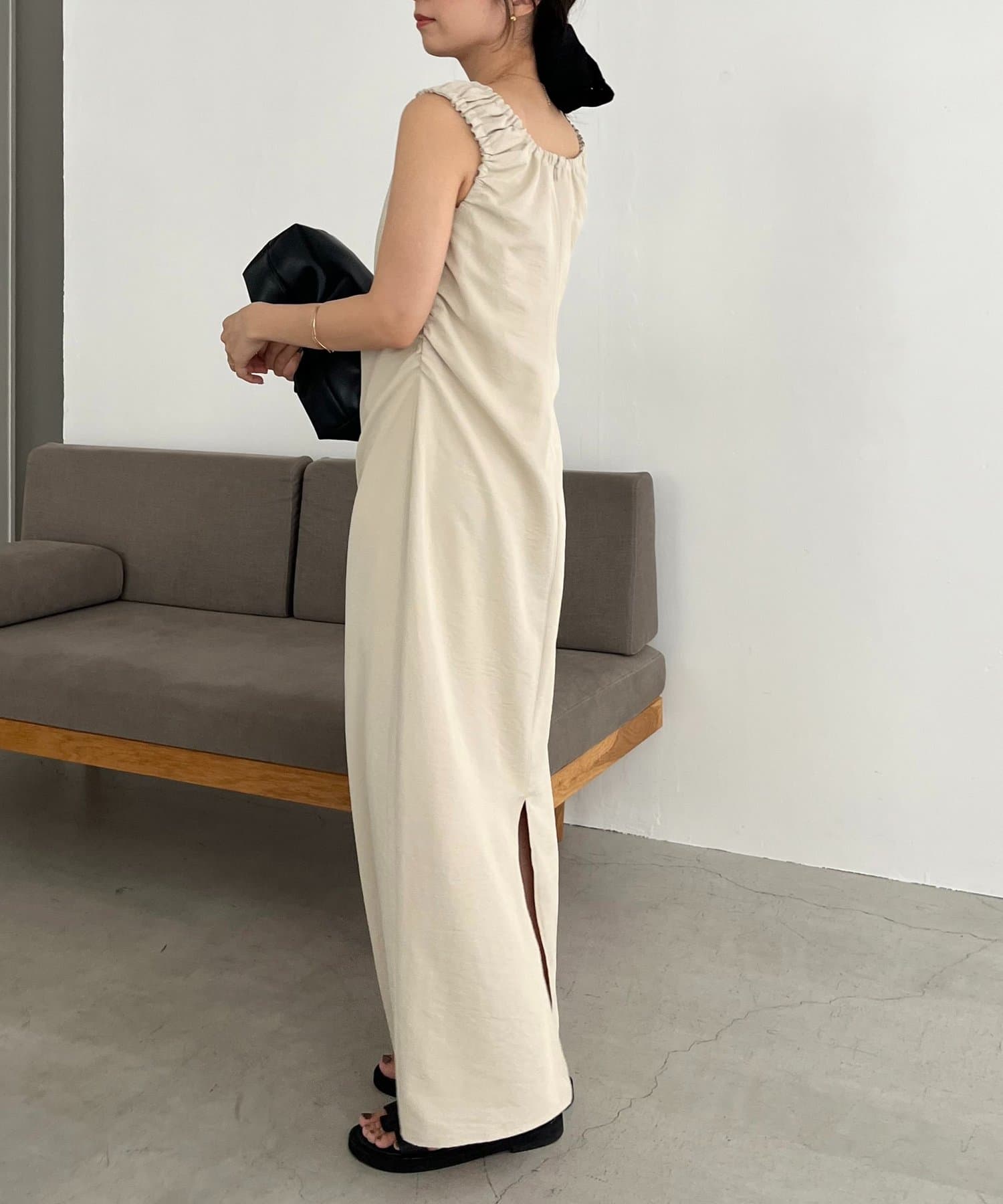 ・肩周りのギャザーがポイントの大人シンプルなワンピース