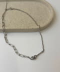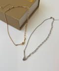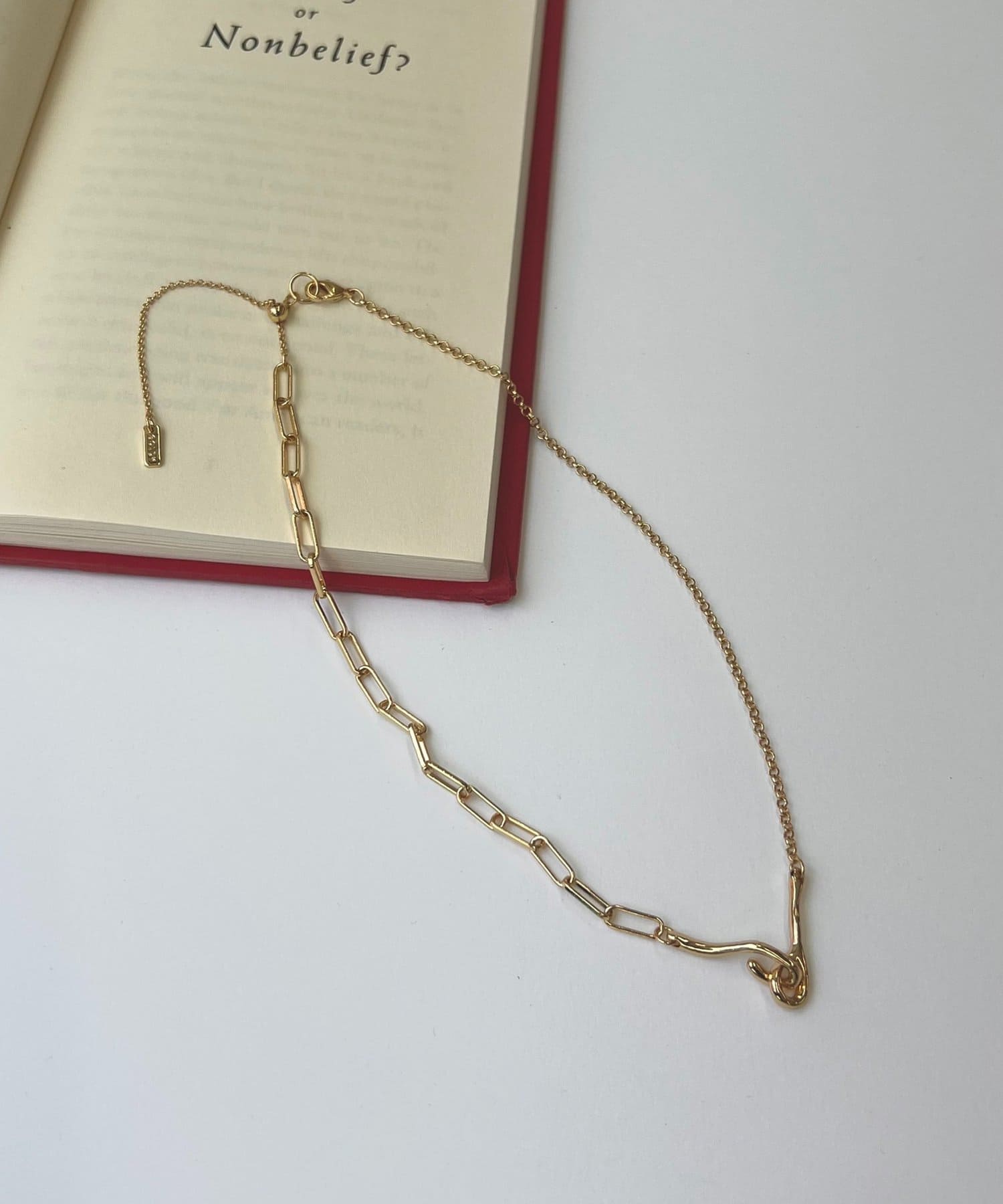 フックモチーフと2種類のチェーンを組み合わせた、シンプルながらもエッジの効いたネックレス