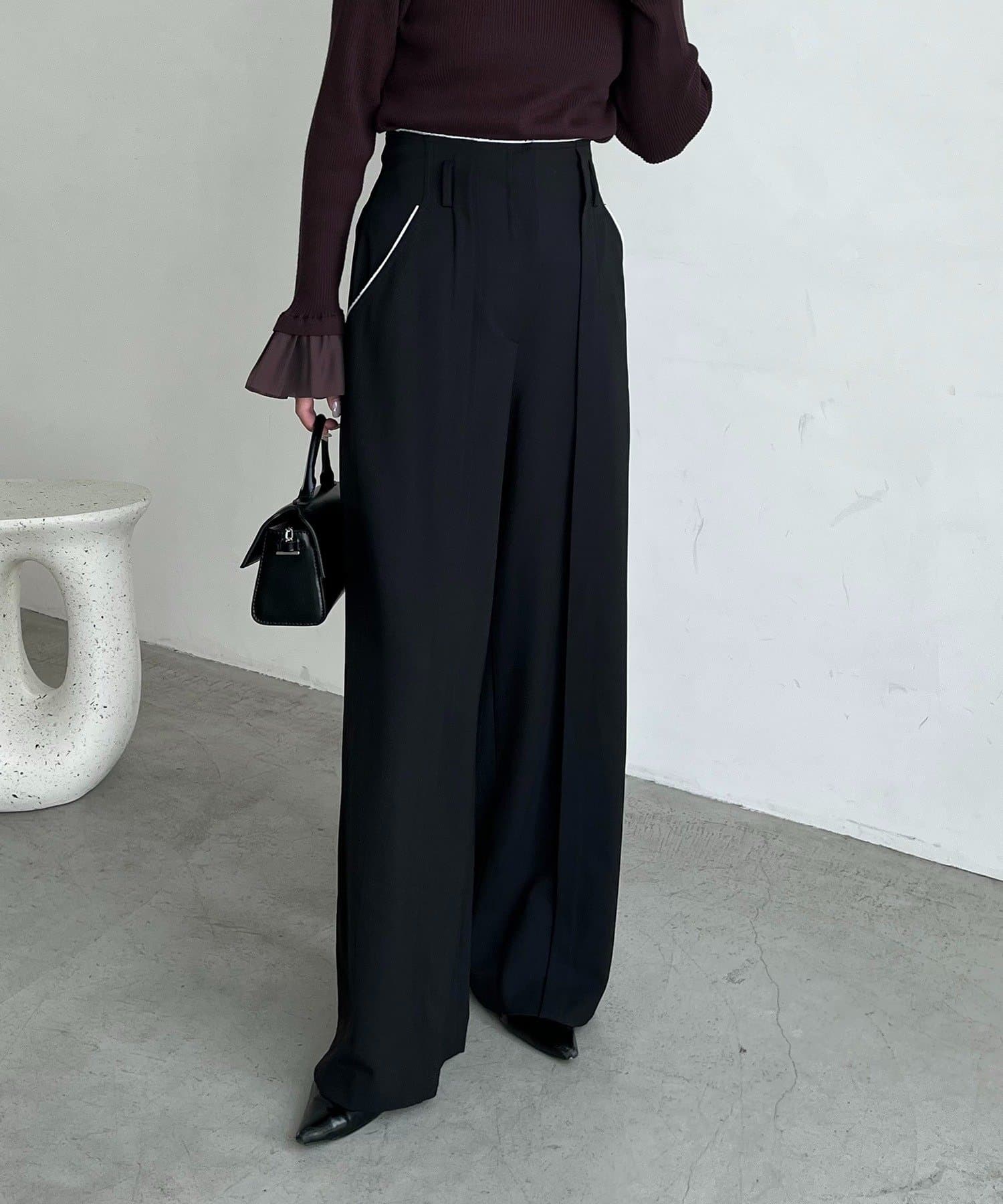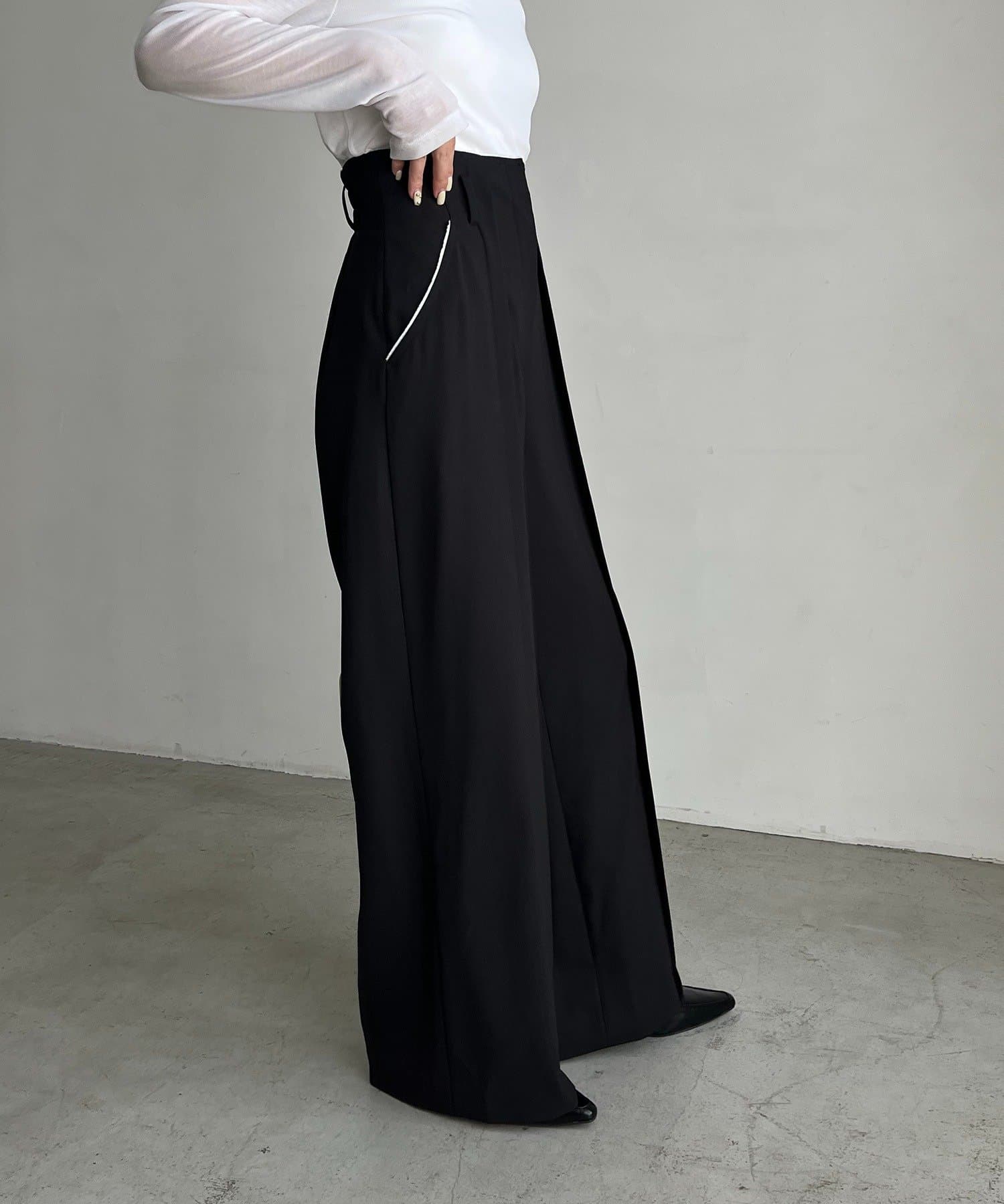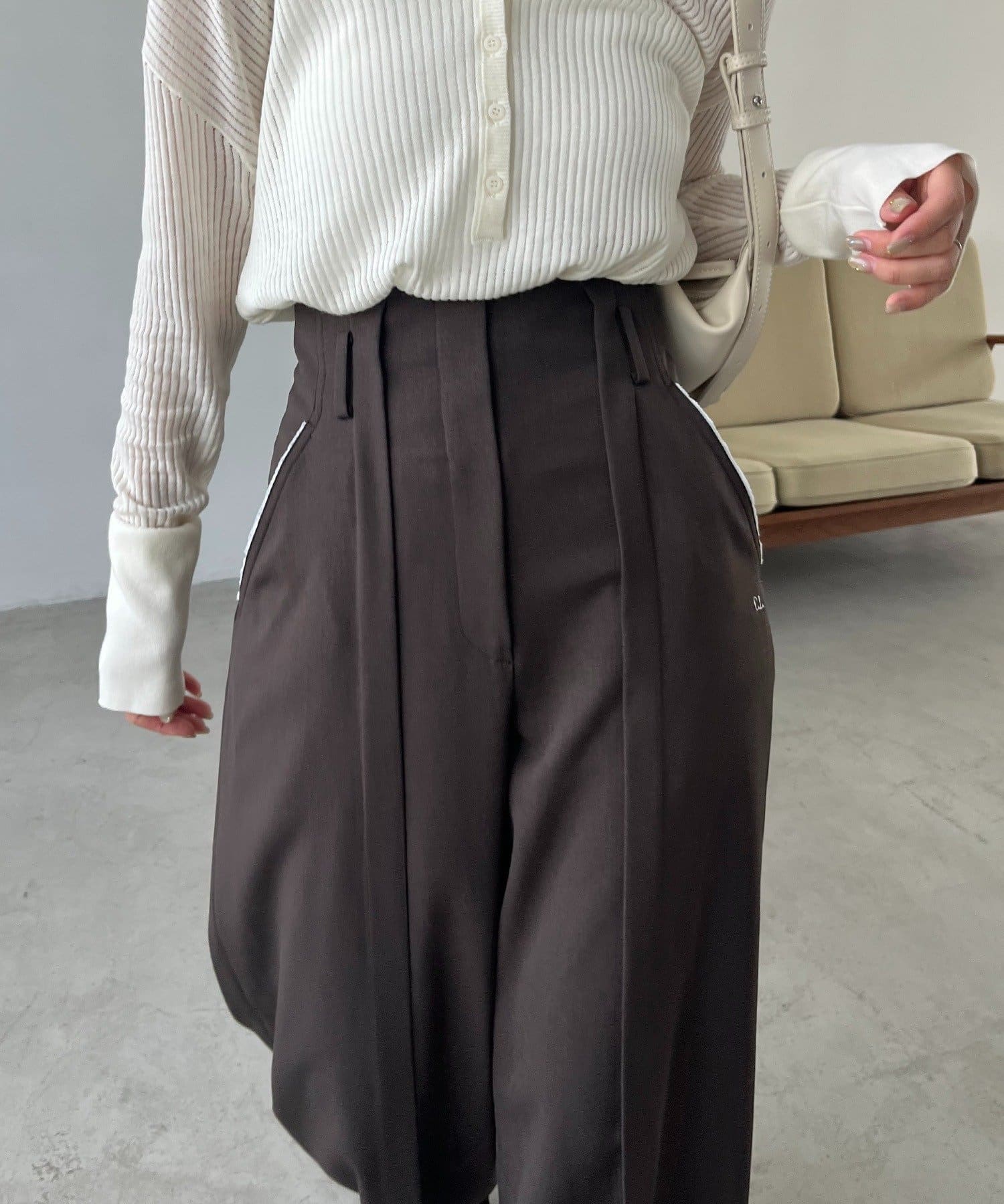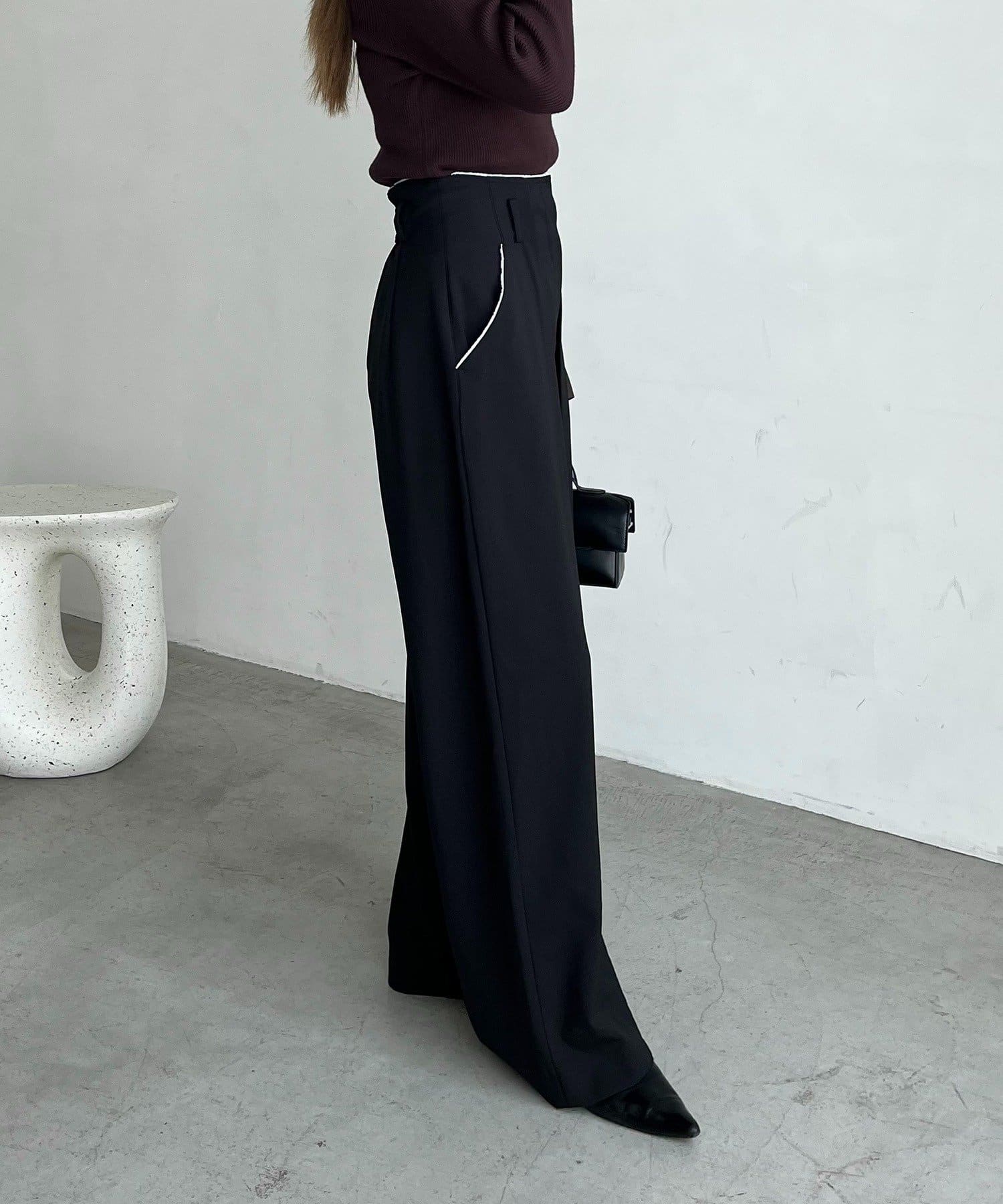 バイカラーの細いラインで縁取ったデザインがポイントのワイドパンツ