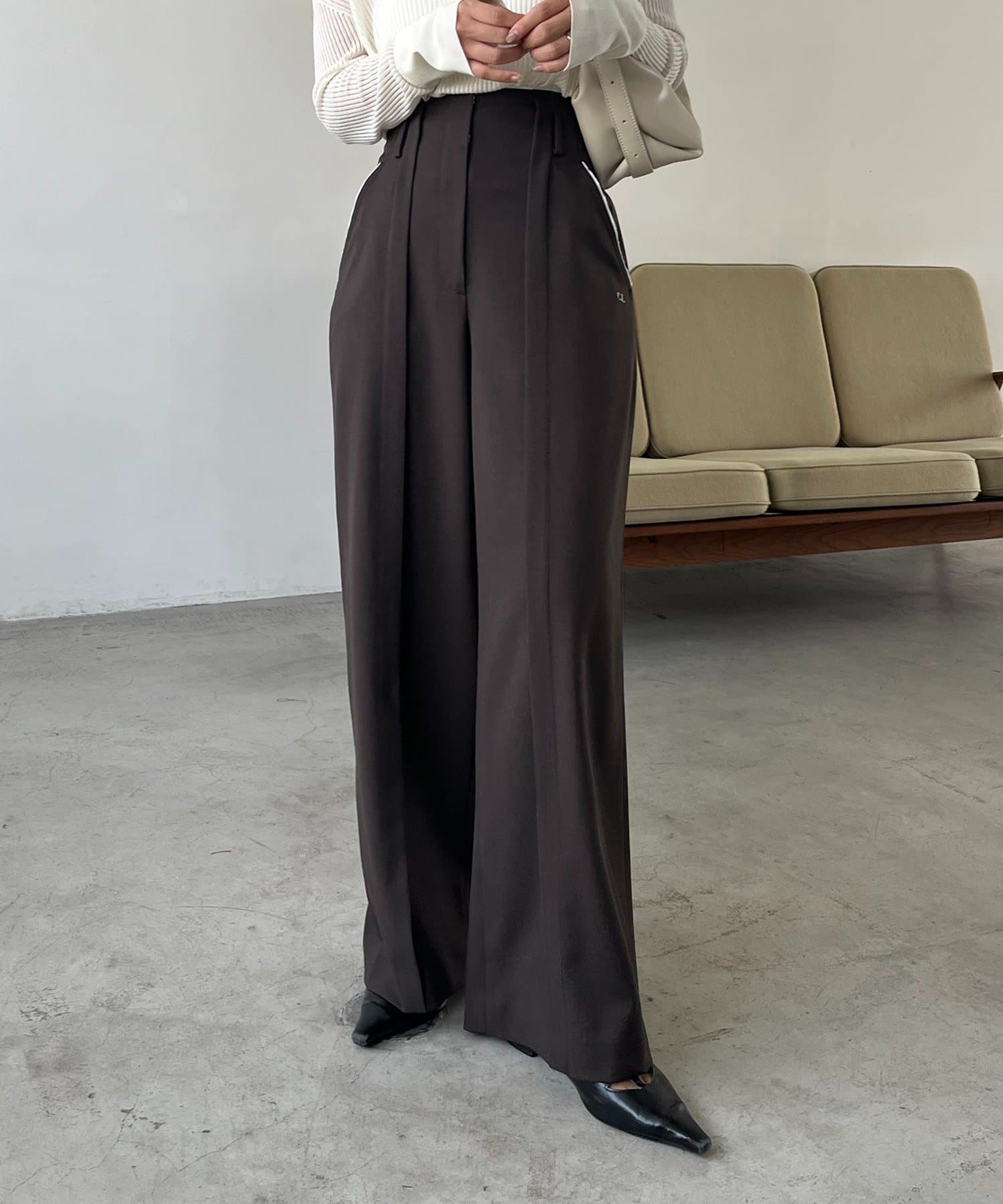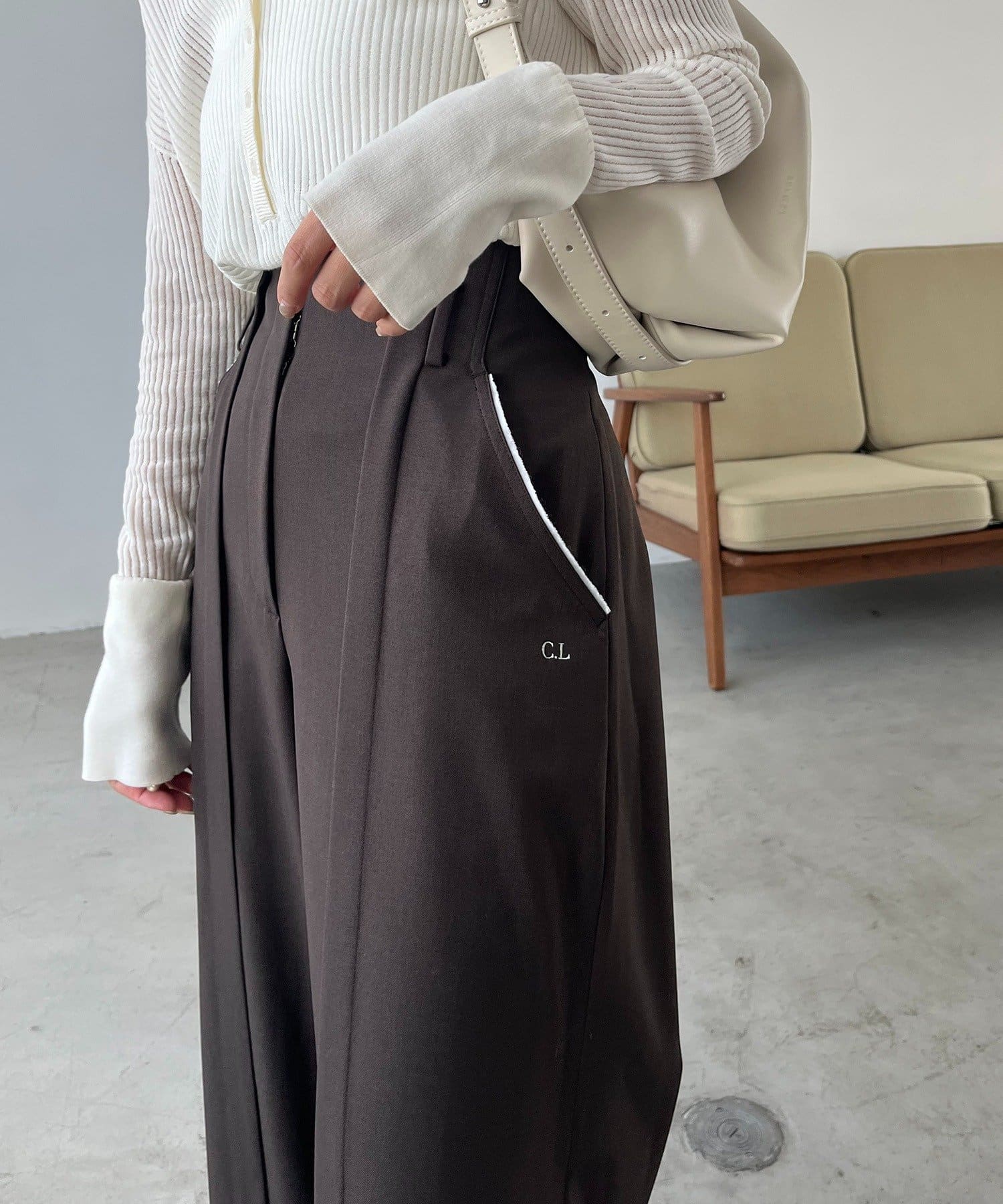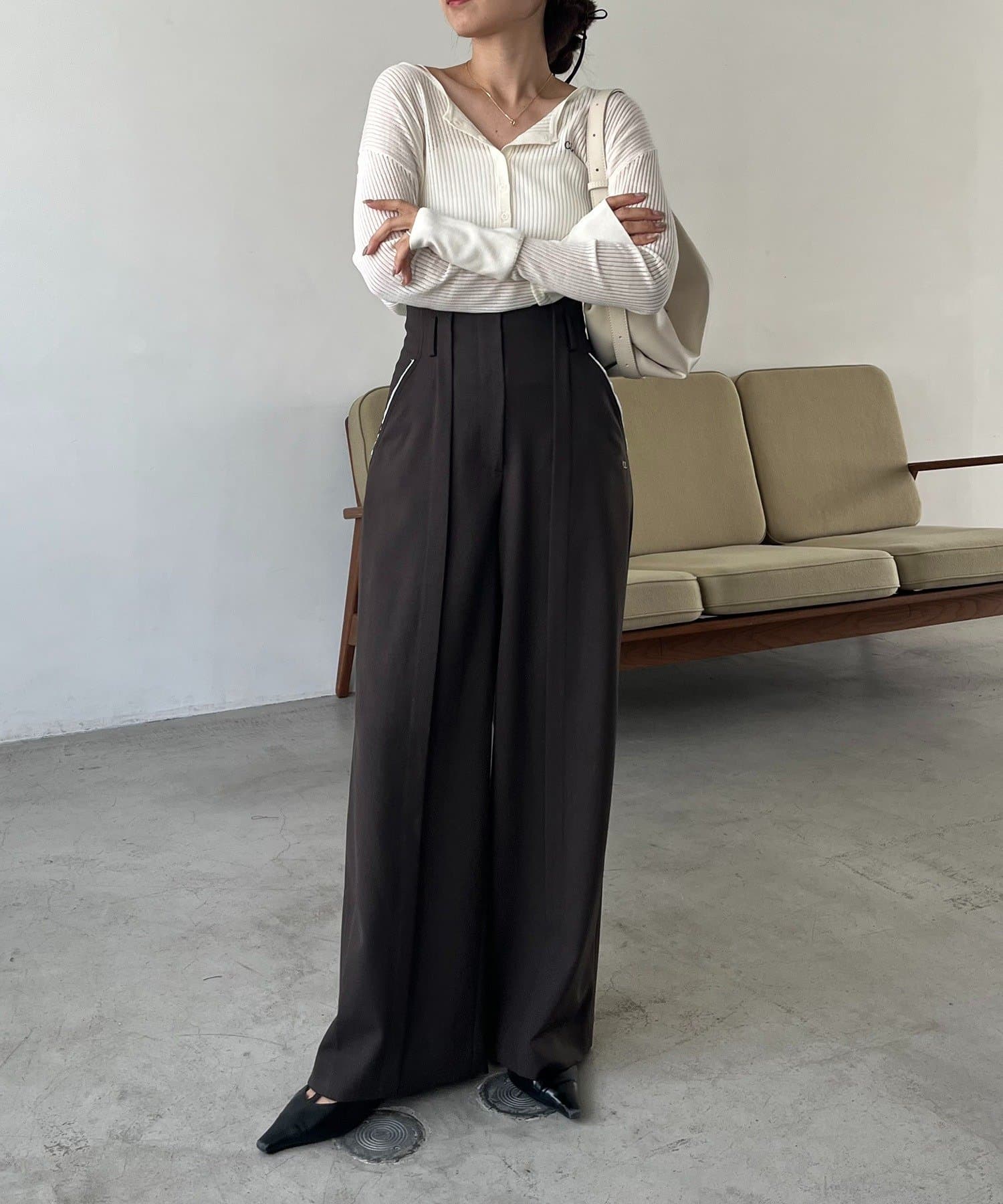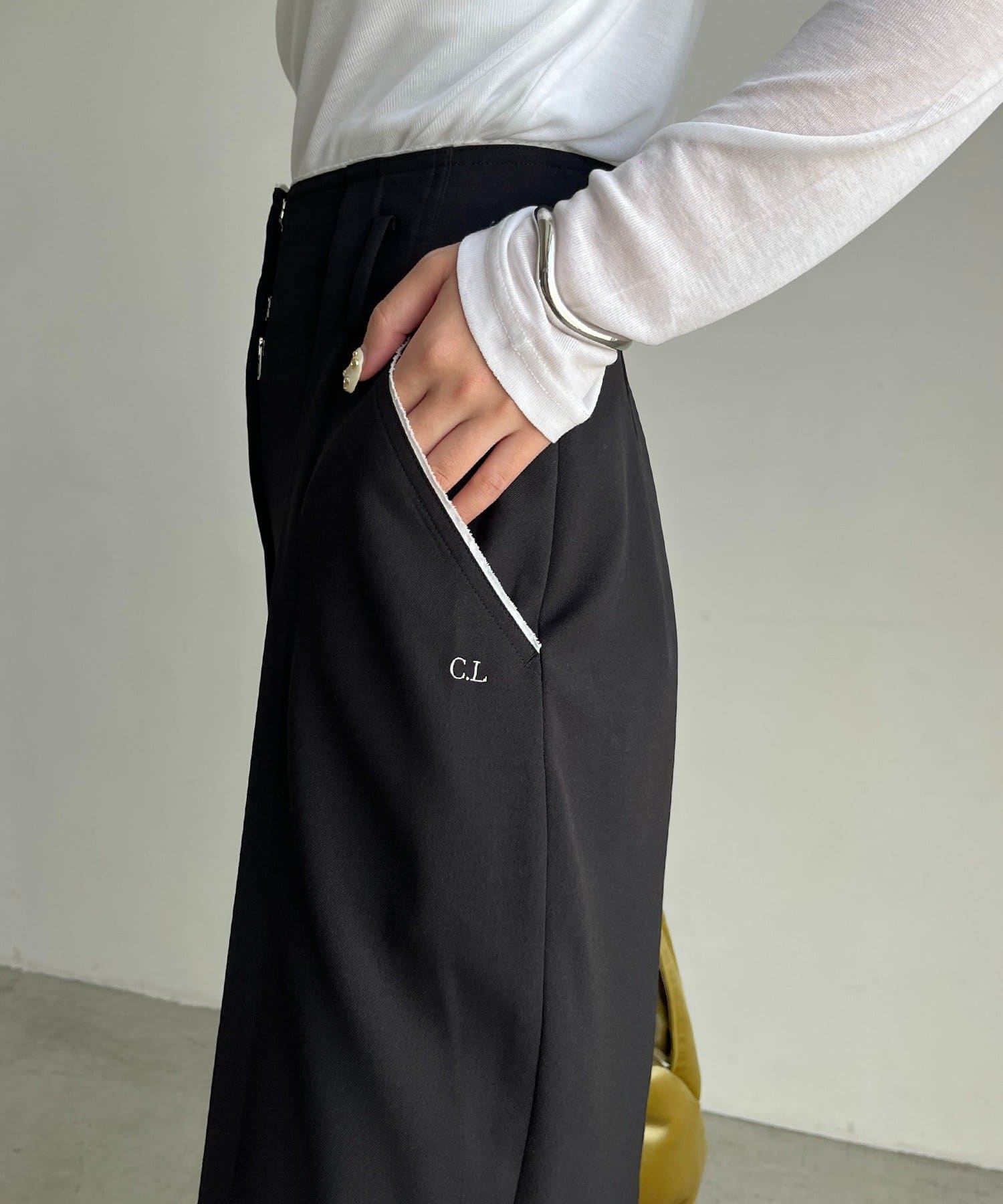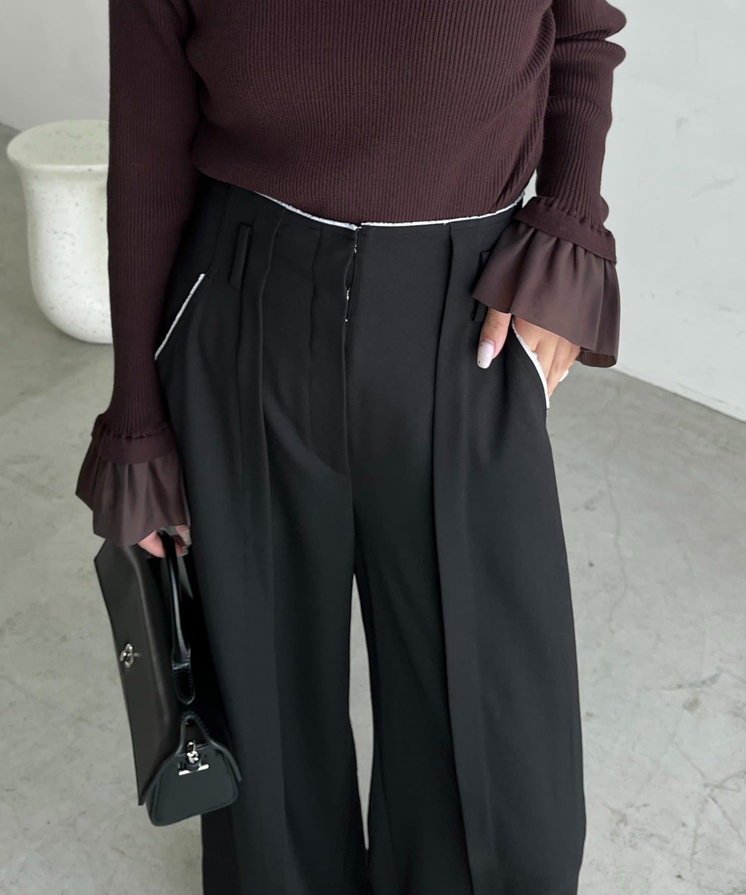 バイカラーの細いラインで縁取ったデザインがポイントのワイドパンツ
