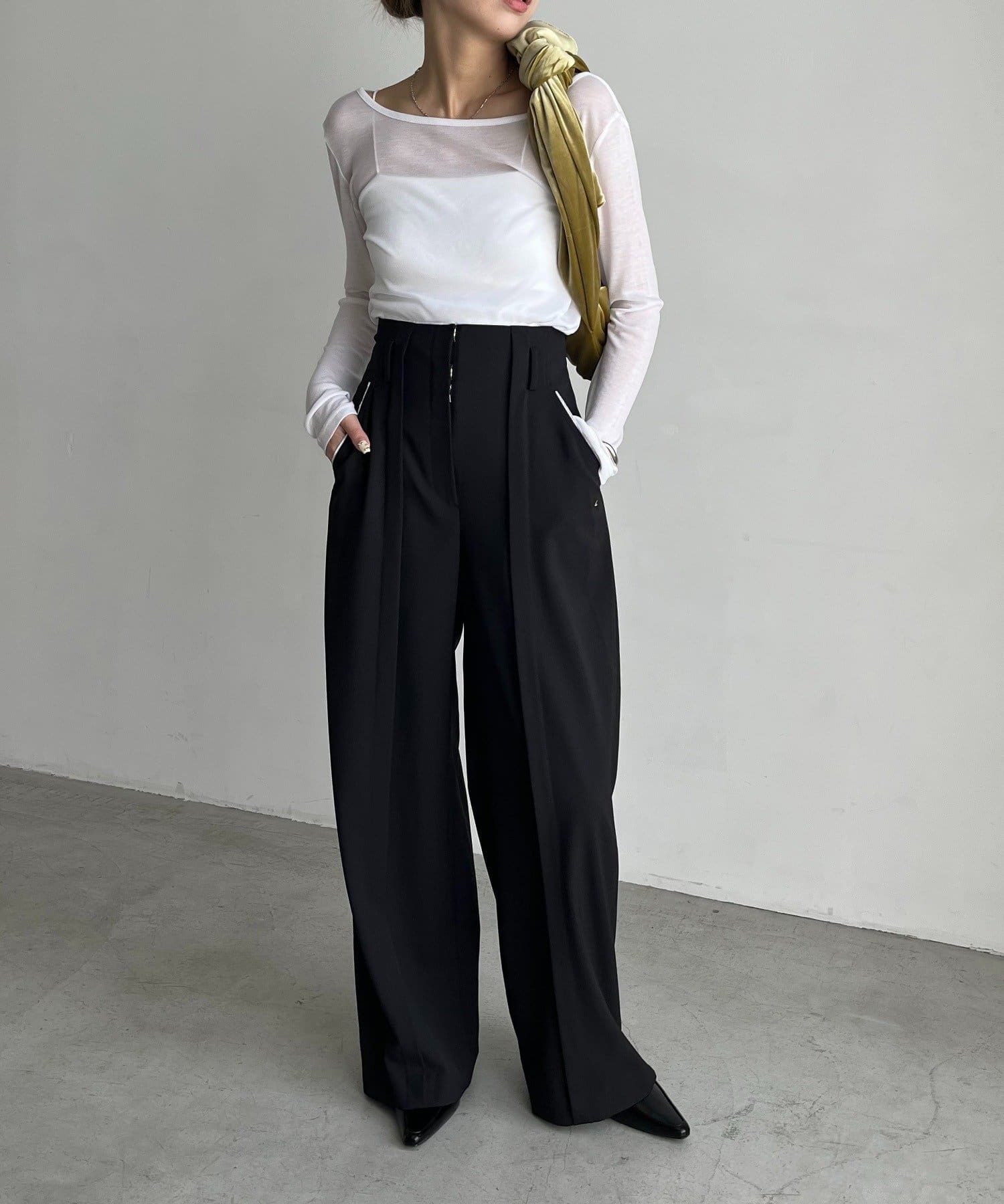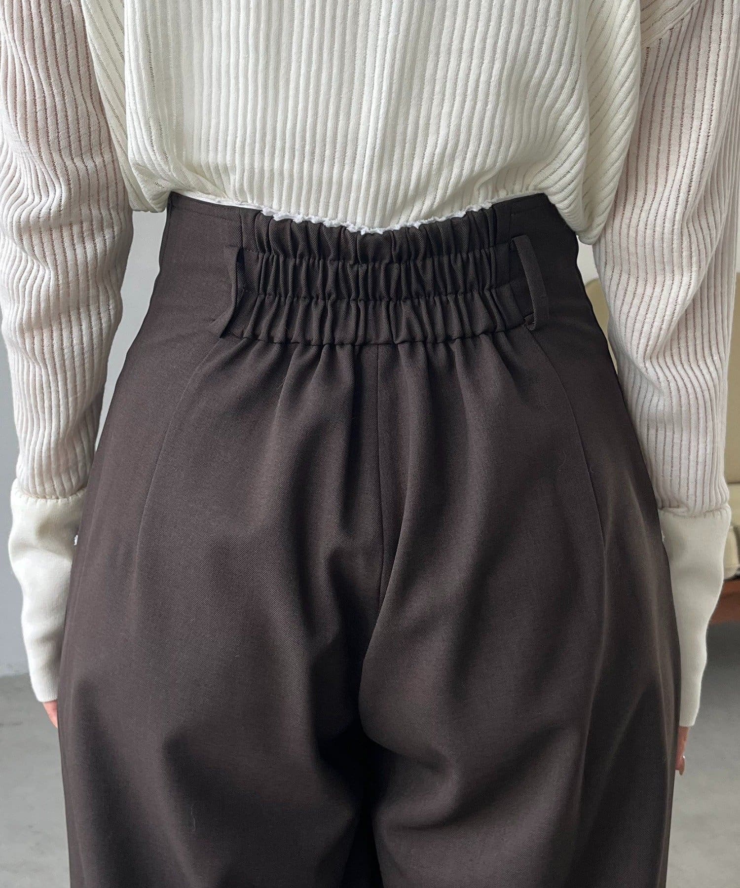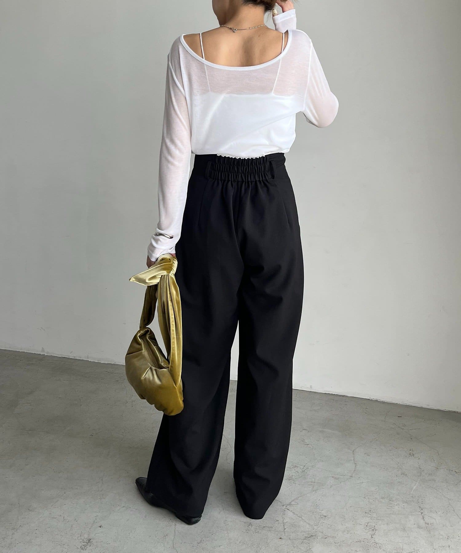 ・ベルトの切替がないハイウエストで腰位置が高くすっきり見え