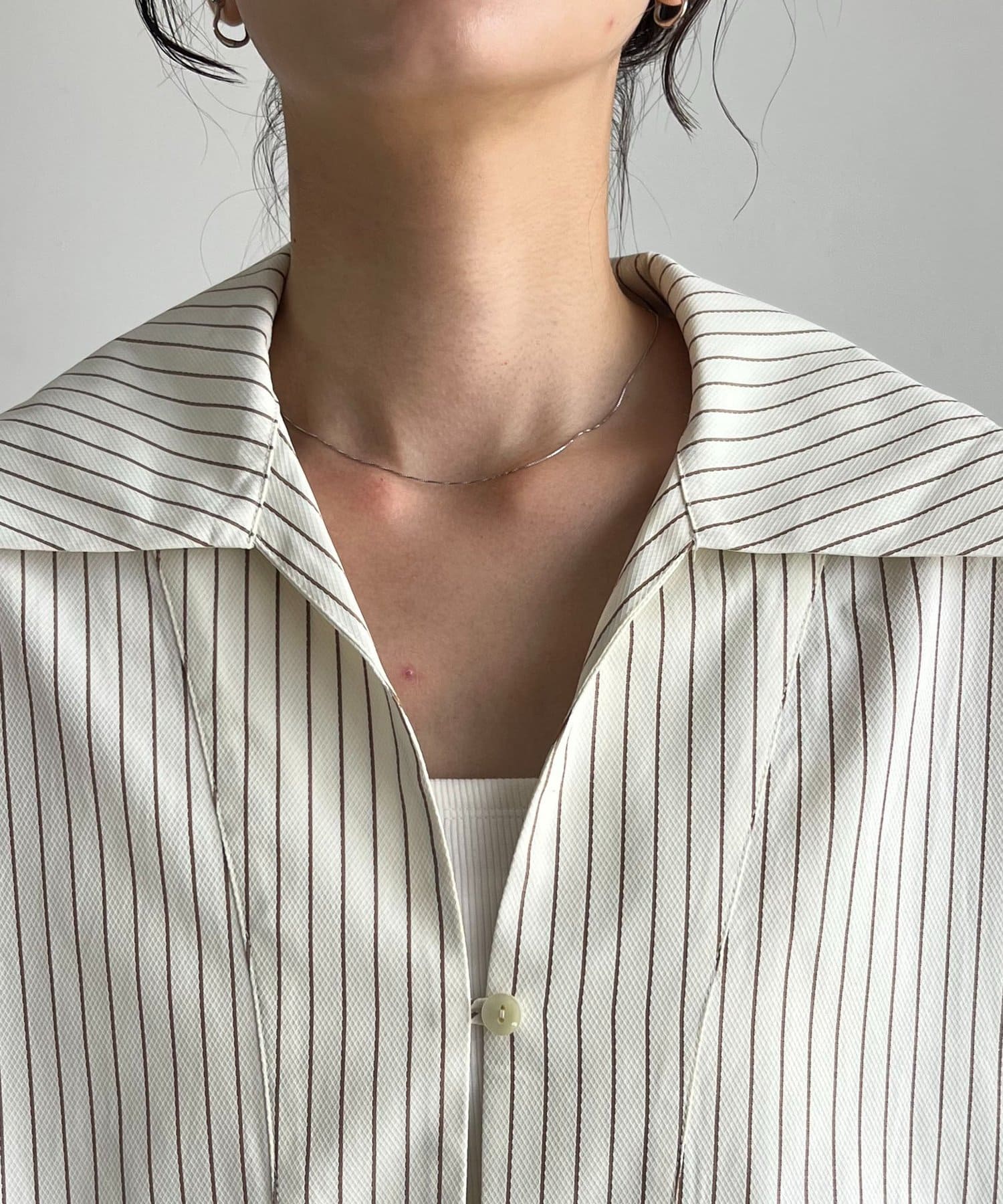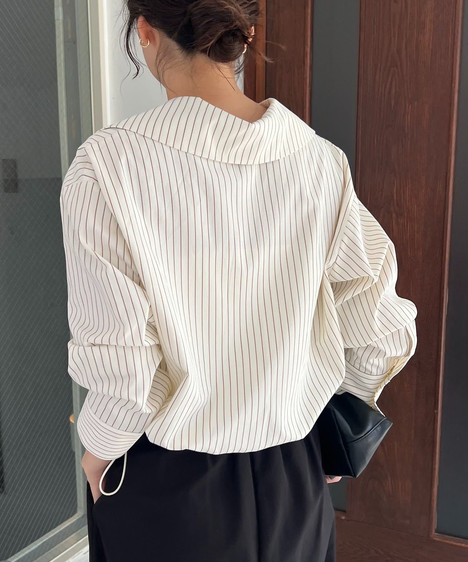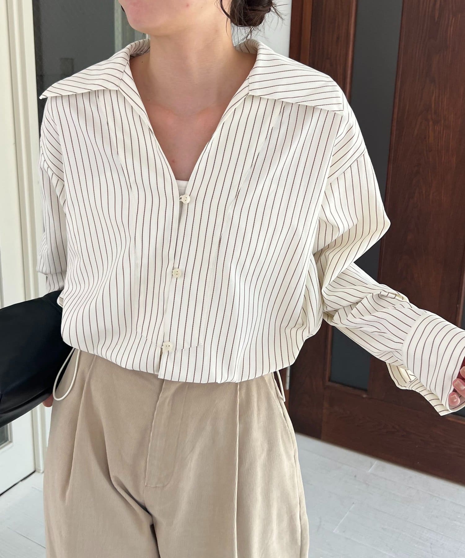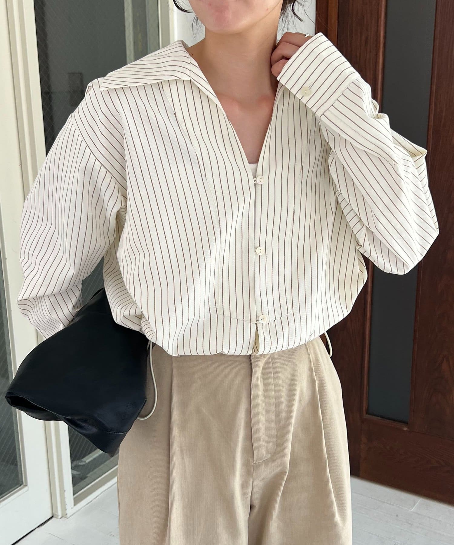 ・前下がりがVネックに開いていて抜け感たっぷりのストライプシャツ
