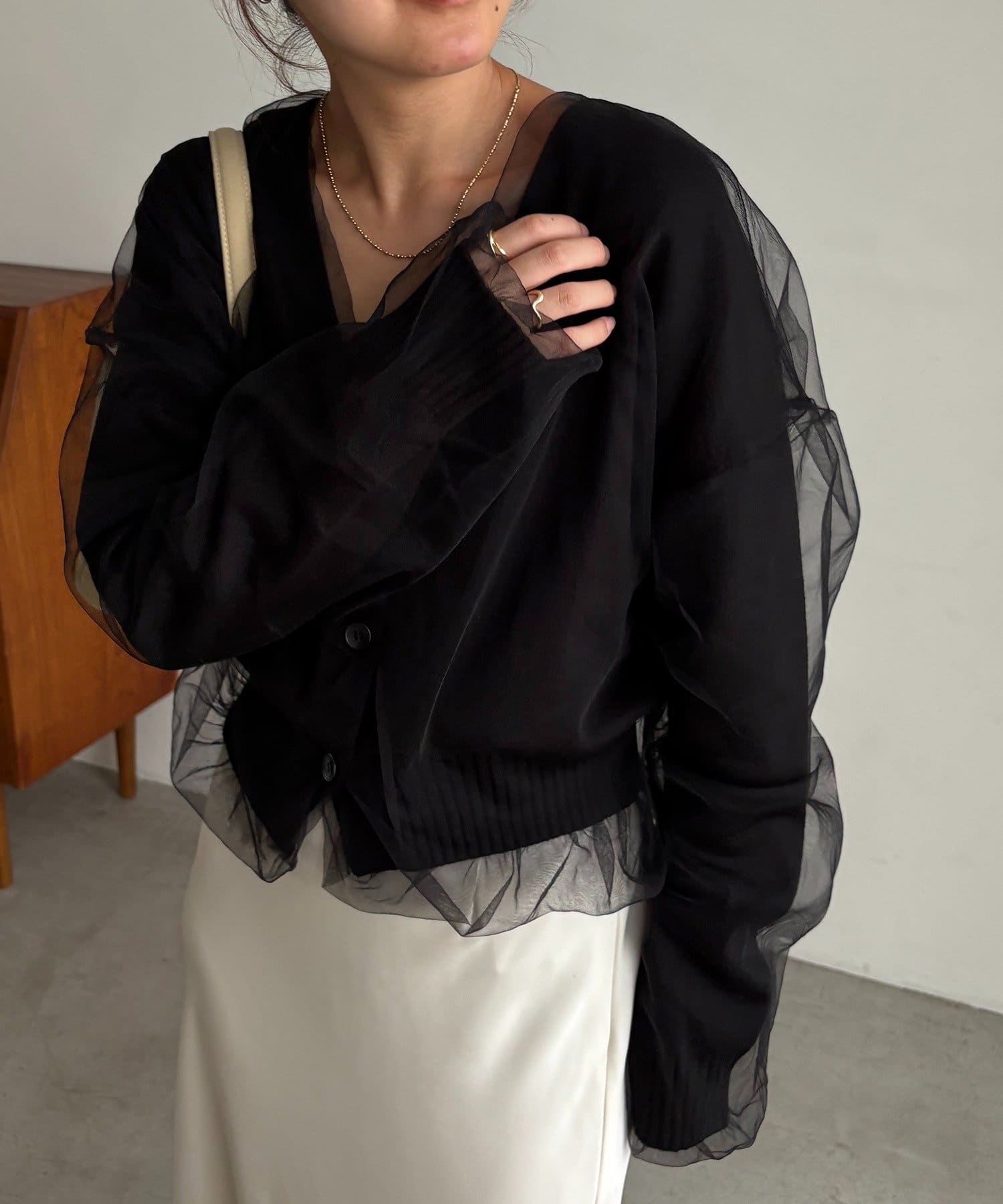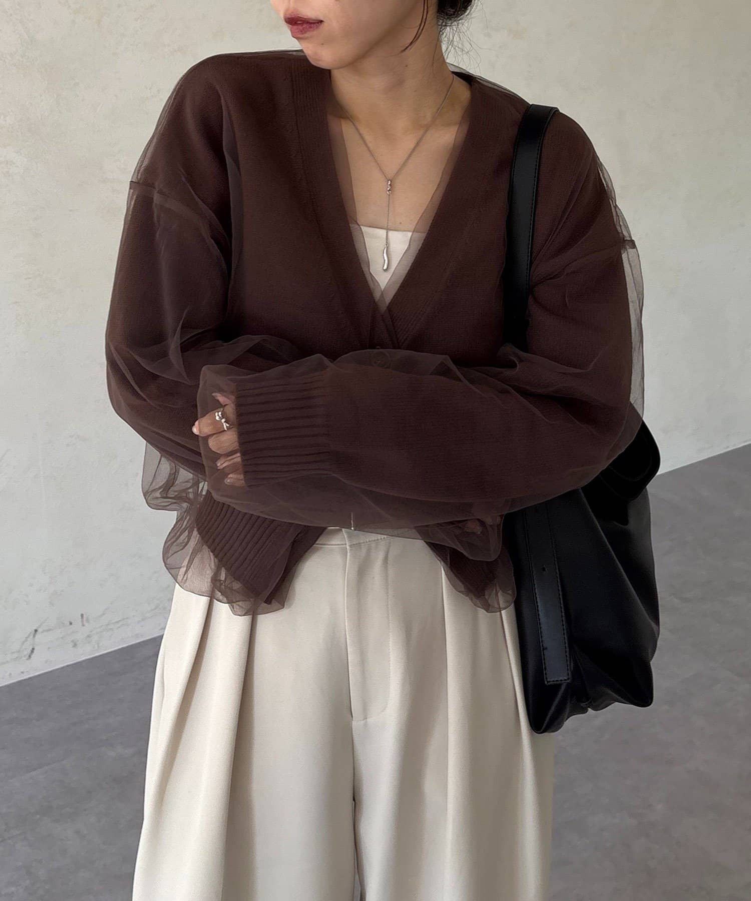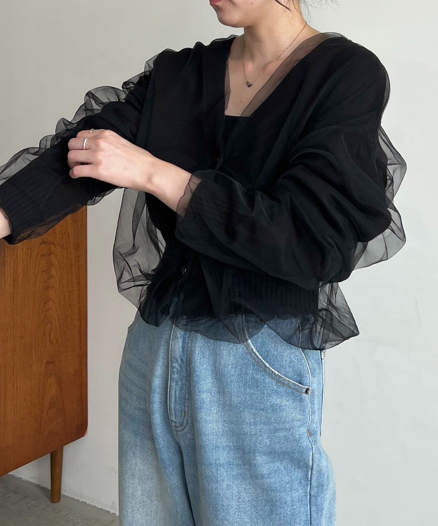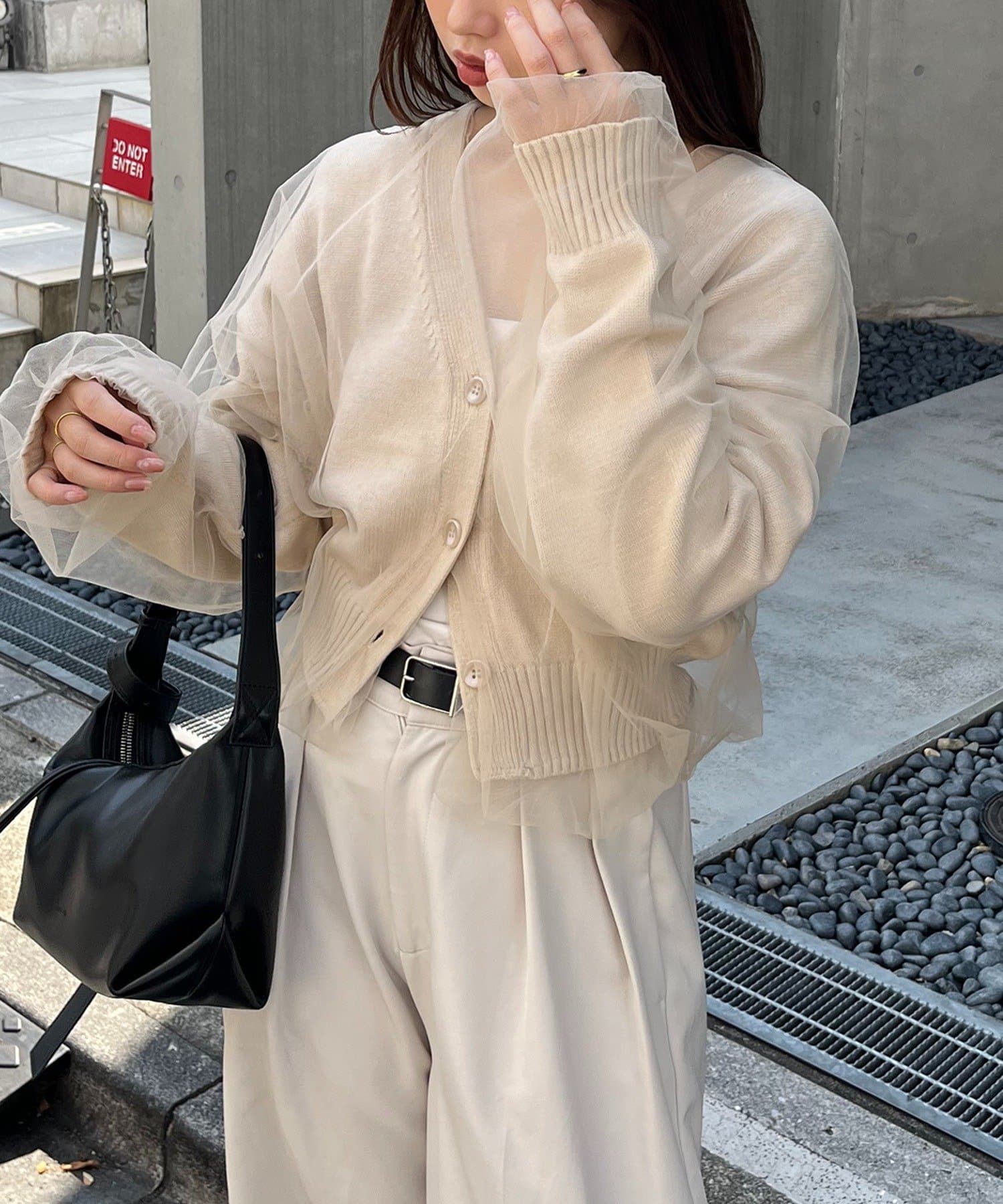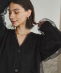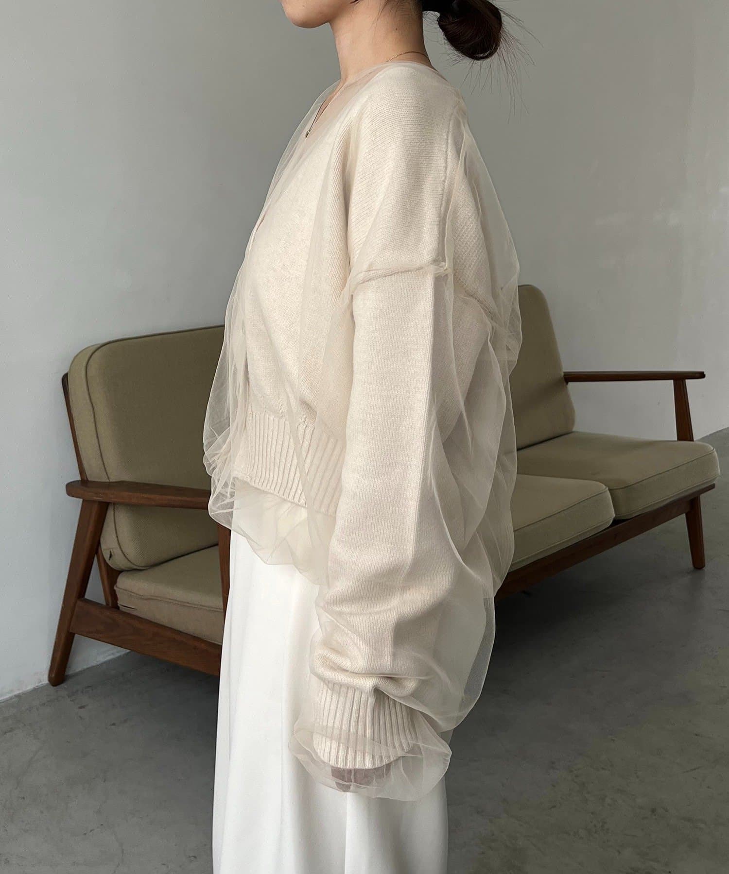 ・前立てや袖口などもチュールに覆われ、ニット部分が見えないことでモード感のある1枚に