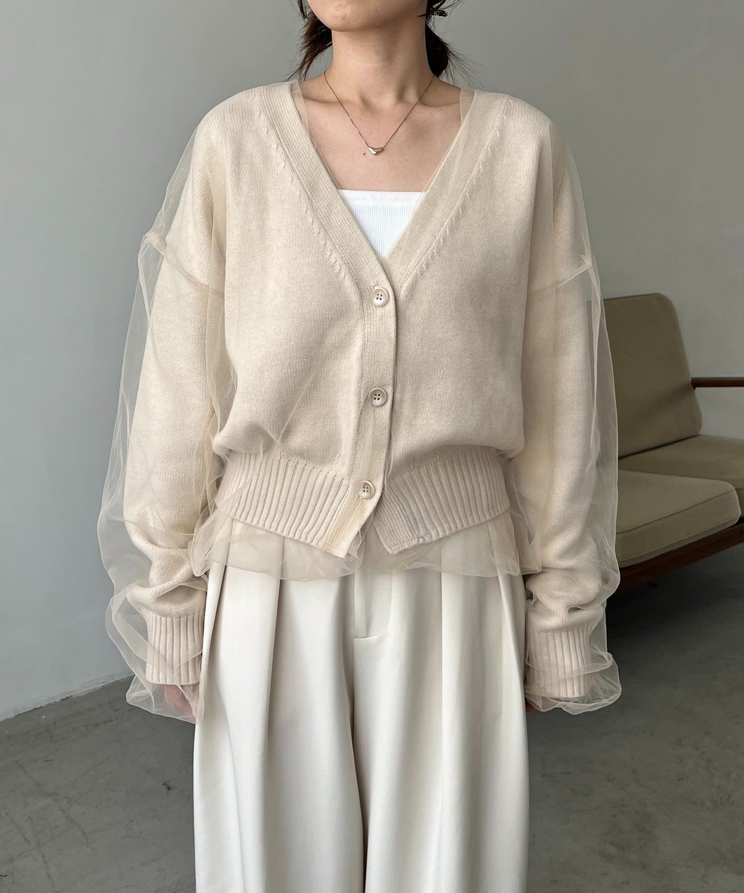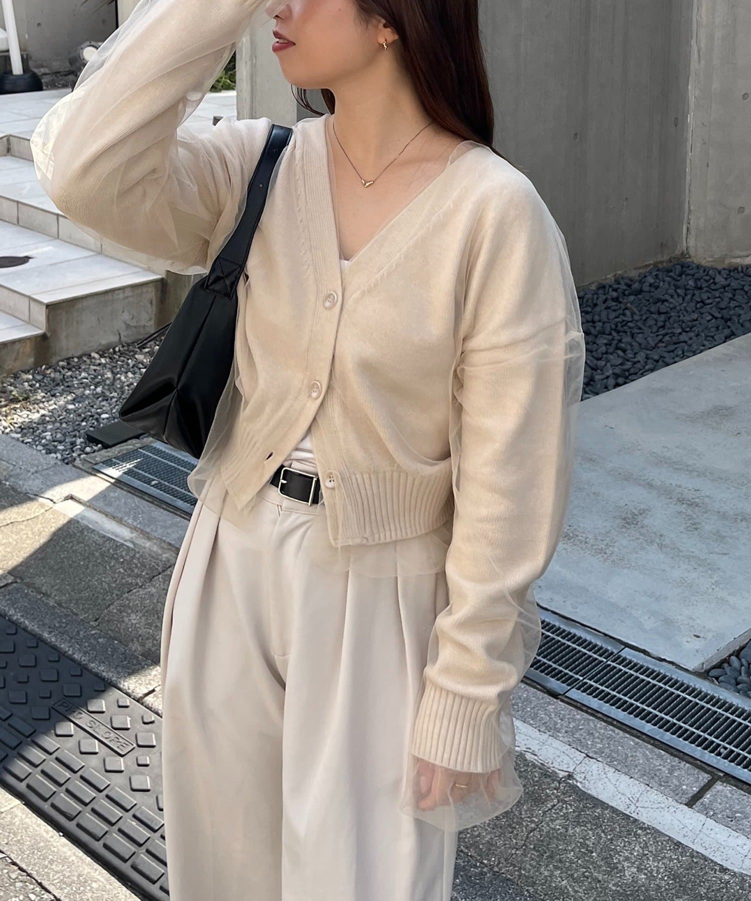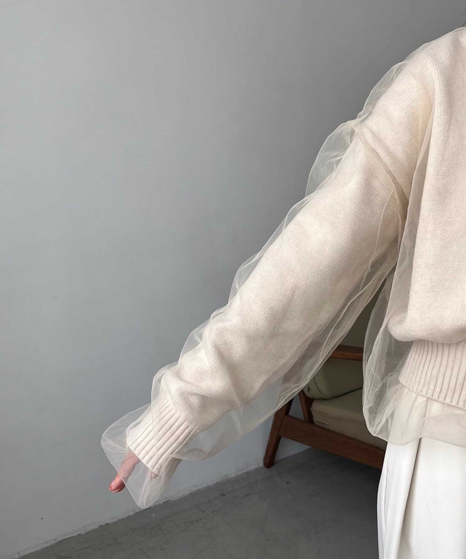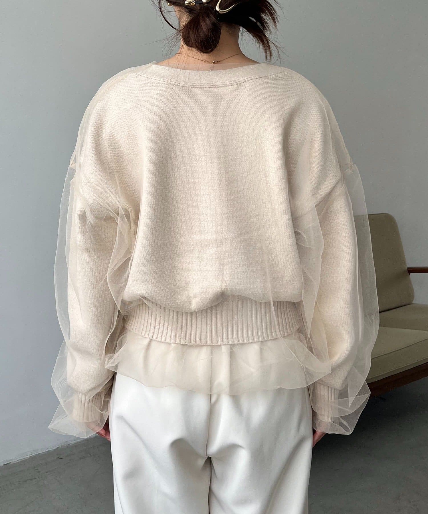 ・前立てや袖口などもチュールに覆われ、ニット部分が見えないことでモード感のある1枚に