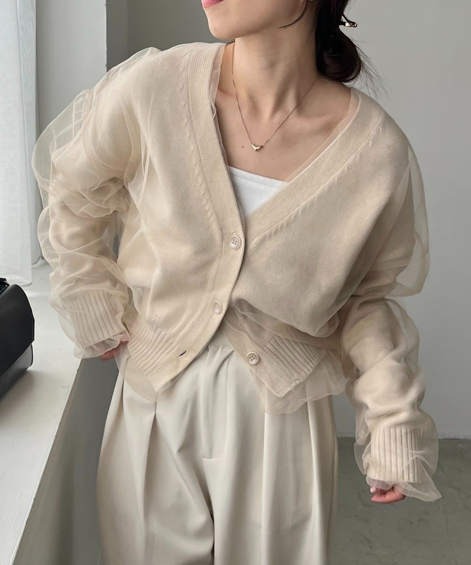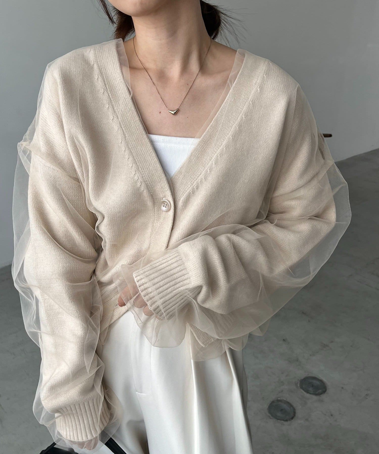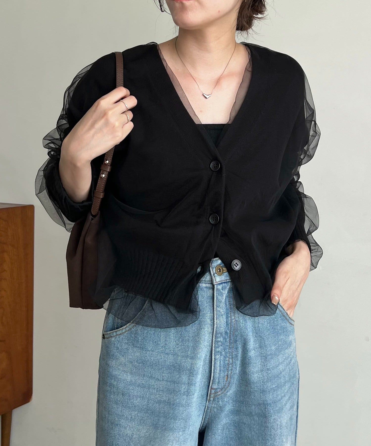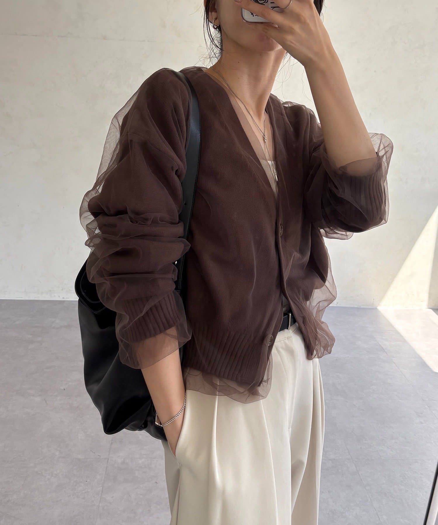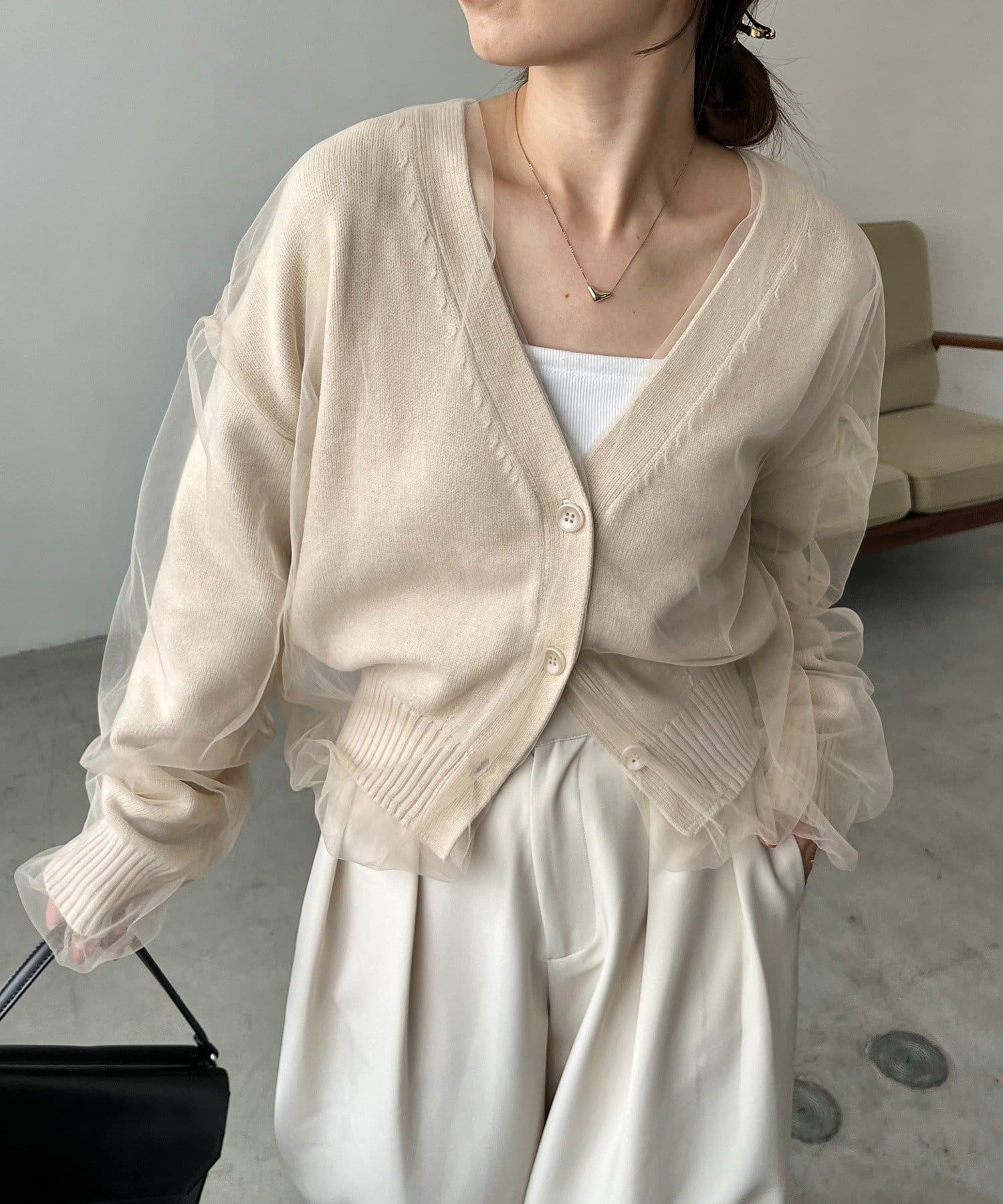 ・前立てや袖口などもチュールに覆われ、ニット部分が見えないことでモード感のある1枚に