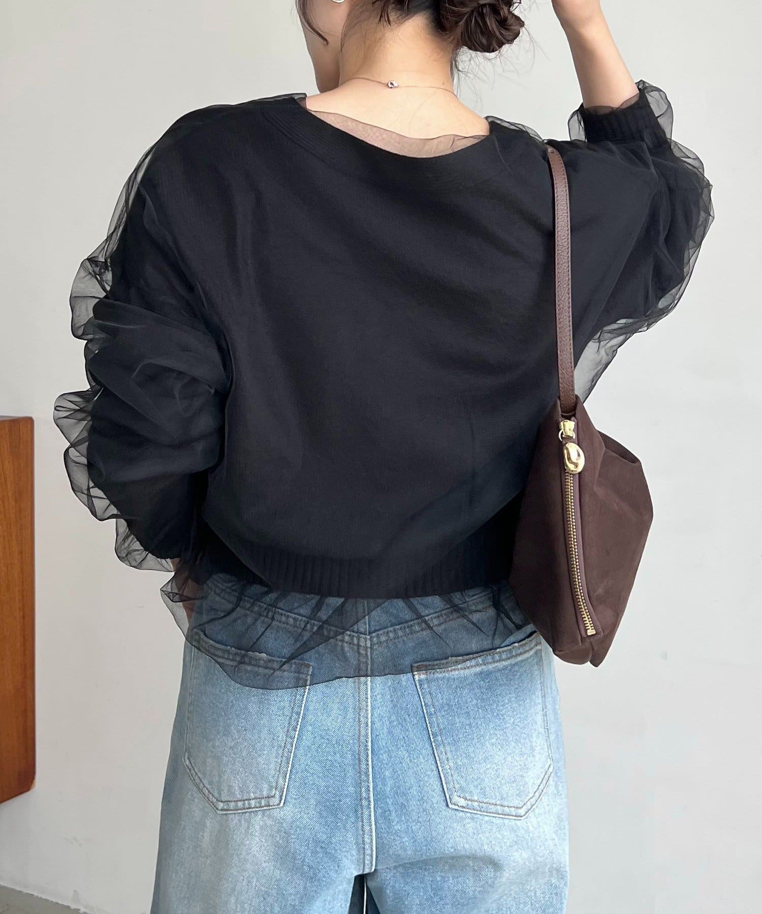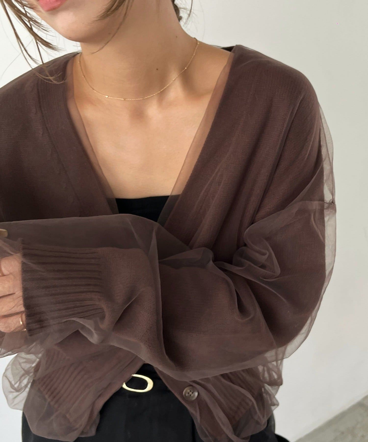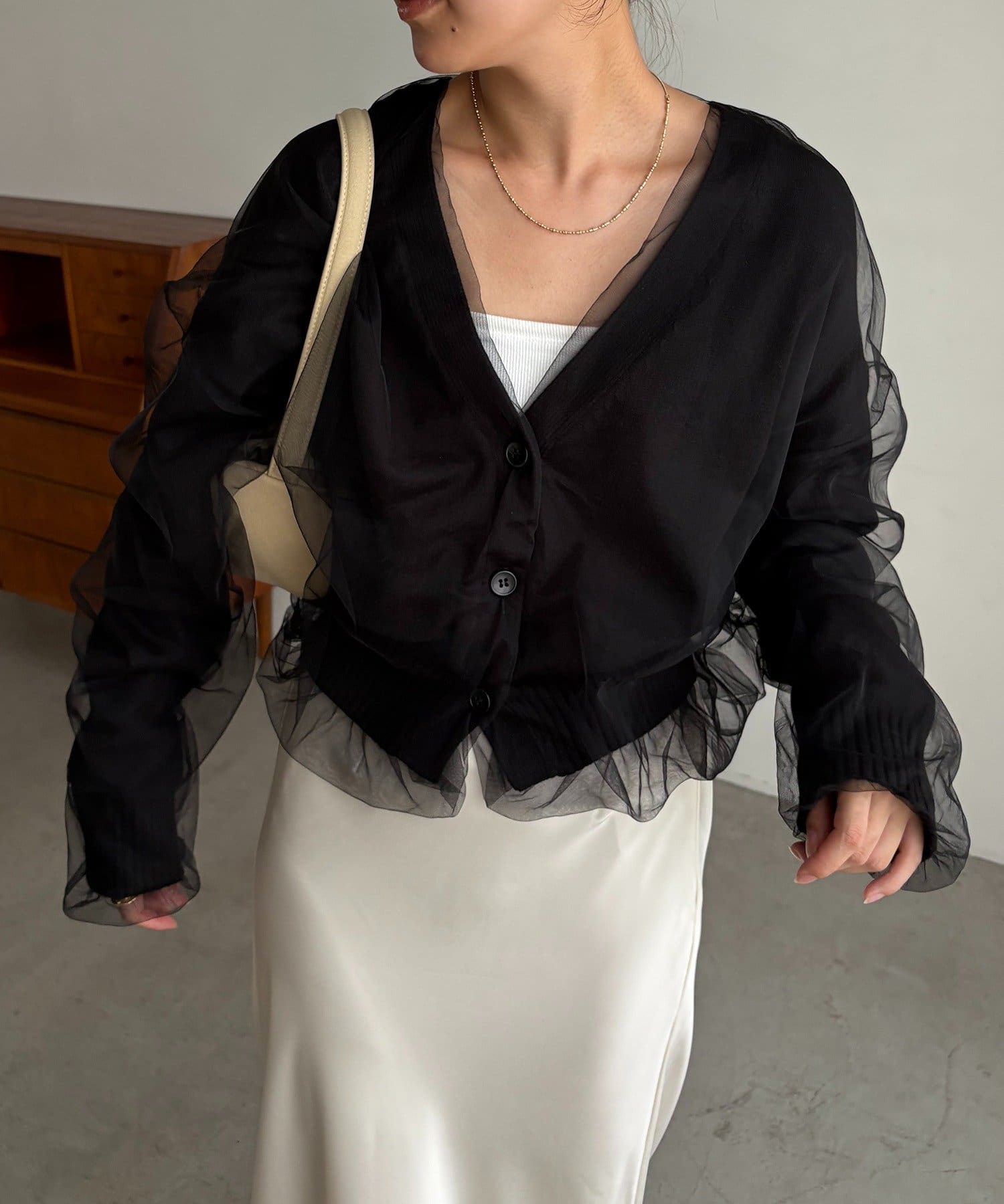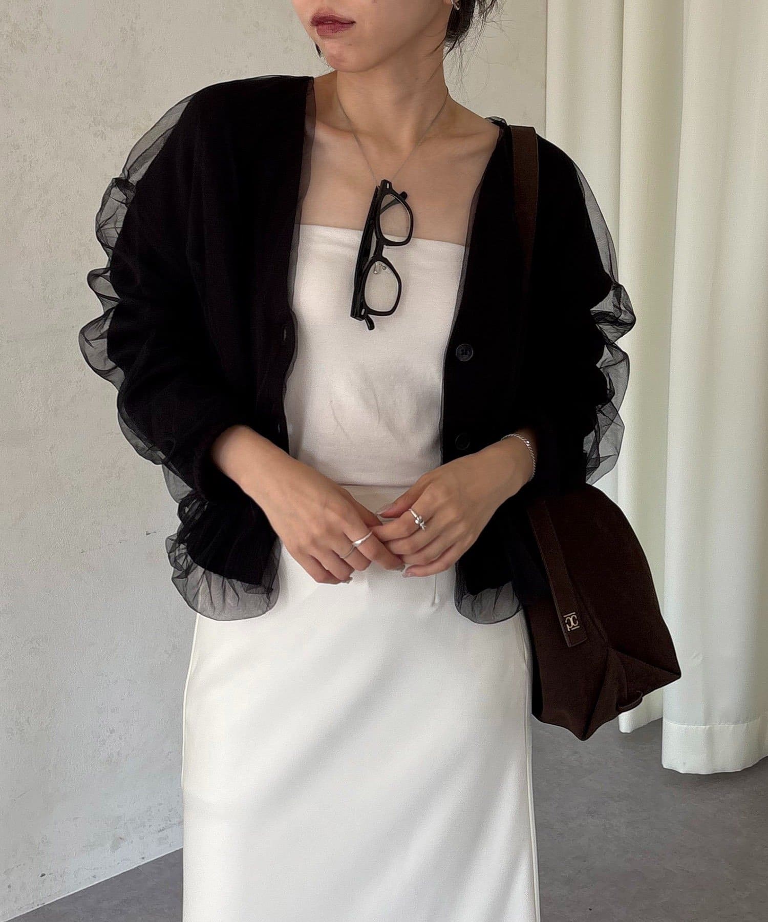 ・前立てや袖口などもチュールに覆われ、ニット部分が見えないことでモード感のある1枚に