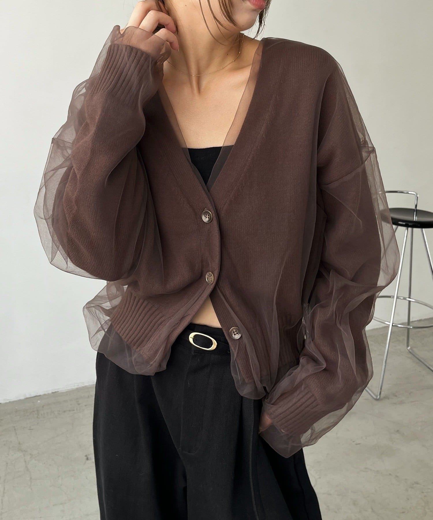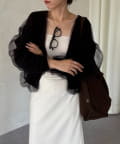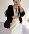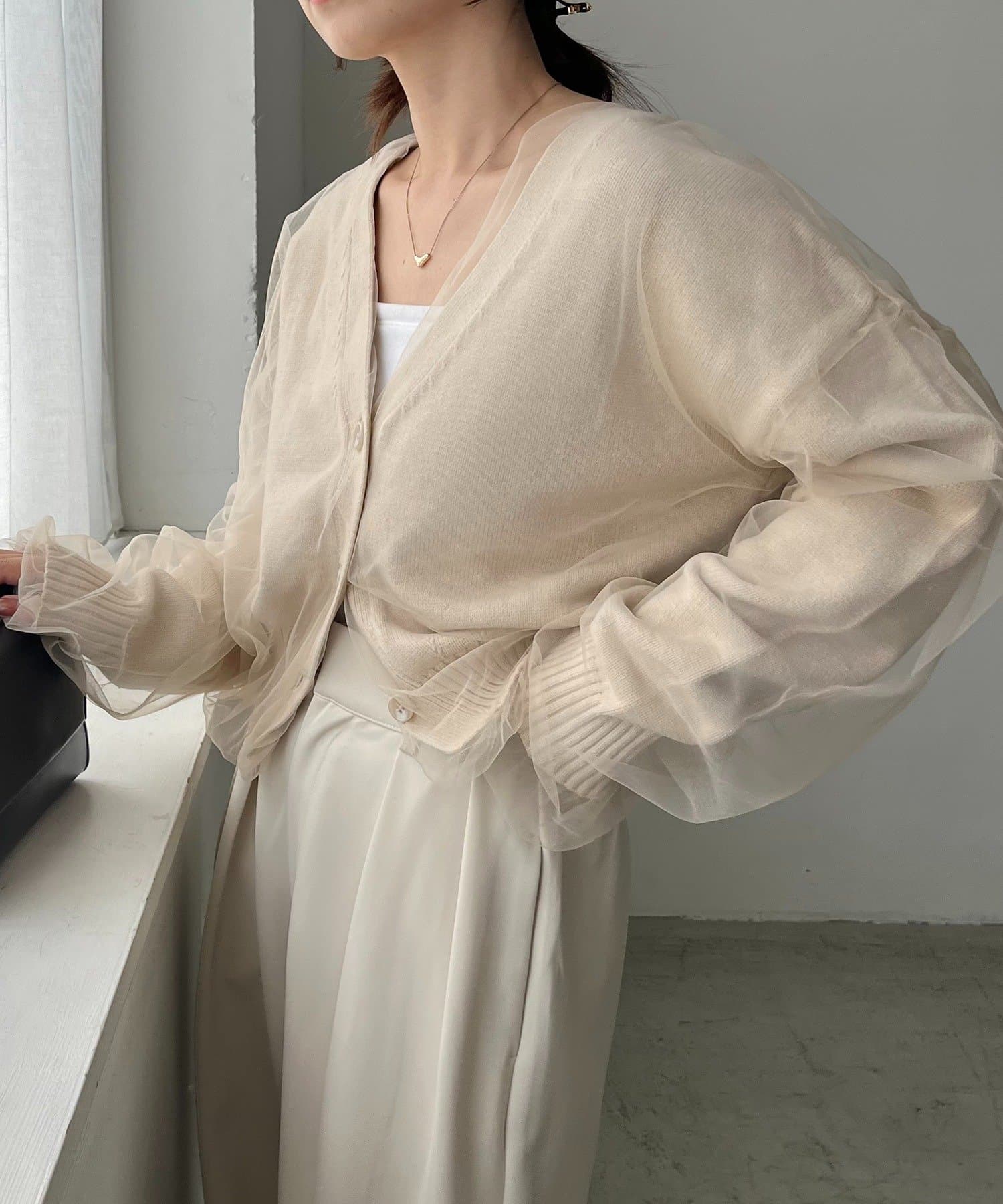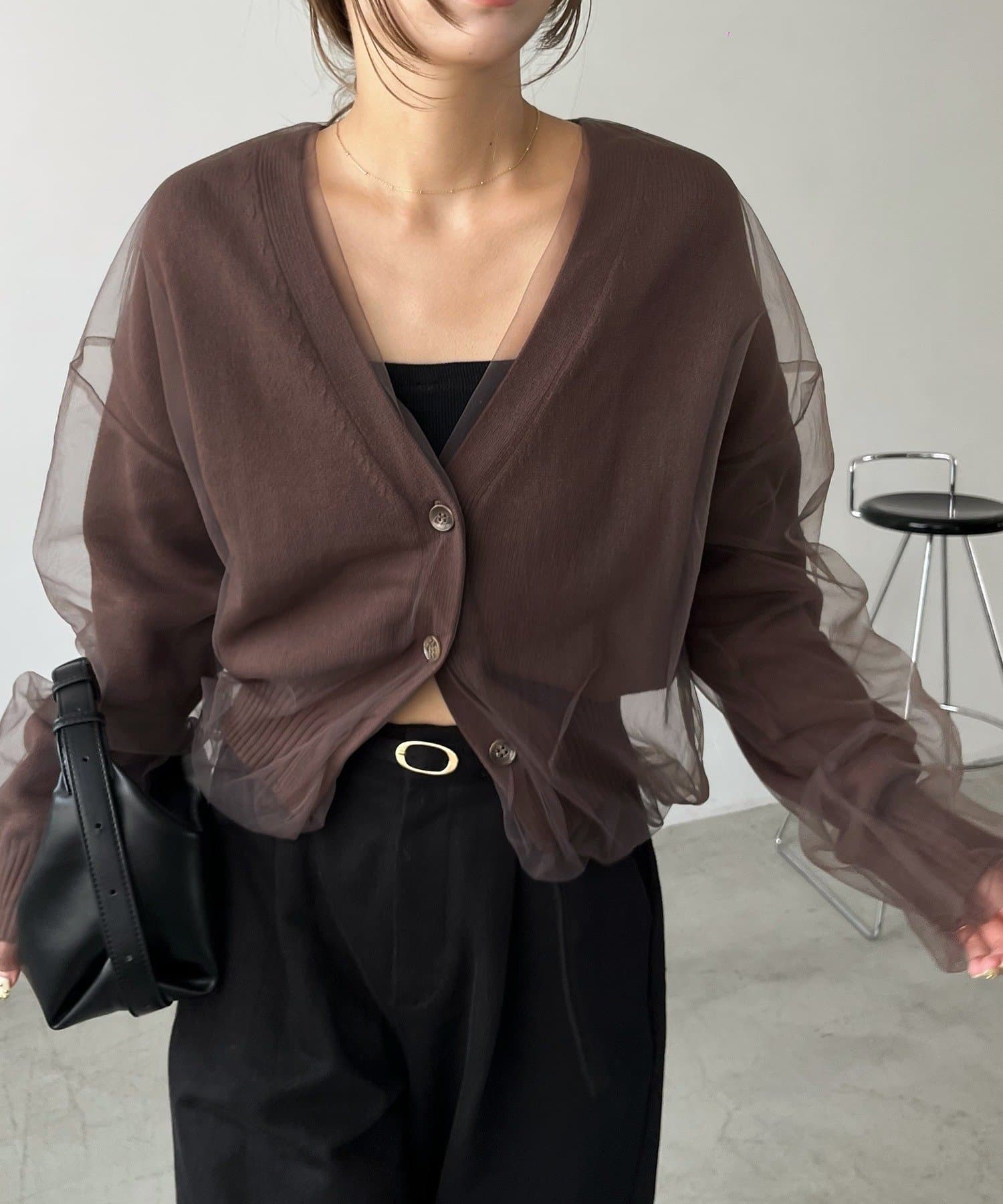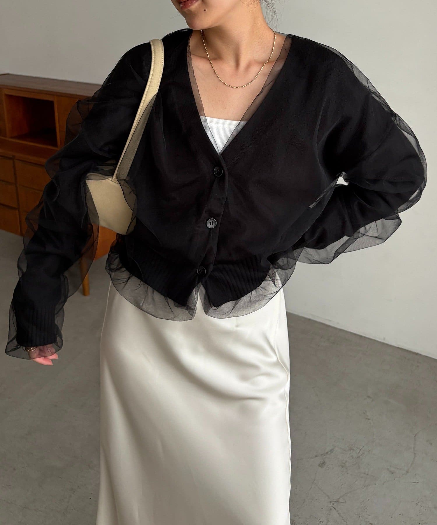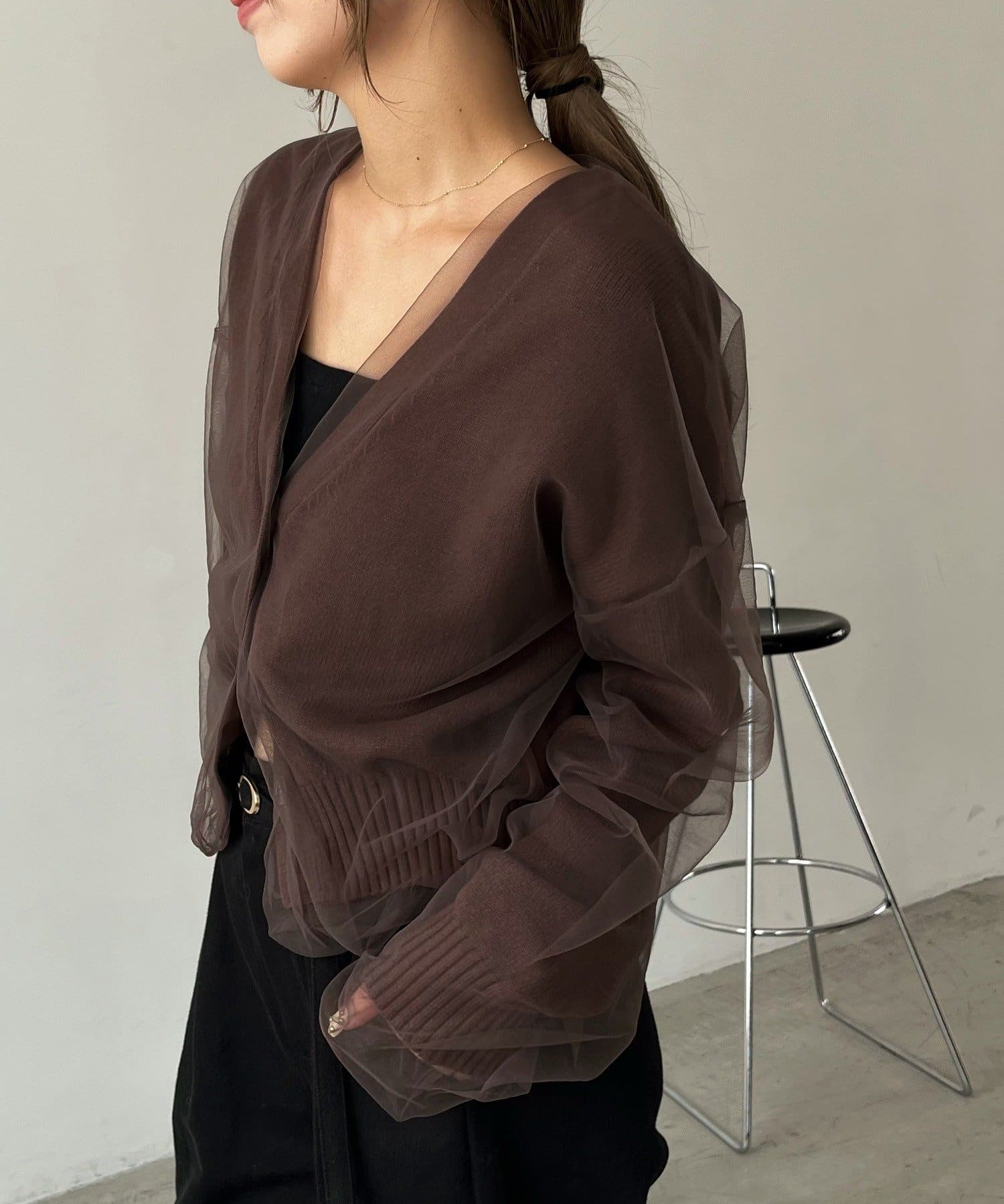 ・前立てや袖口などもチュールに覆われ、ニット部分が見えないことでモード感のある1枚に