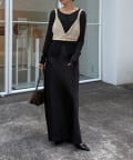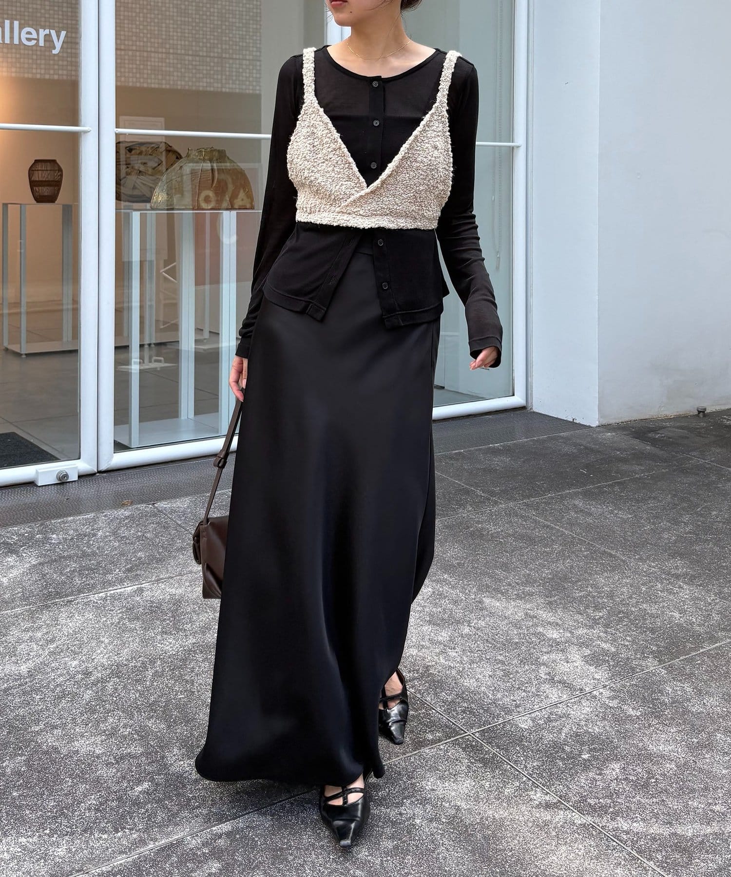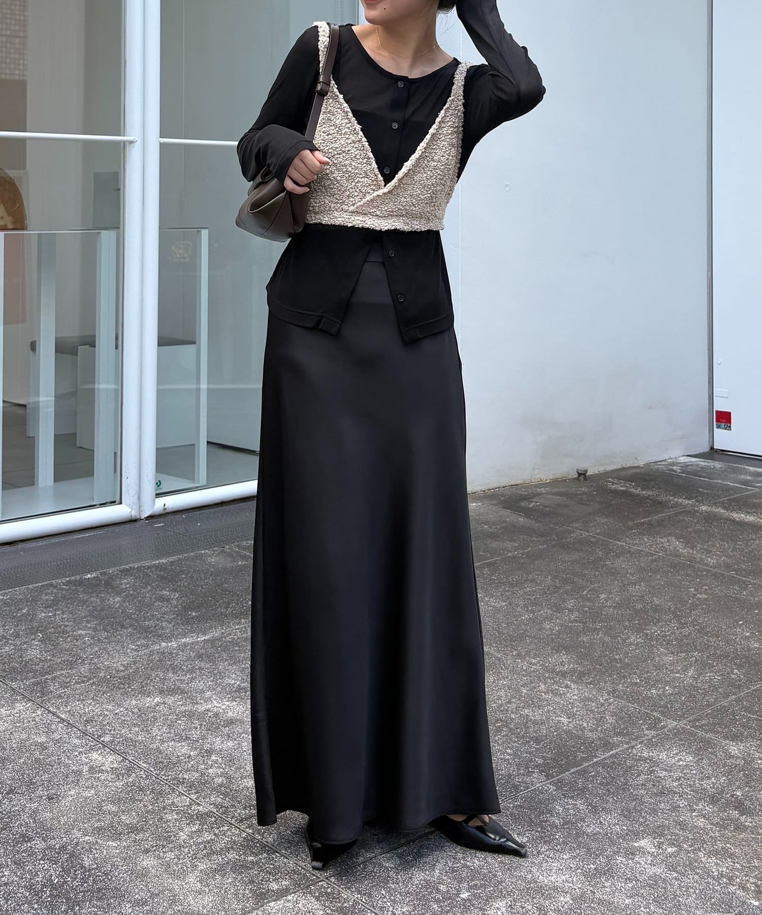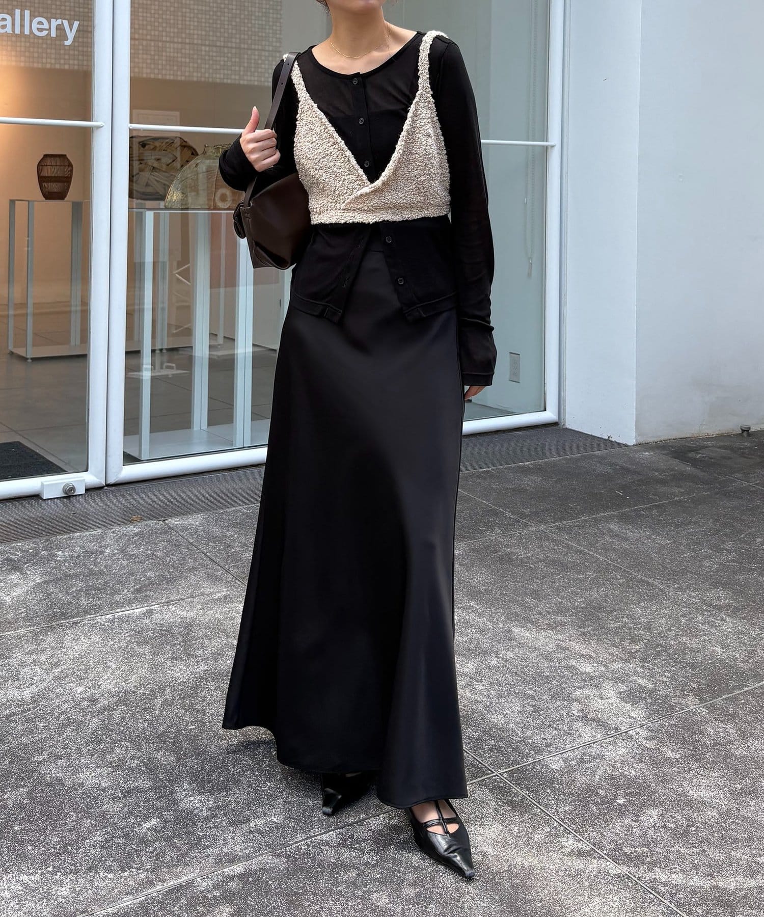 ・落ち感のあるマキシスカートに合わせて女性らしく