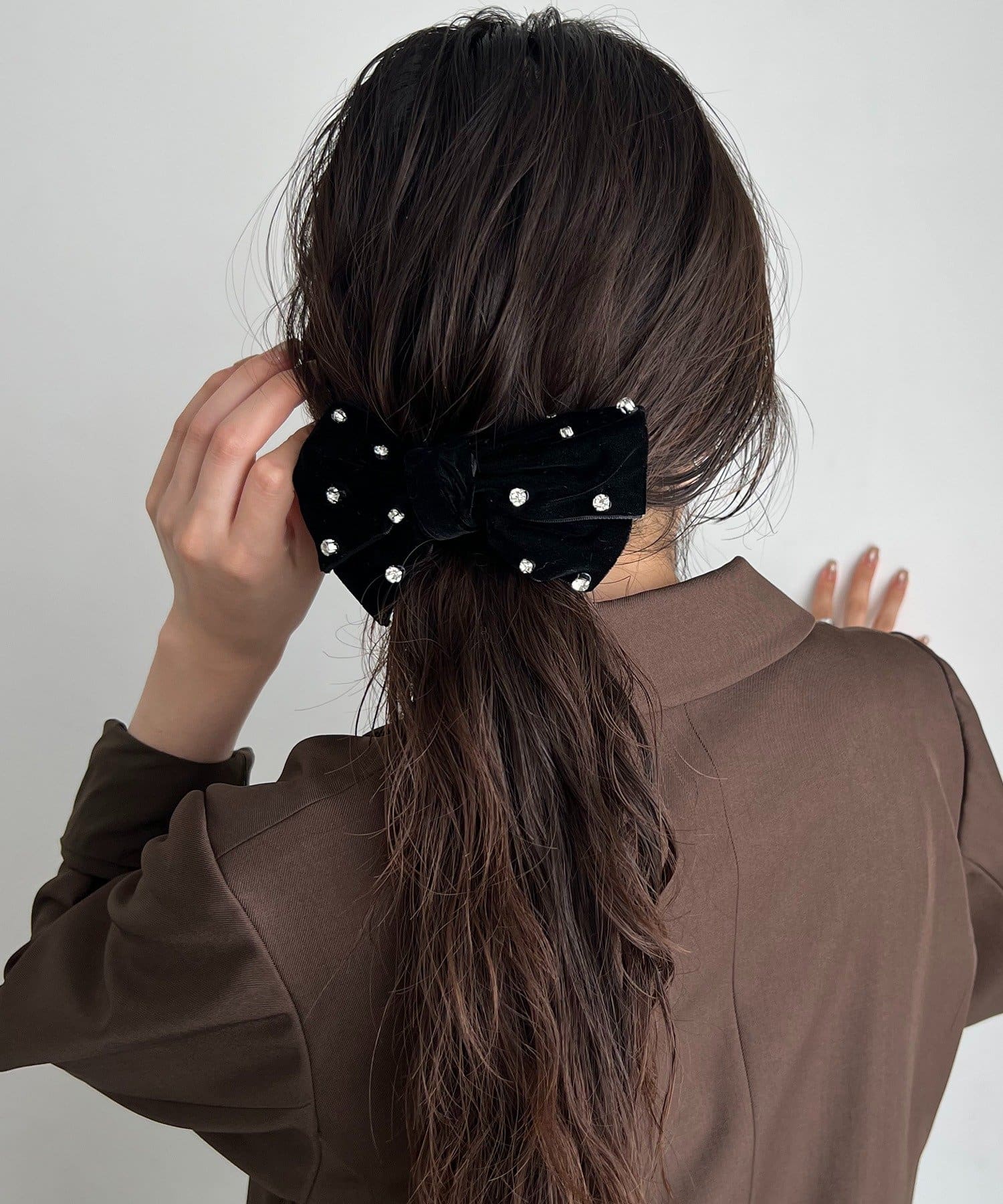 ベロアリボン×ビジューで大人可愛い印象に。