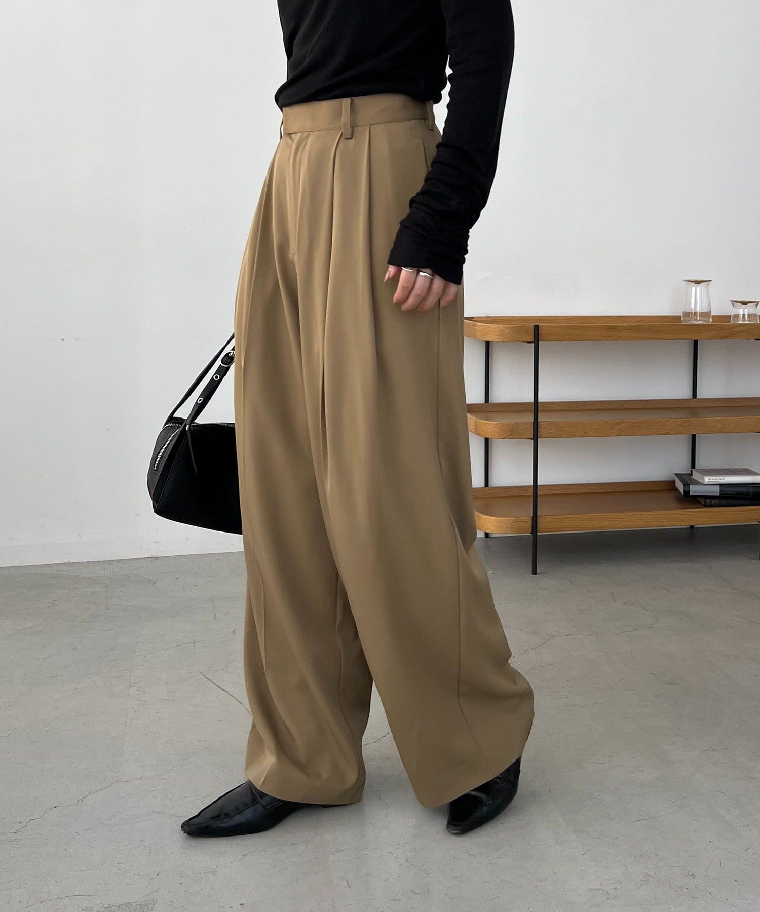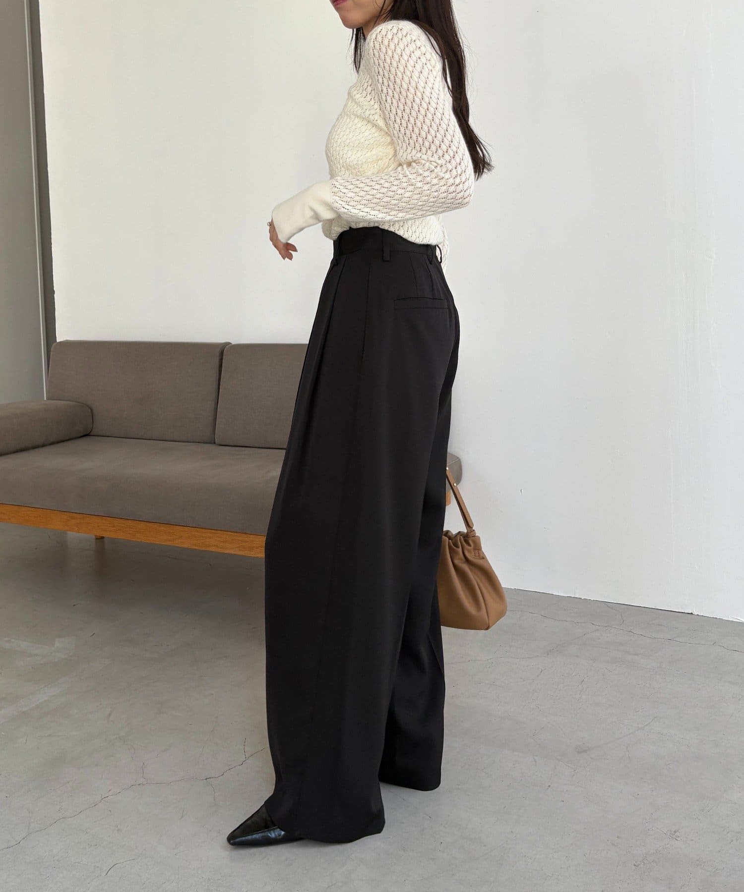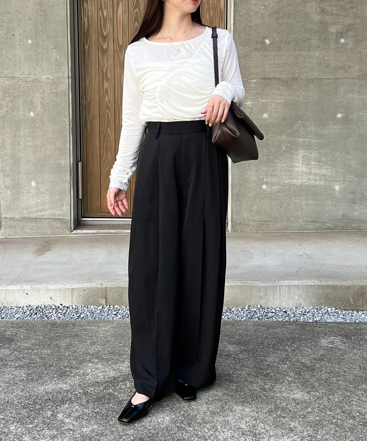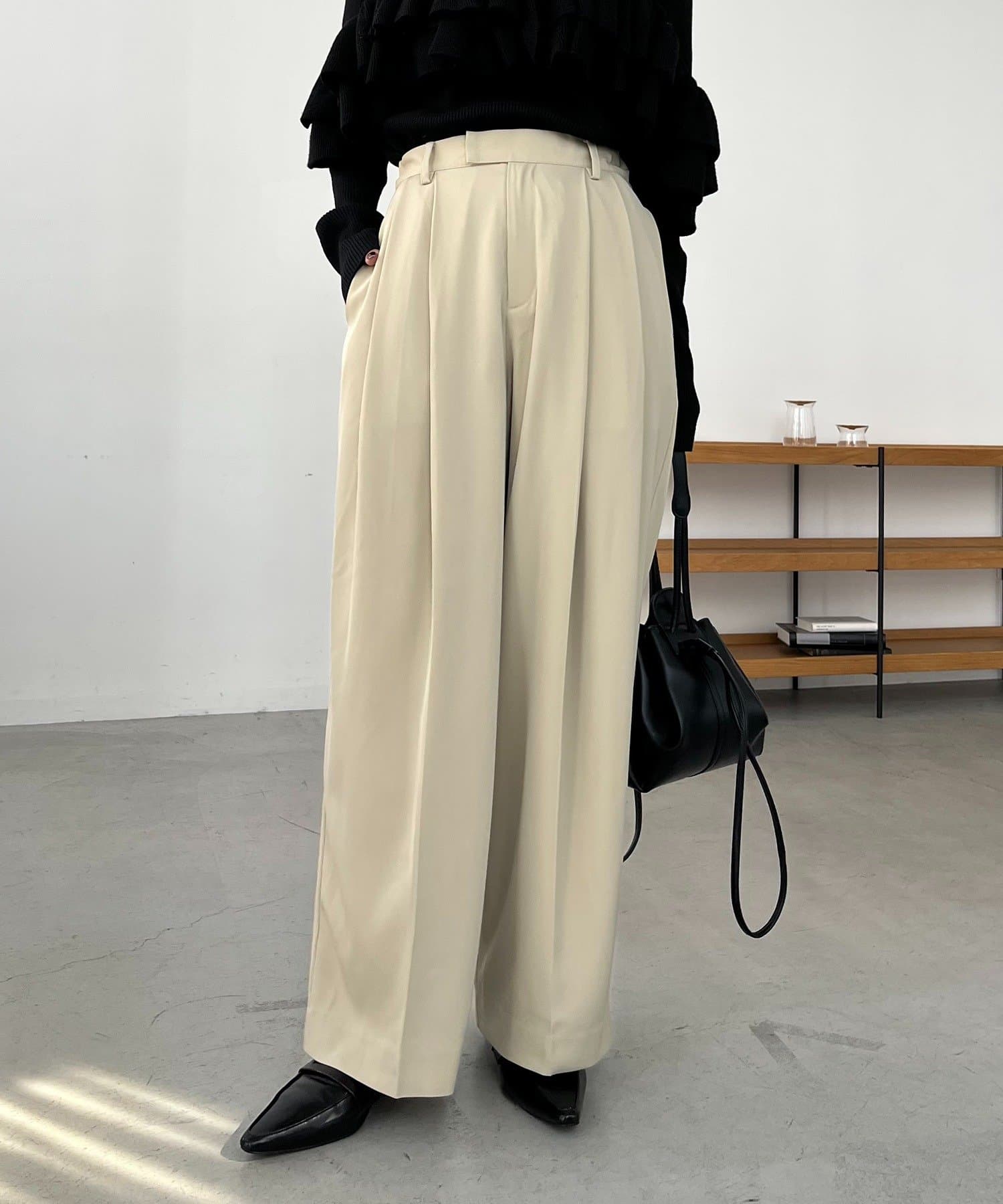 ・レマージュでロングセラーの2タックワイドパンツに比べより落ち感のある生地