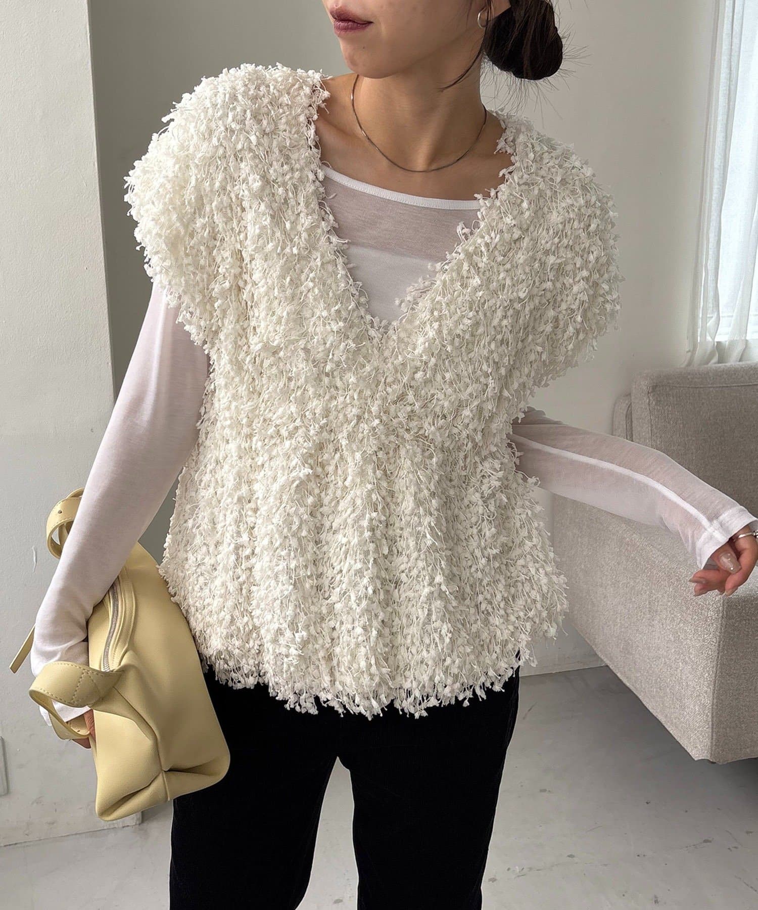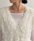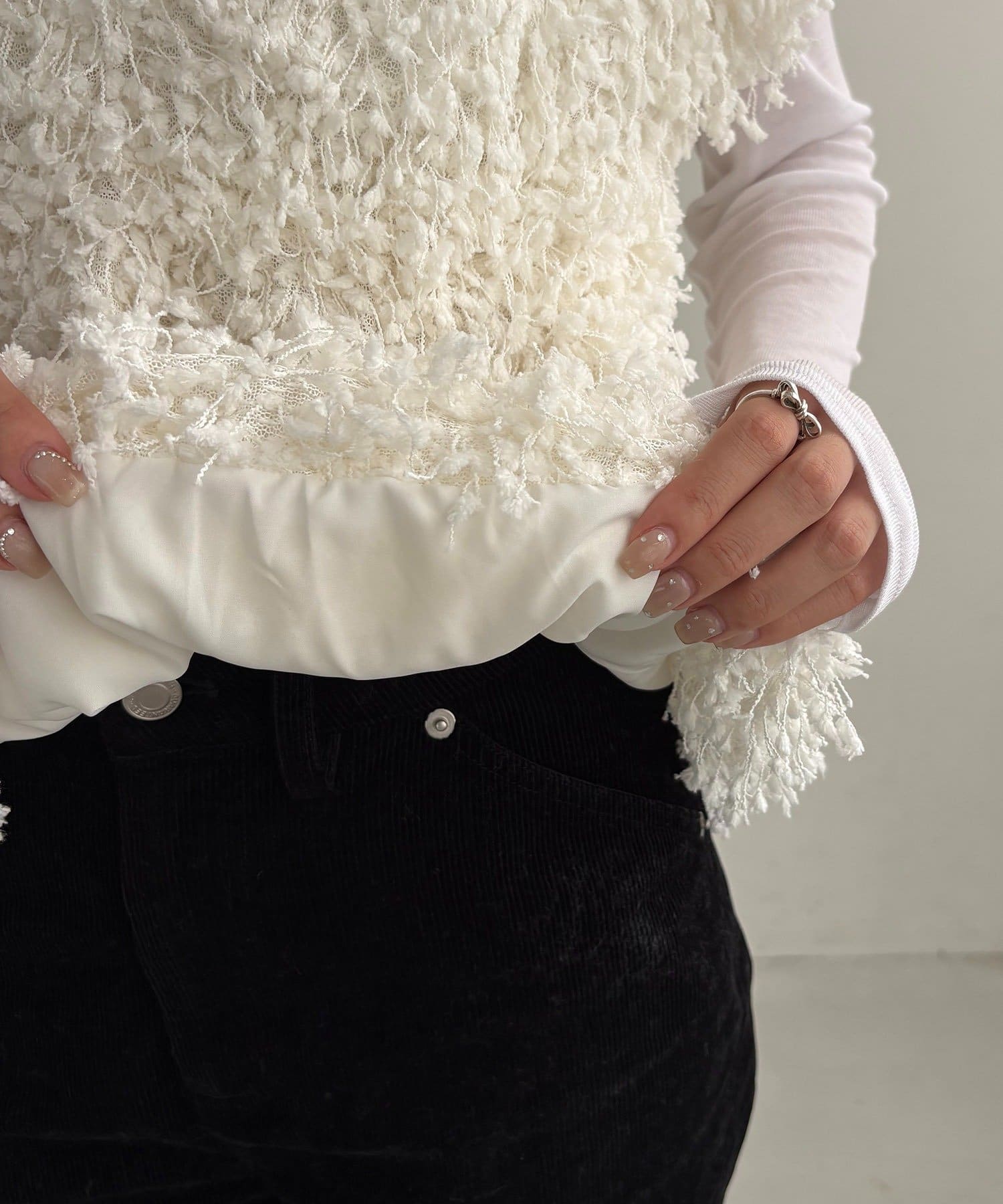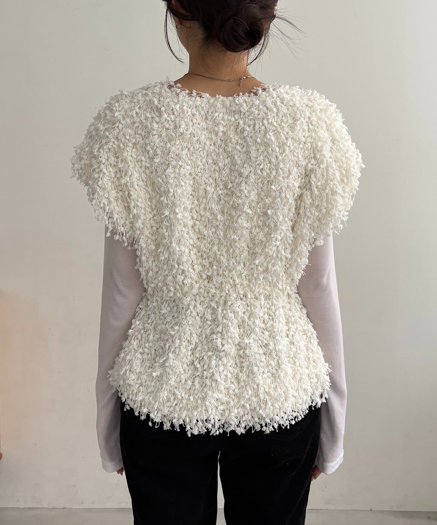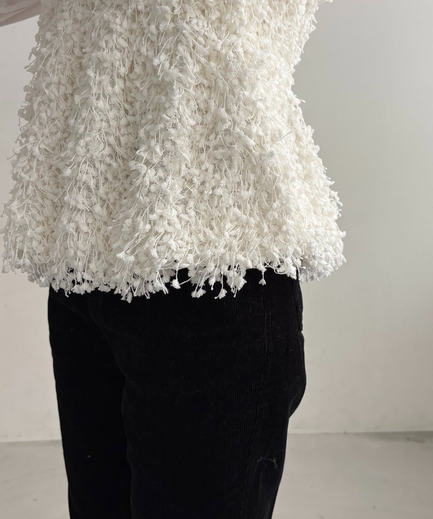 凹凸感のあるフリンジ素材が華やかな印象のトップス