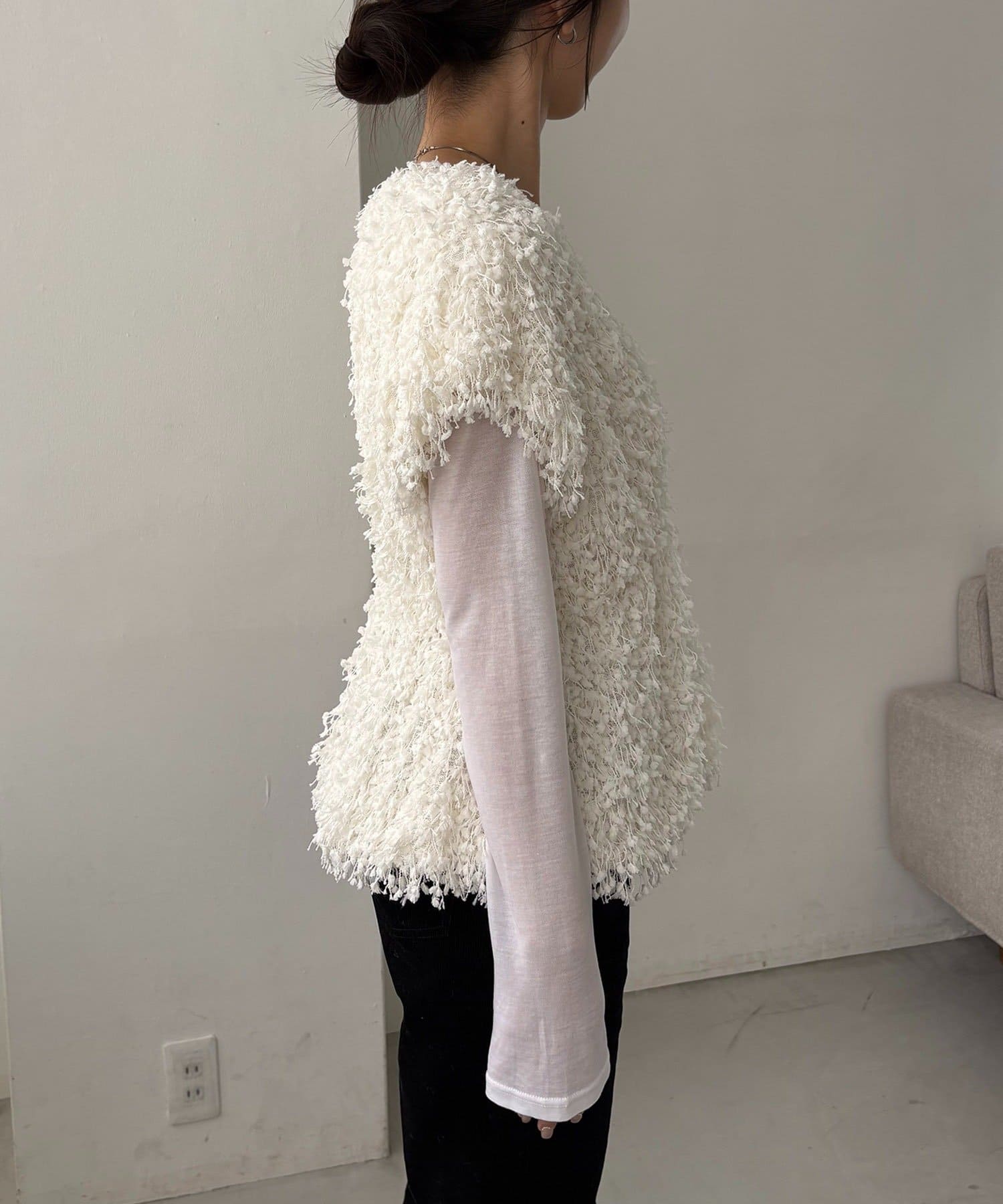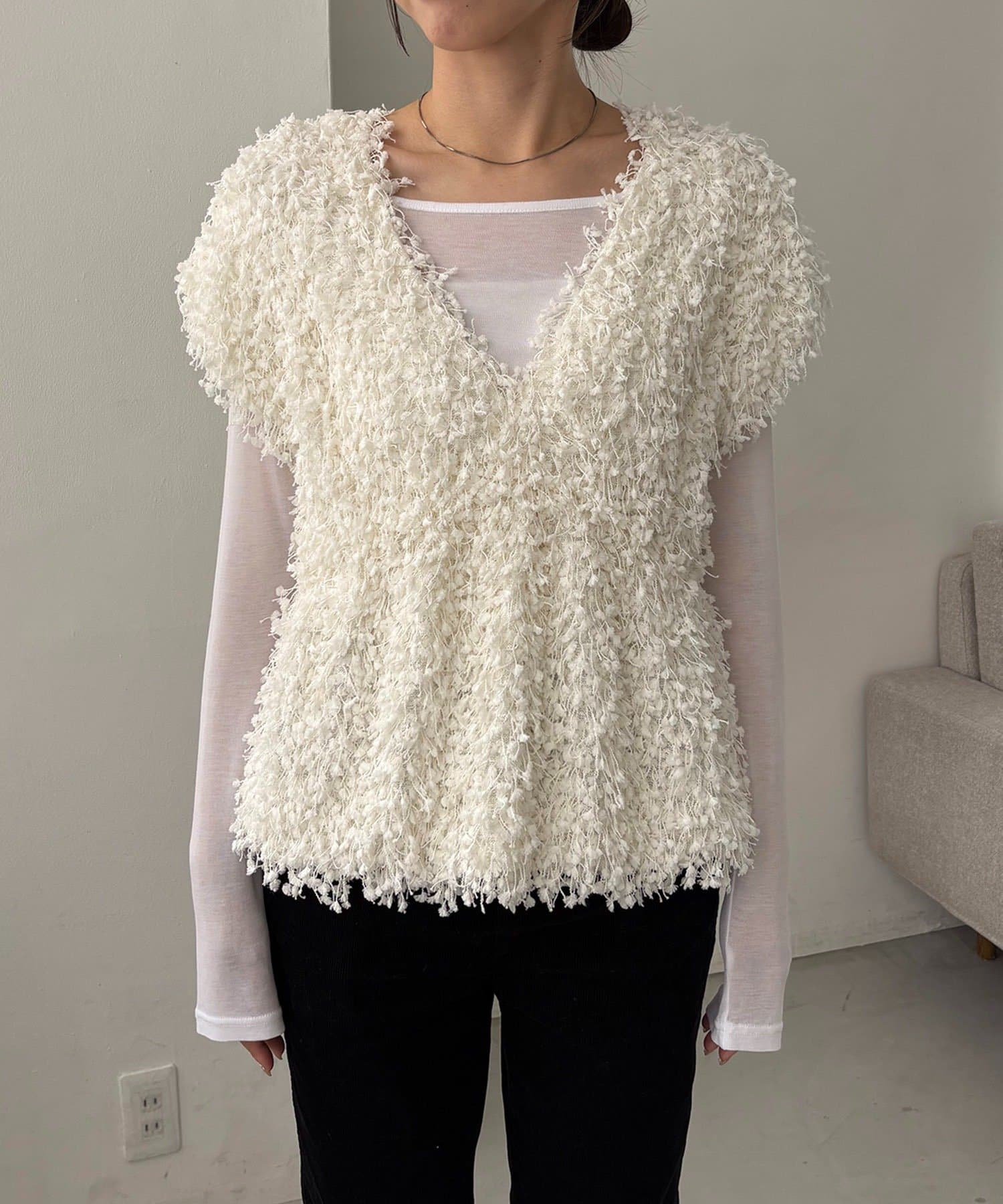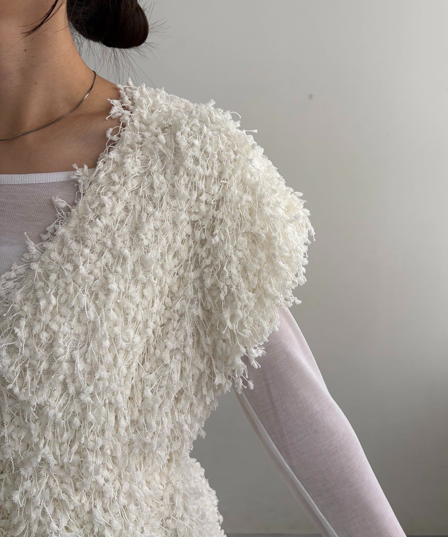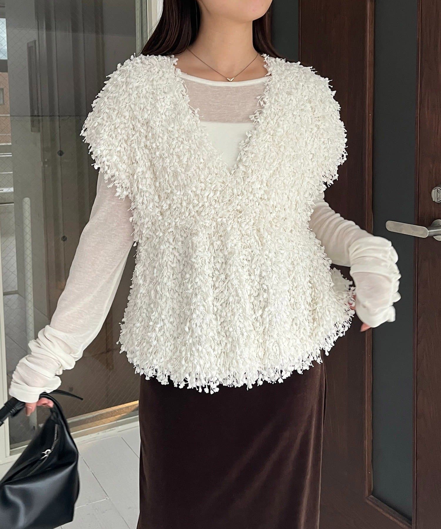 凹凸感のあるフリンジ素材が華やかな印象のトップス
