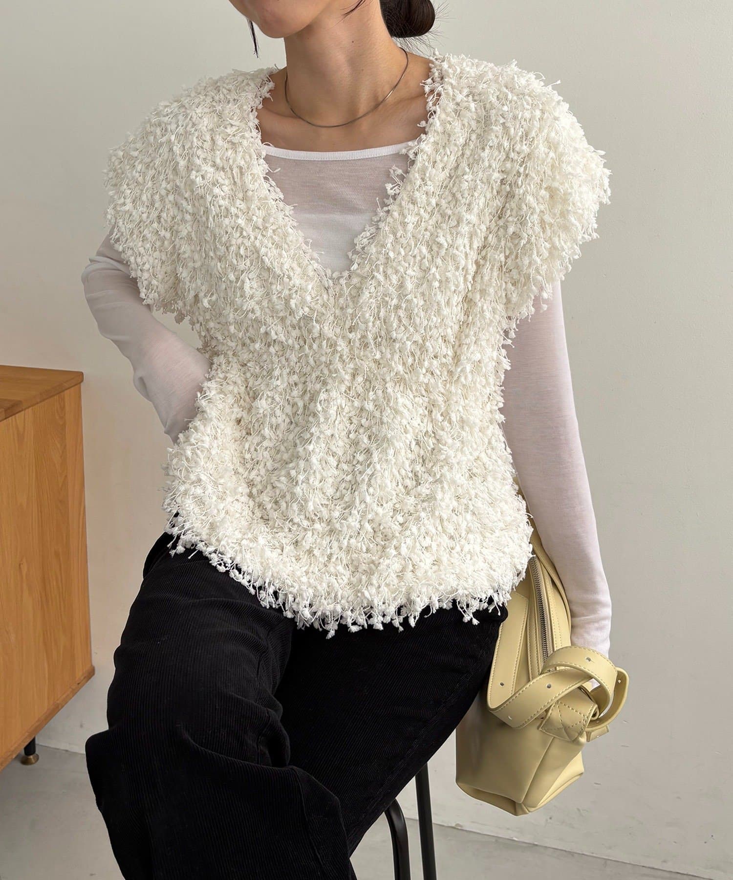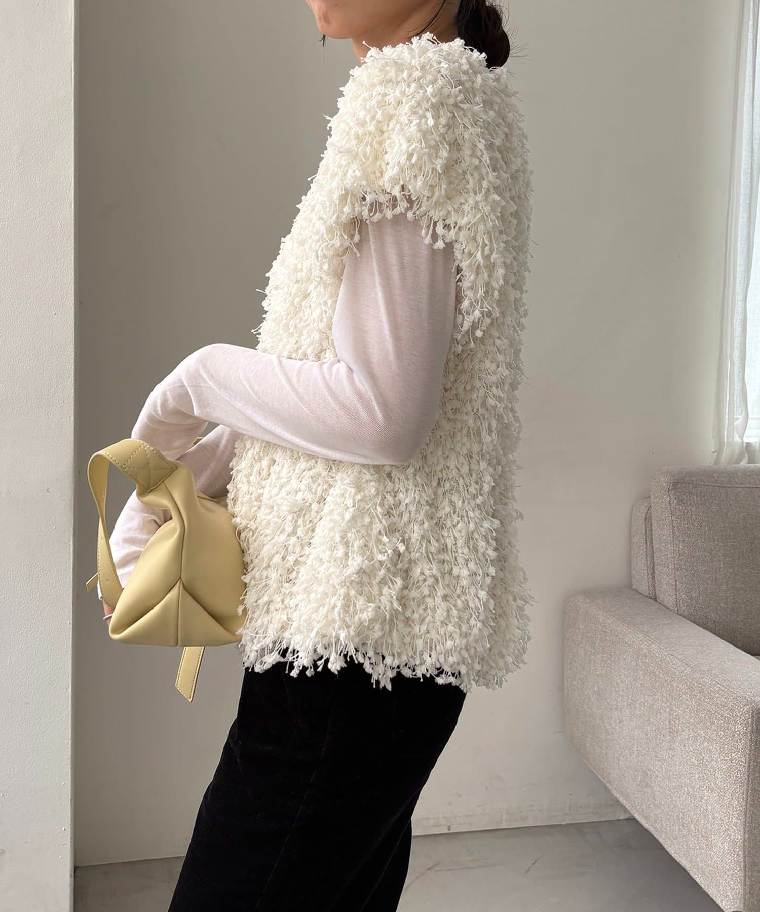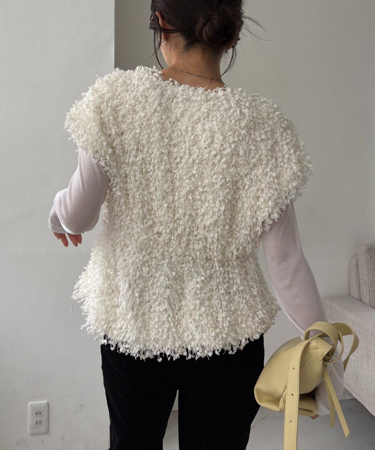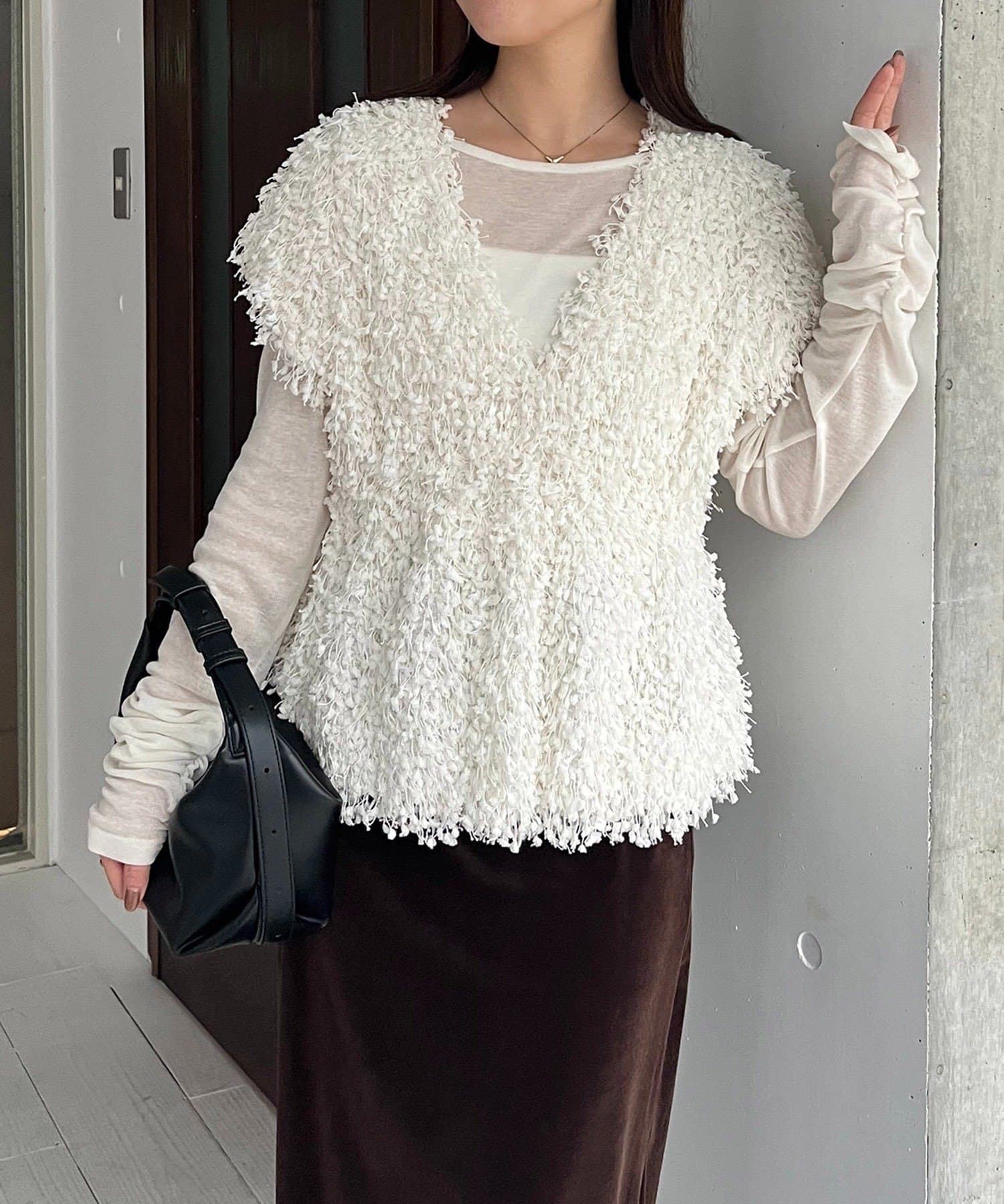 凹凸感のあるフリンジ素材が華やかな印象のトップス