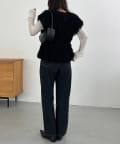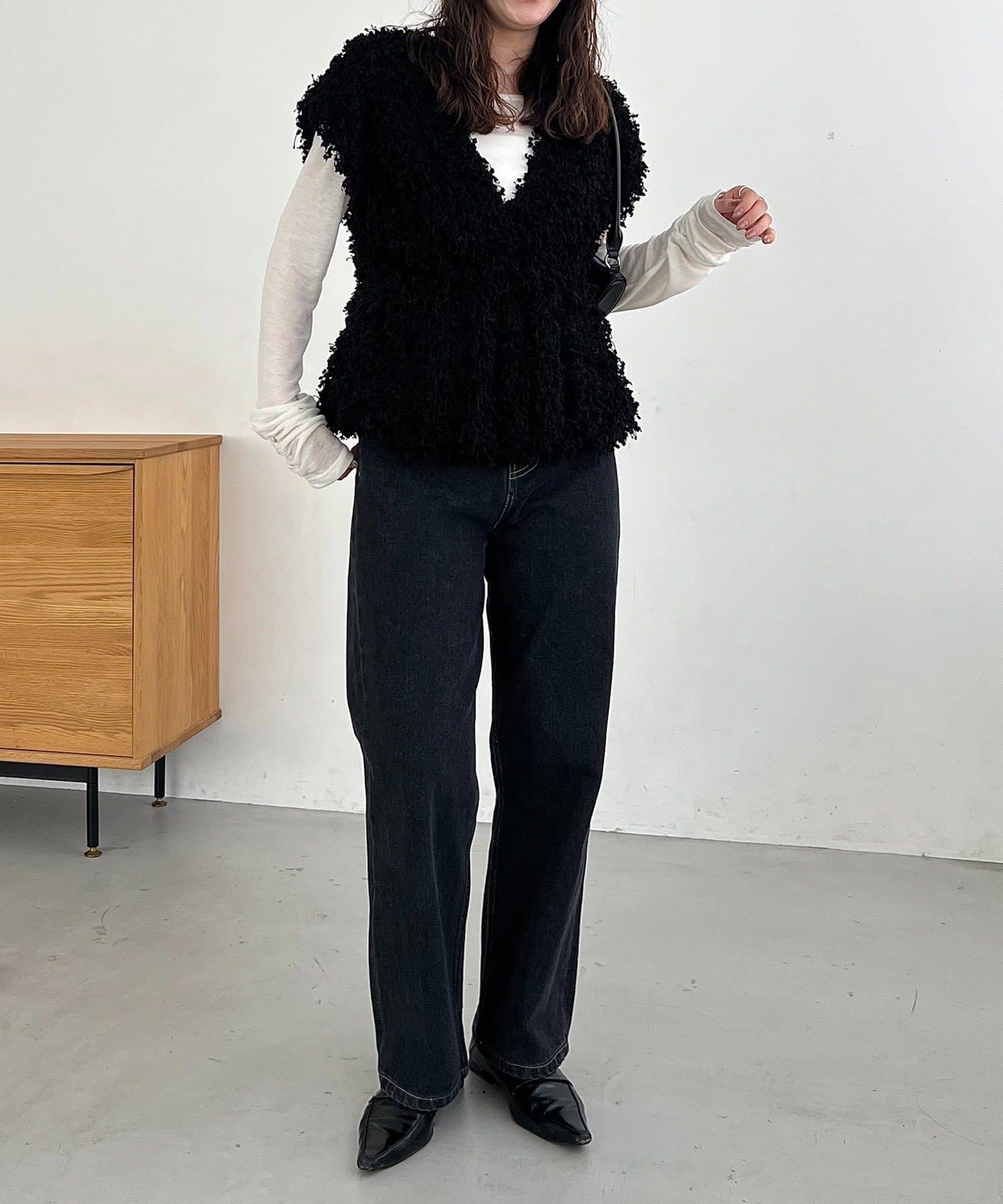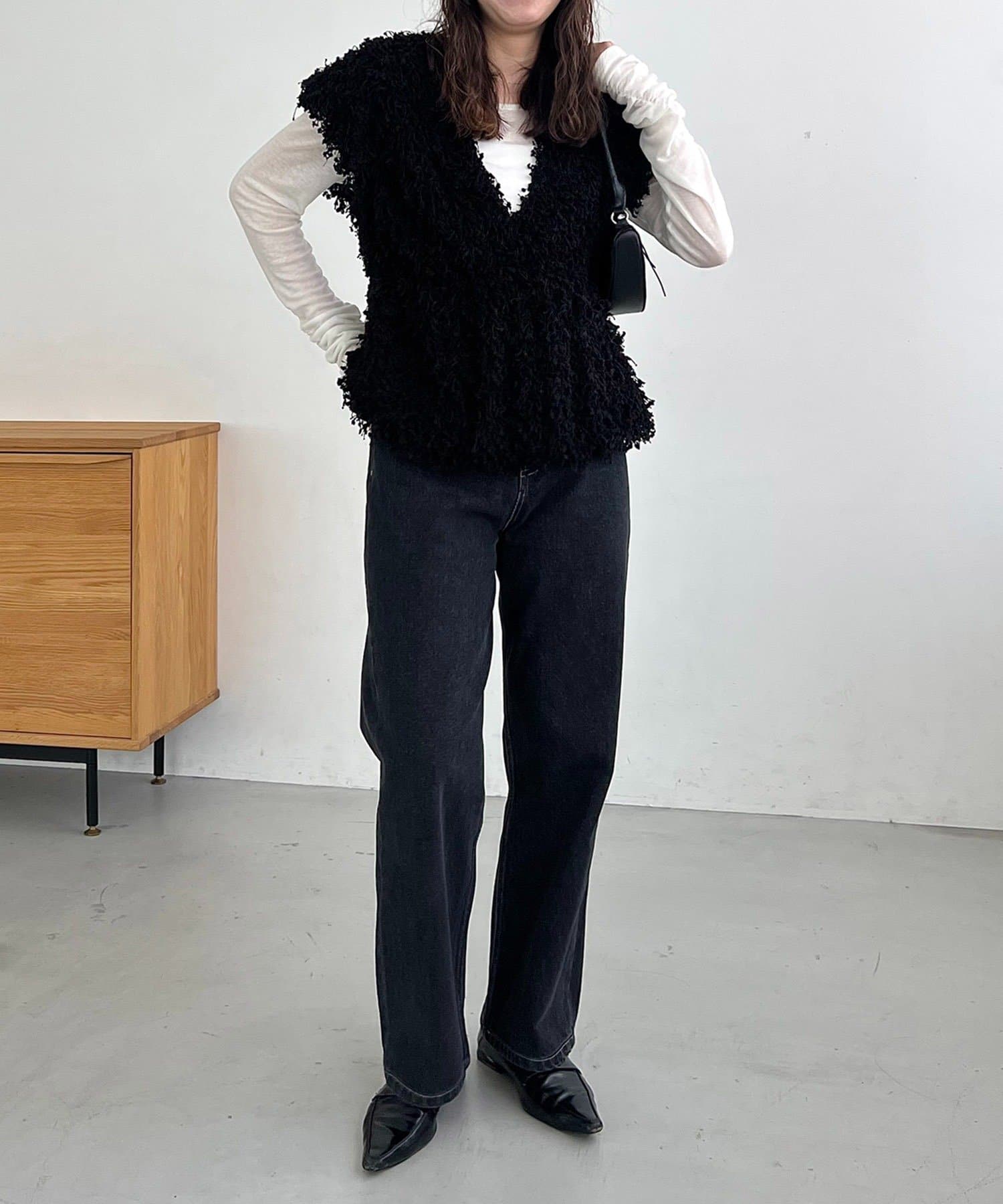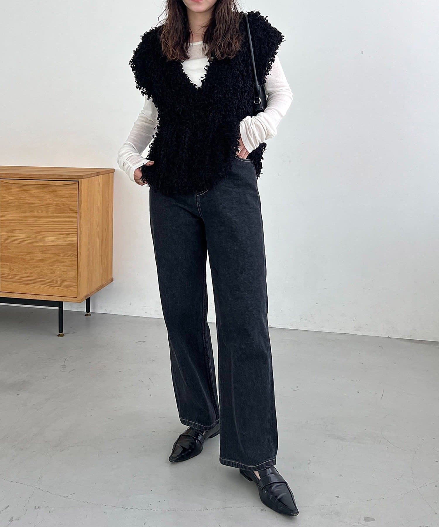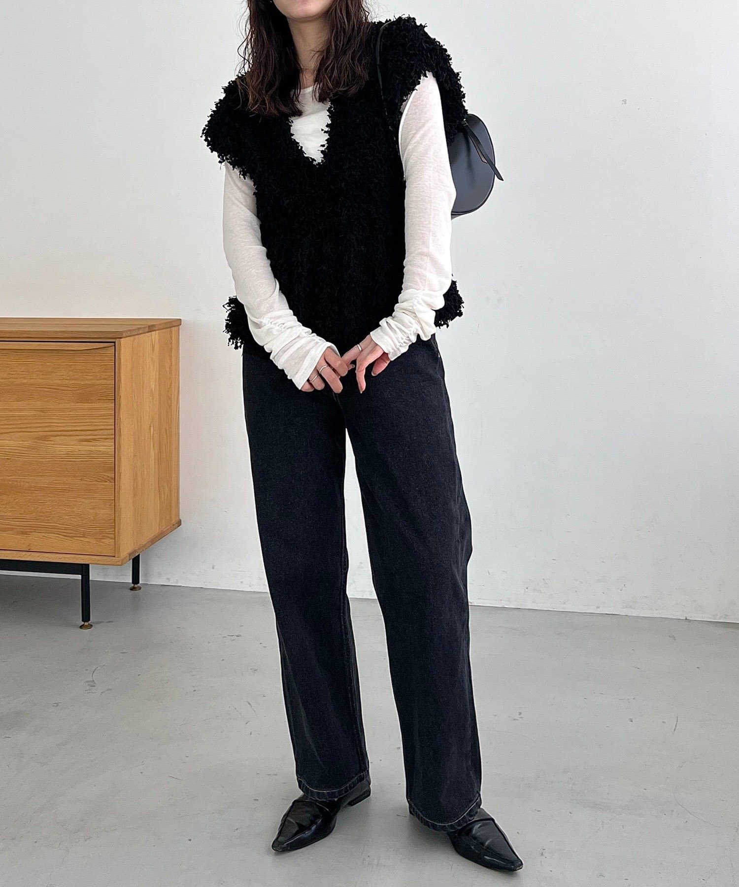 【ブラック着用アイテム】インナー:テンセルウール袖ギャザーロンT、パンツ:13ozハイウエストストレートデニム