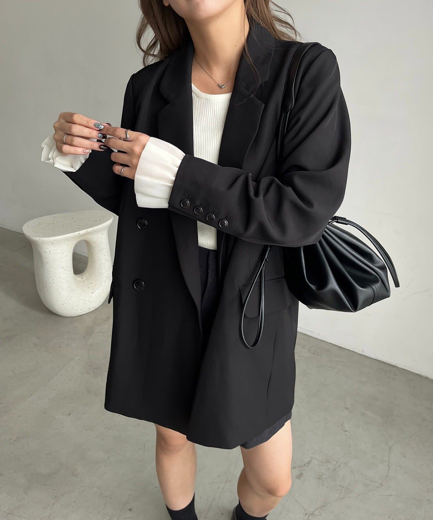 【ブラック着用アイテム③】アウター:Wテーラージャケット、パンツ:ピーチタッチショートパンツ