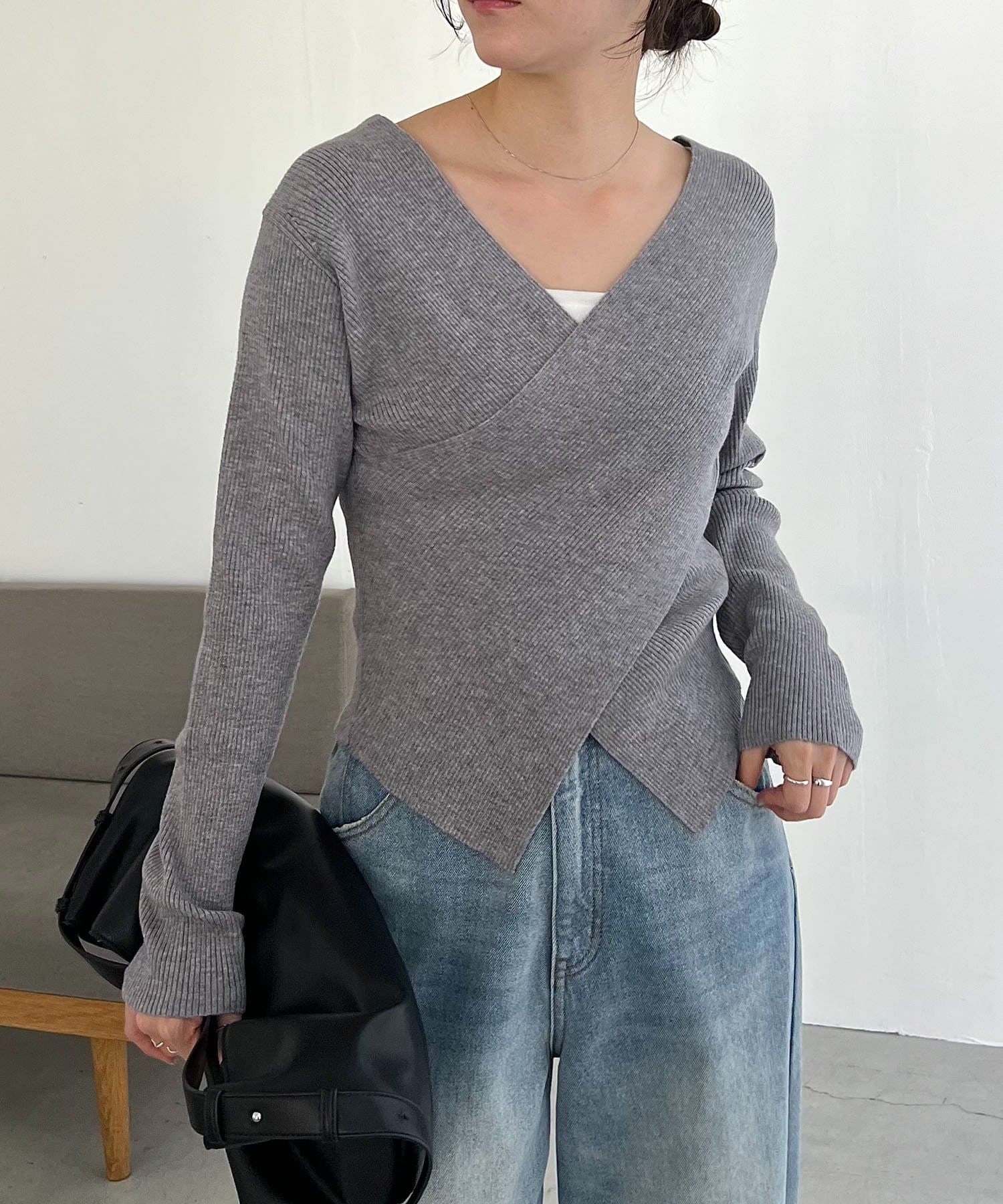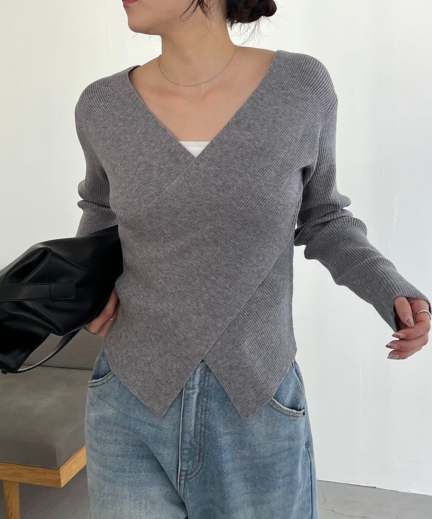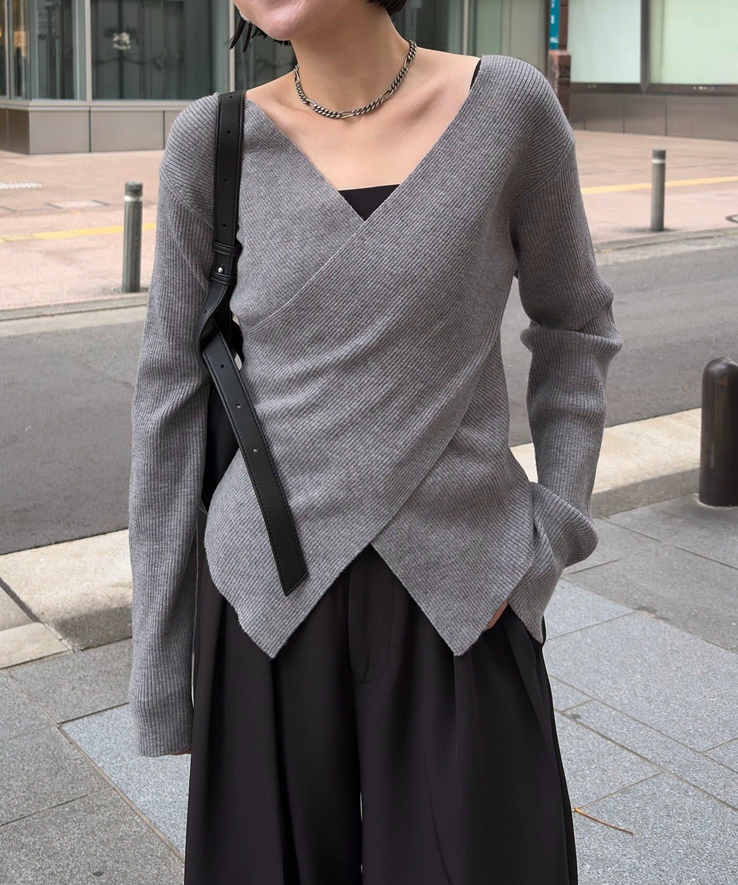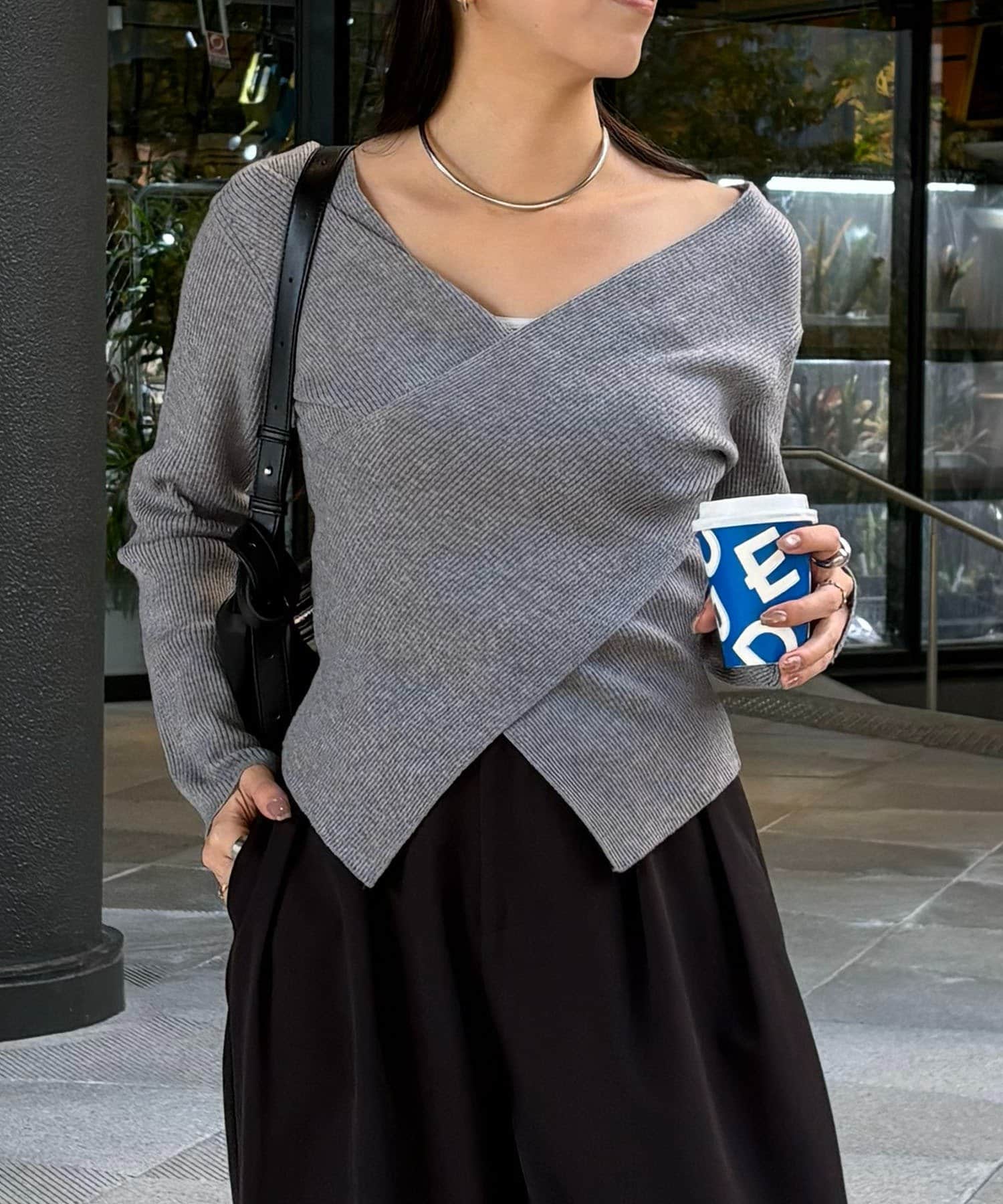 【新色/ライトベージュ・グレー】クロスVネックニット