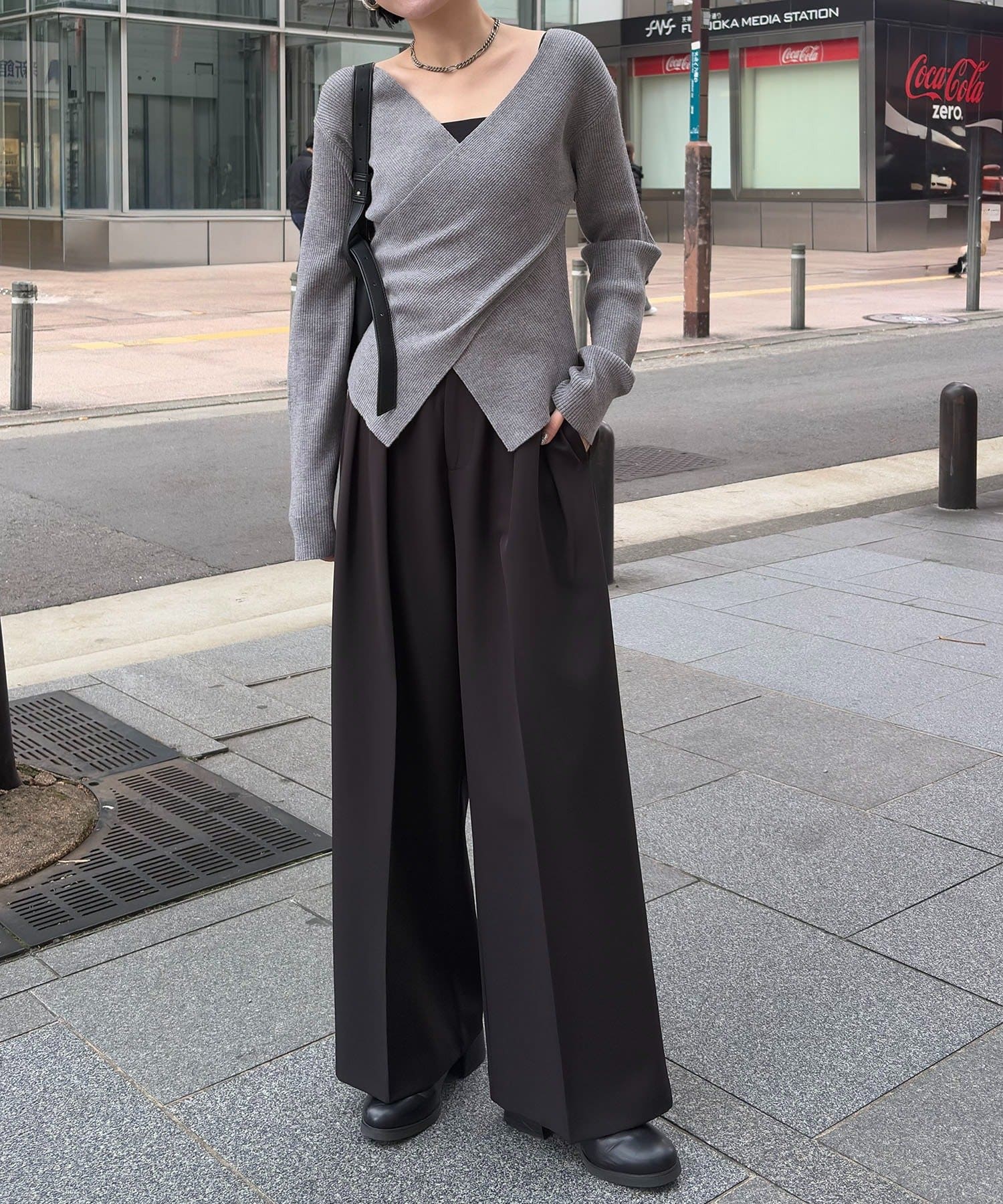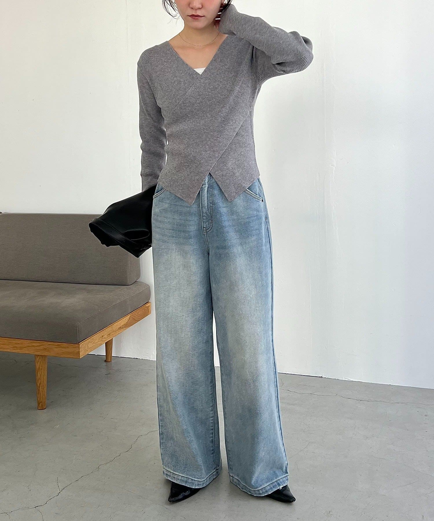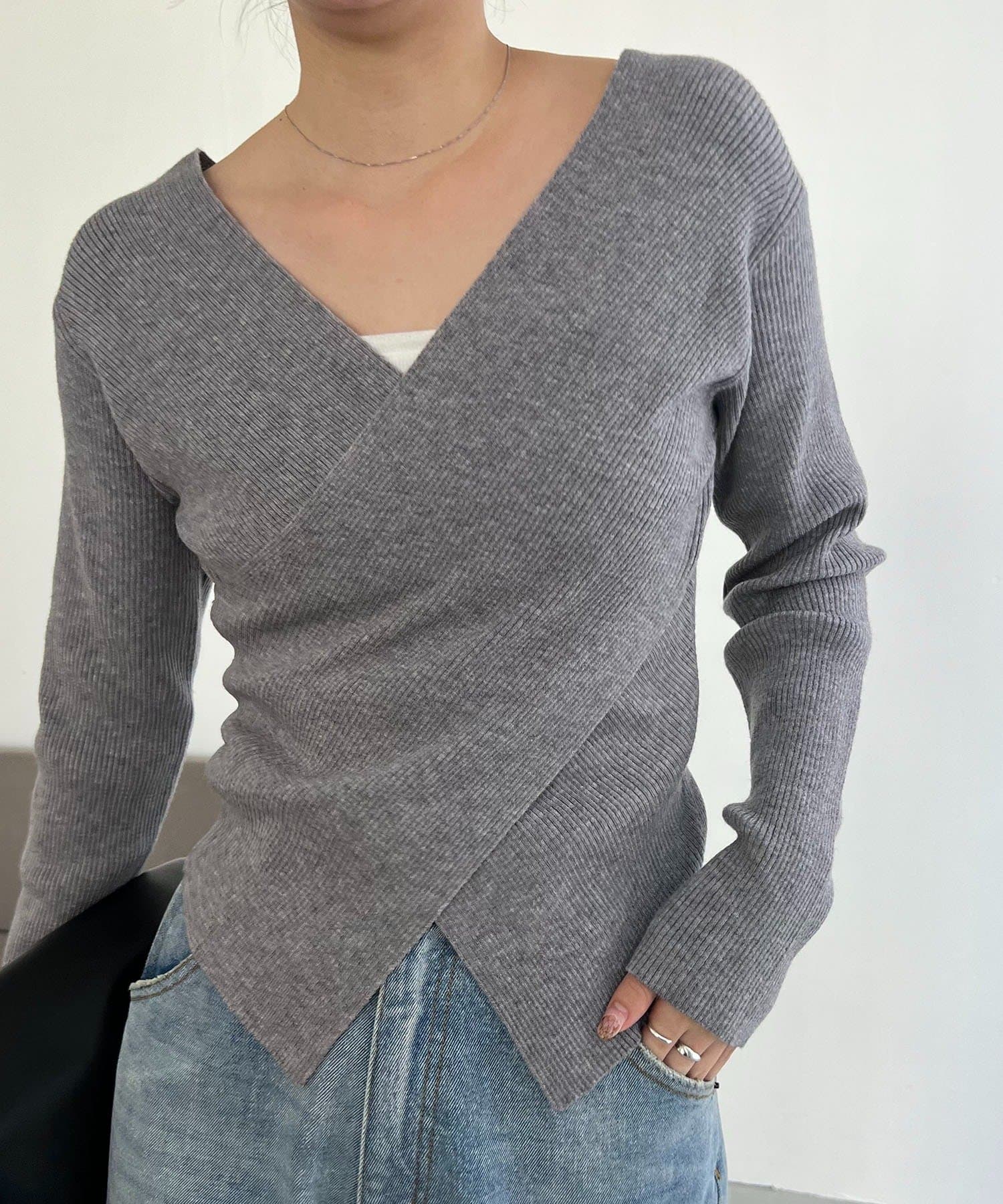 【新色/ライトベージュ・グレー】クロスVネックニット