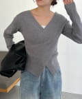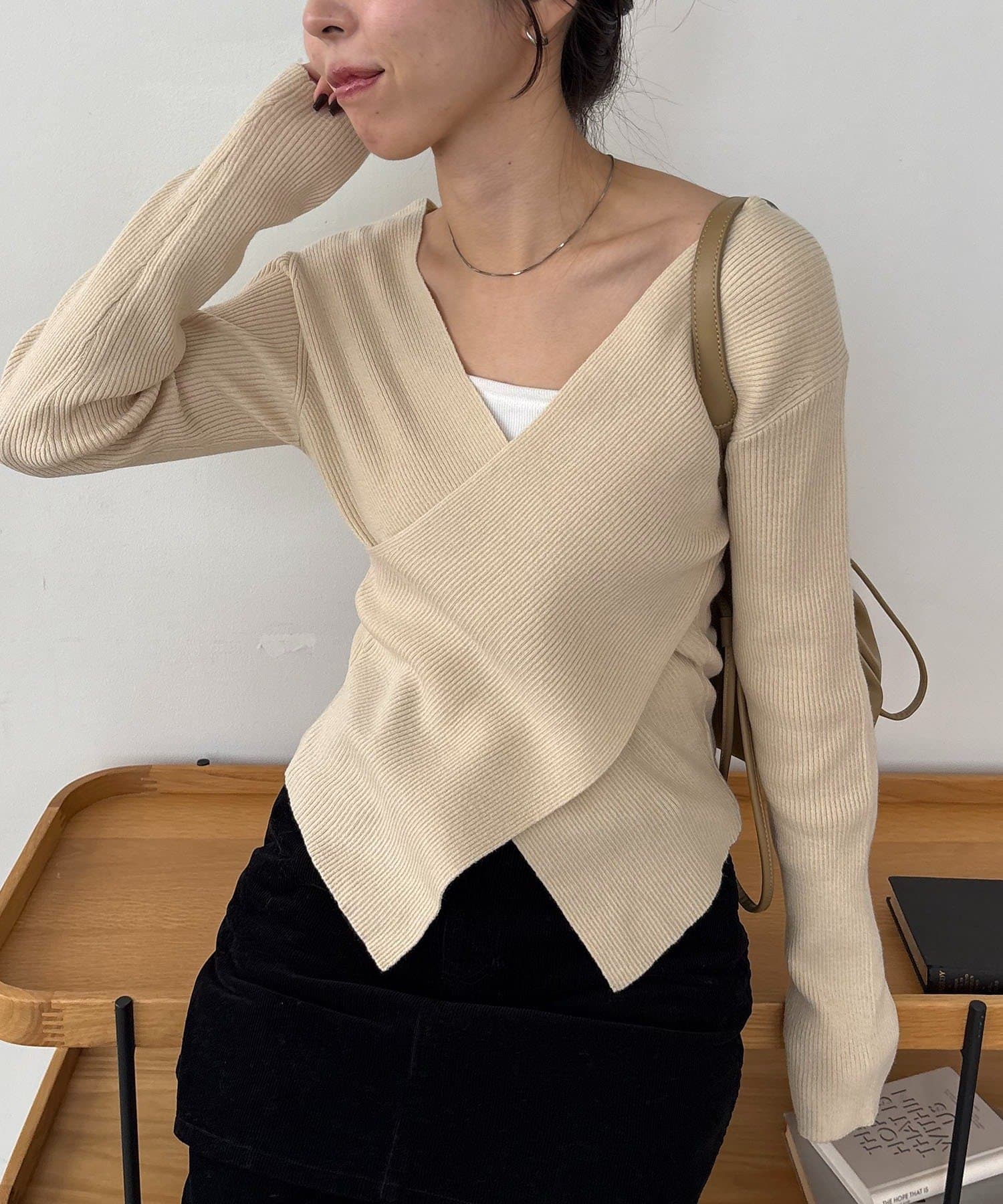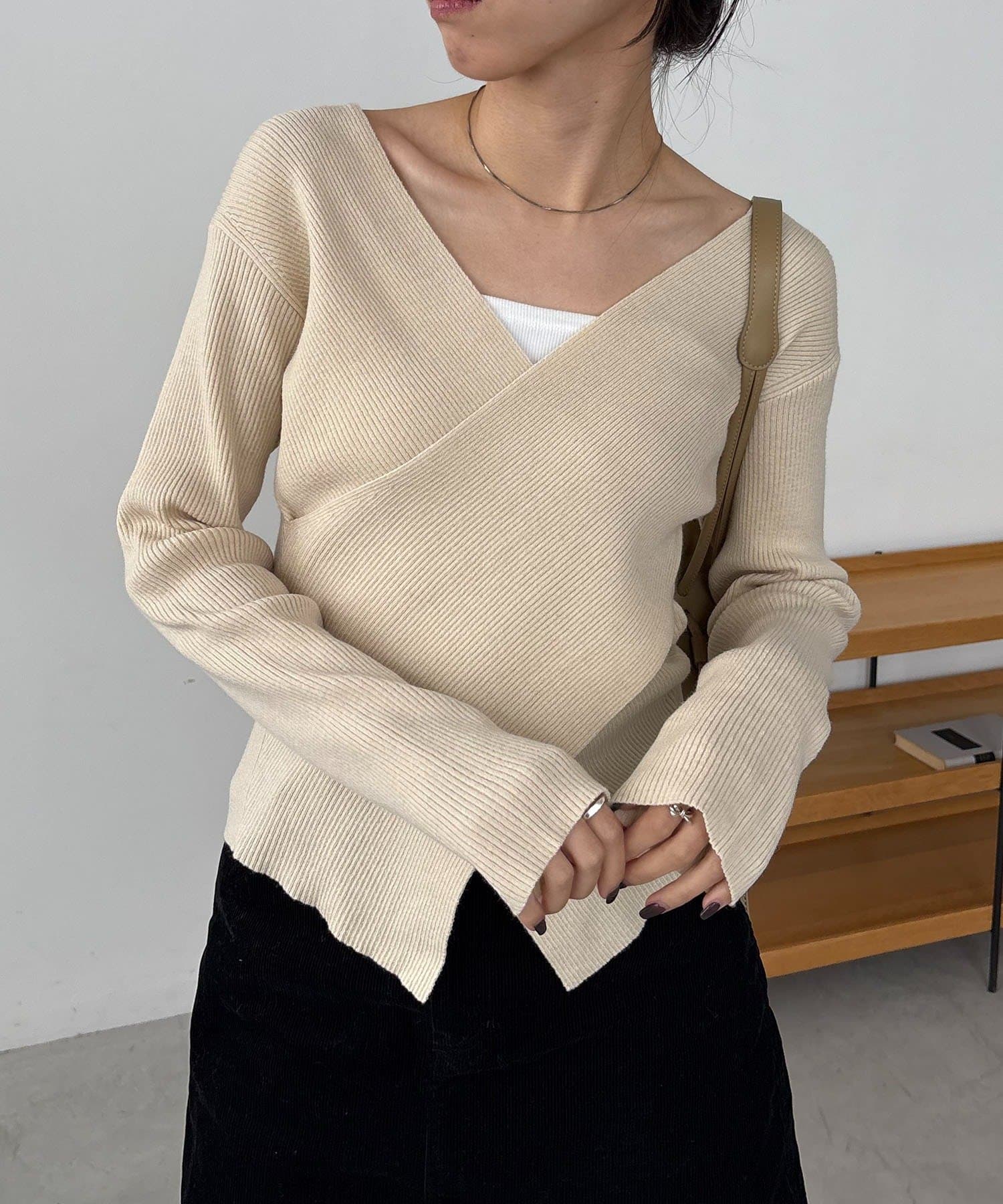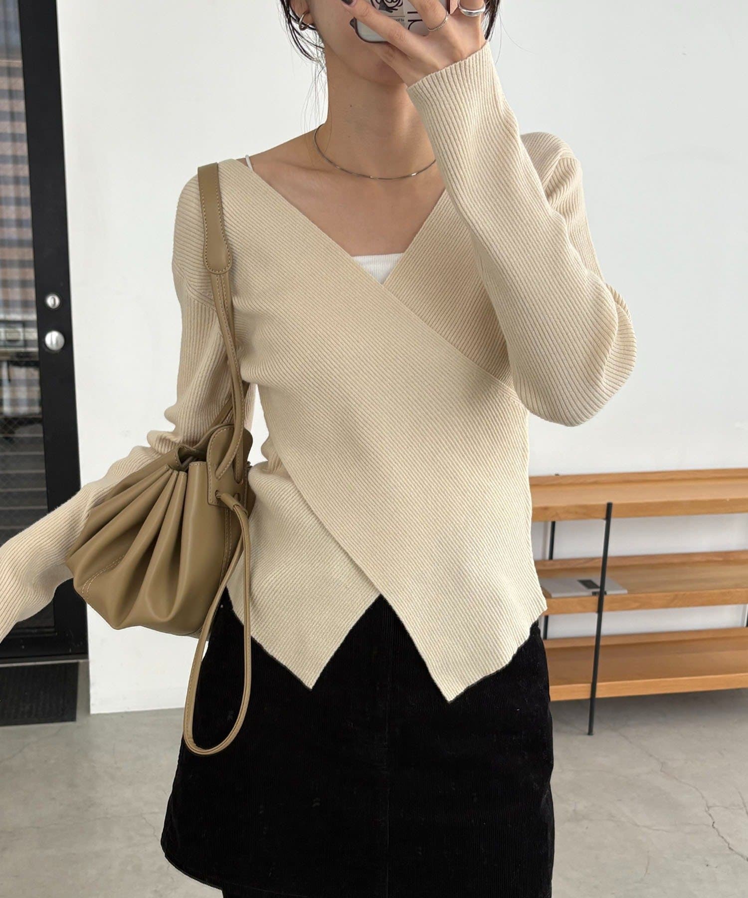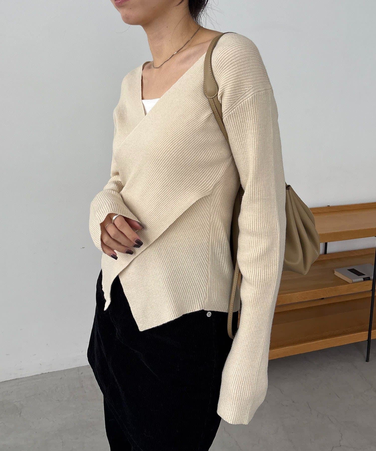【新色/ライトベージュ・グレー】クロスVネックニット