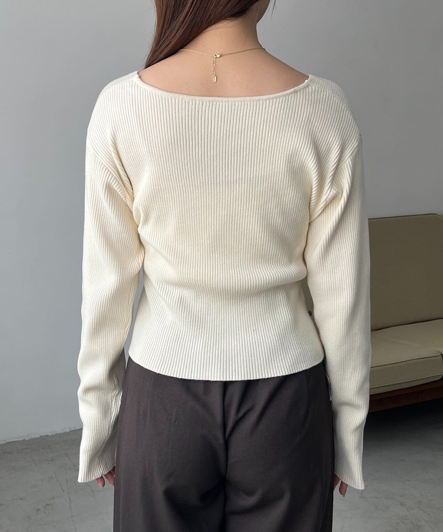 ・深めに開いたVネックが女性らしく大人な印象に